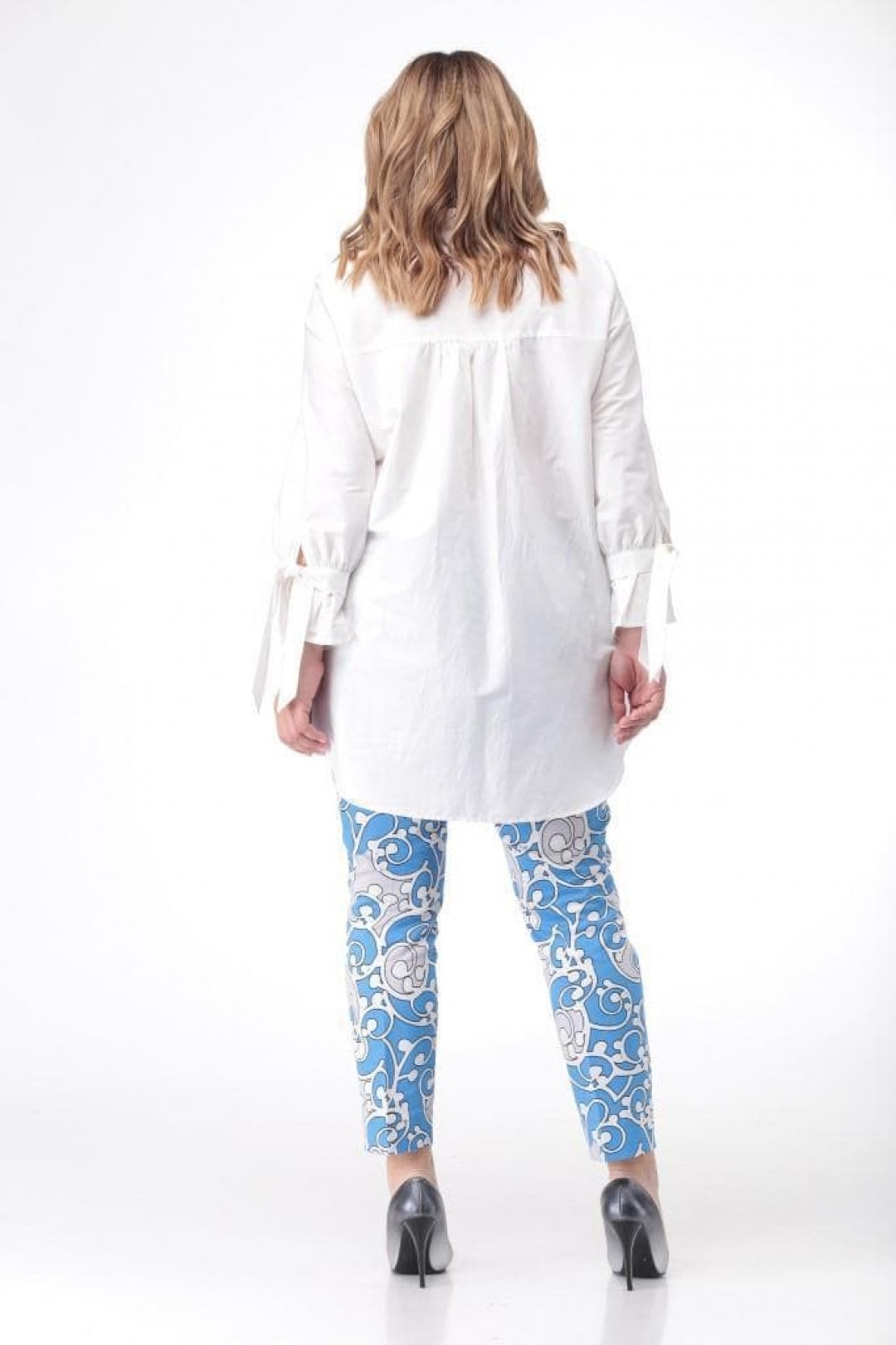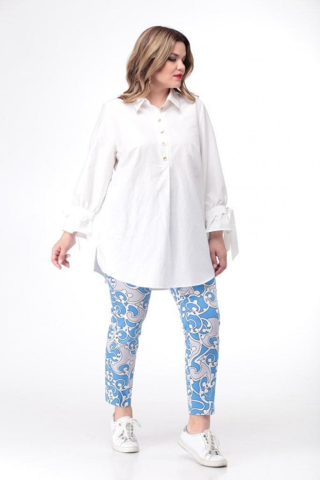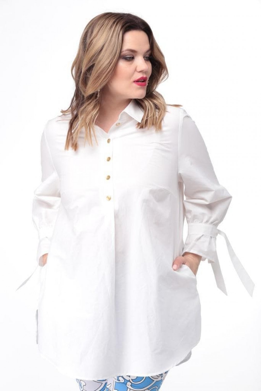 Блуза женская А силуэта. Перед с нагрудными выточками. По центру переда планка на 5 прорезных петель и пуговиц. Планка до талии. Внизу планки заложена односторонняя складка. Спинка на кокетке. Нижняя часть спинки с легкой сборкой. Воротник на стойке отложной. Рукав втачной 7/8. Низ рукава присобран на хлястик. В боковых швах разрезы и действующие карманы.
