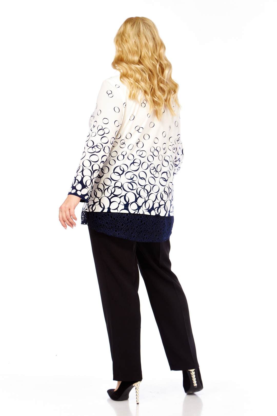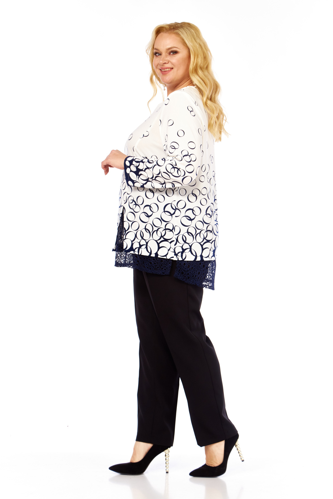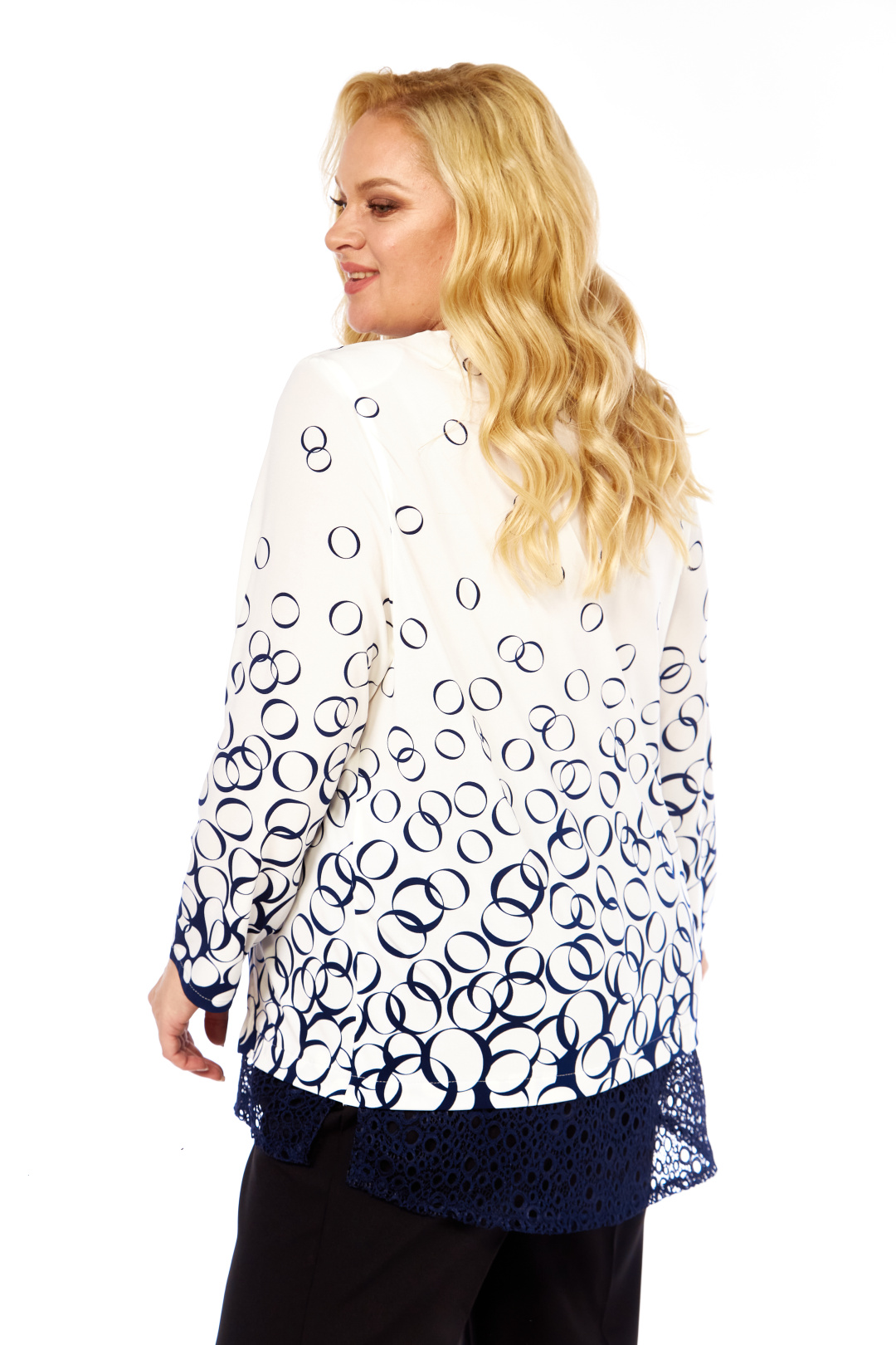 Блузка от «Абби Стиль» с артикулом 4073 и размерами от 54 до 64 в сине-белых тонах с отделкой кружевом — элегантность и комфорт для женщин с пышными формами.
