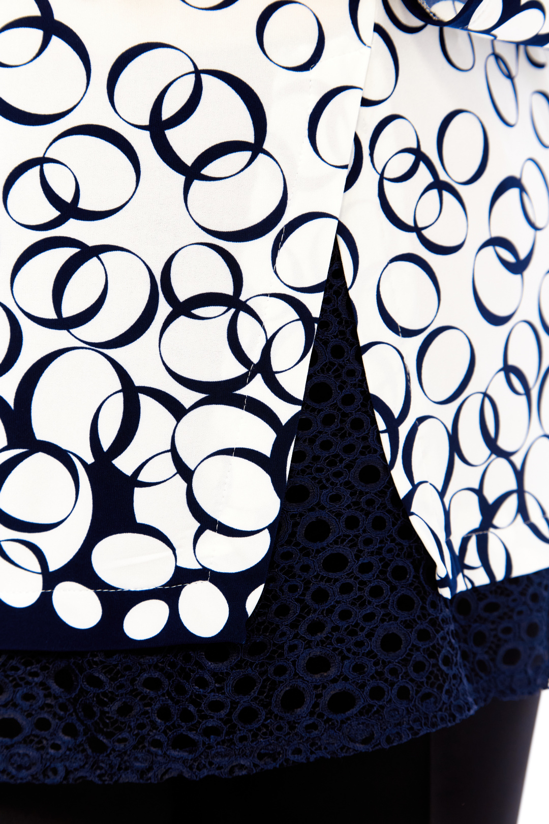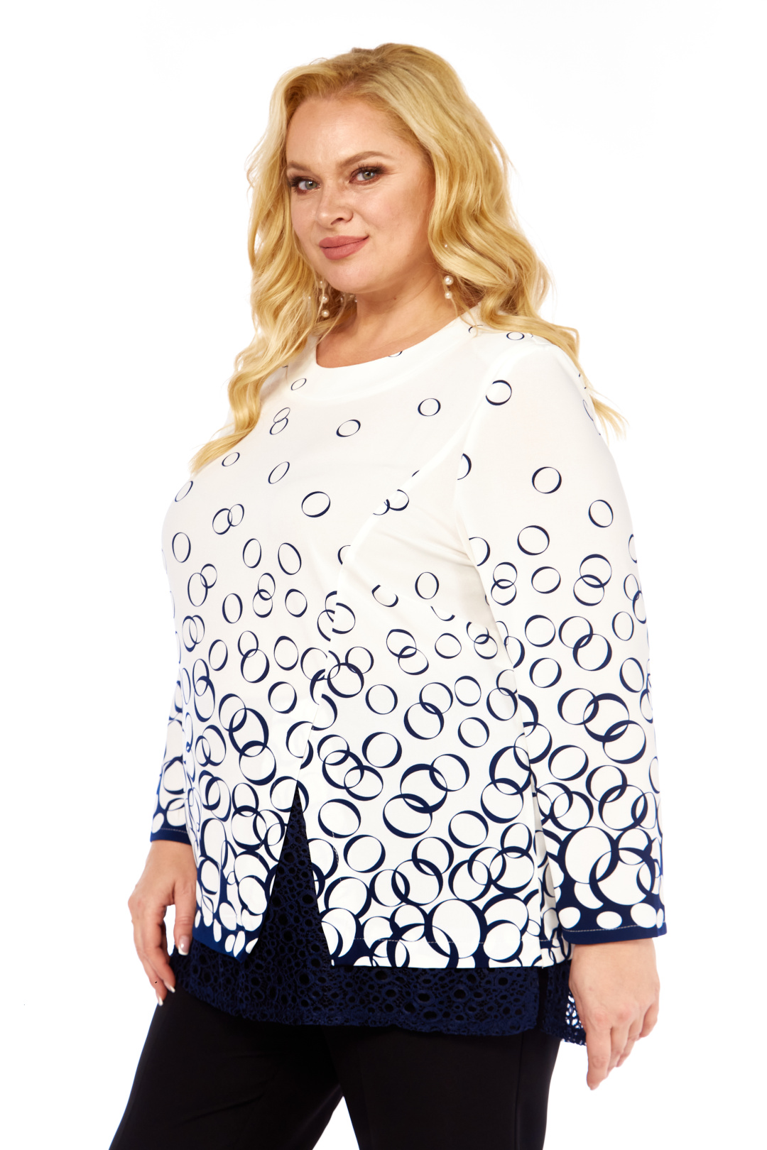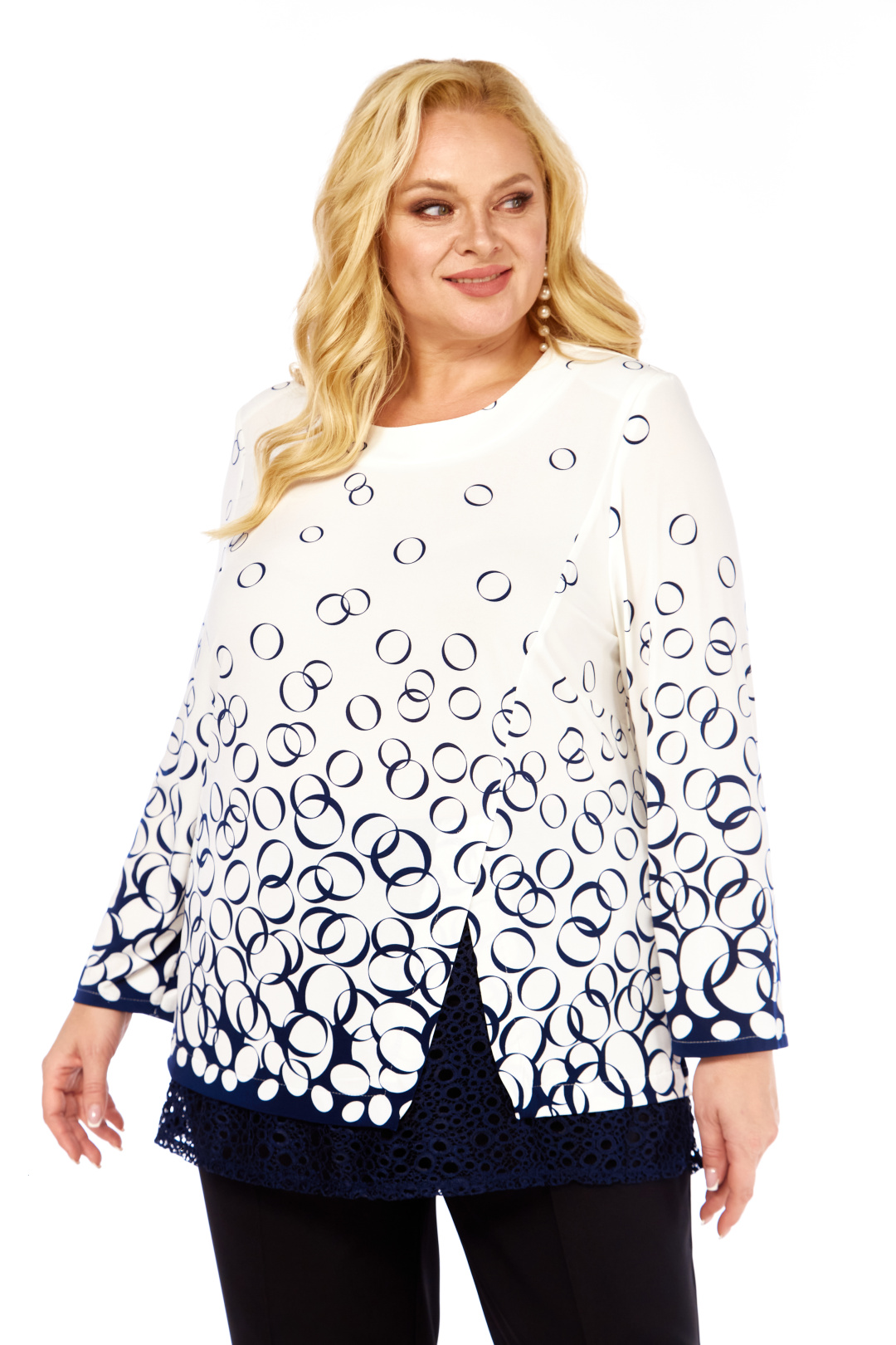 Блузка от «Абби Стиль» с артикулом 4073 и размерами от 54 до 64 в сине-белых тонах с отделкой кружевом — элегантность и комфорт для женщин с пышными формами.