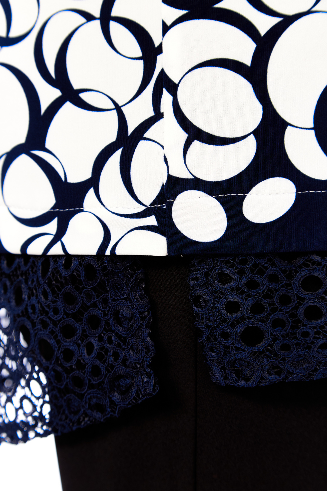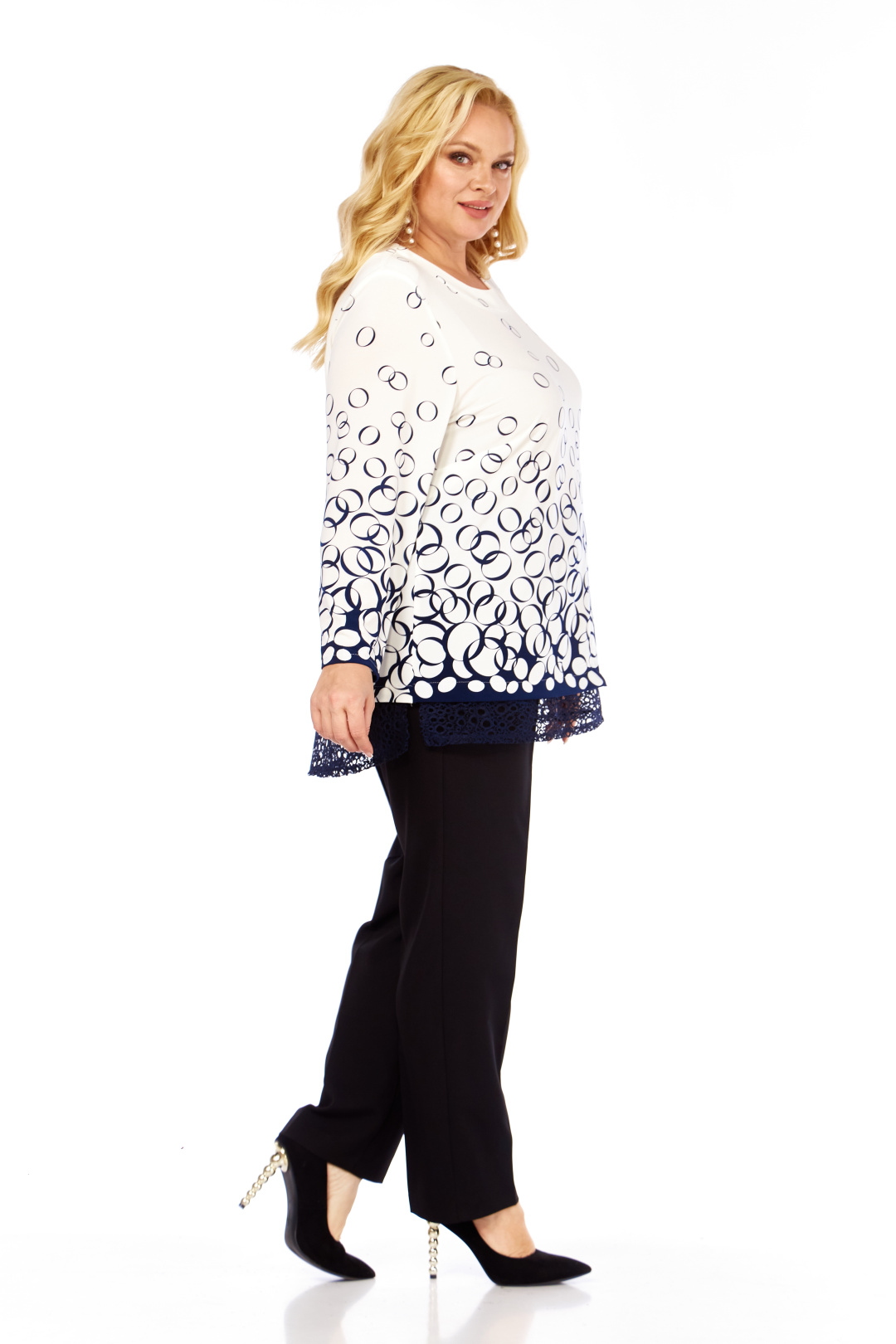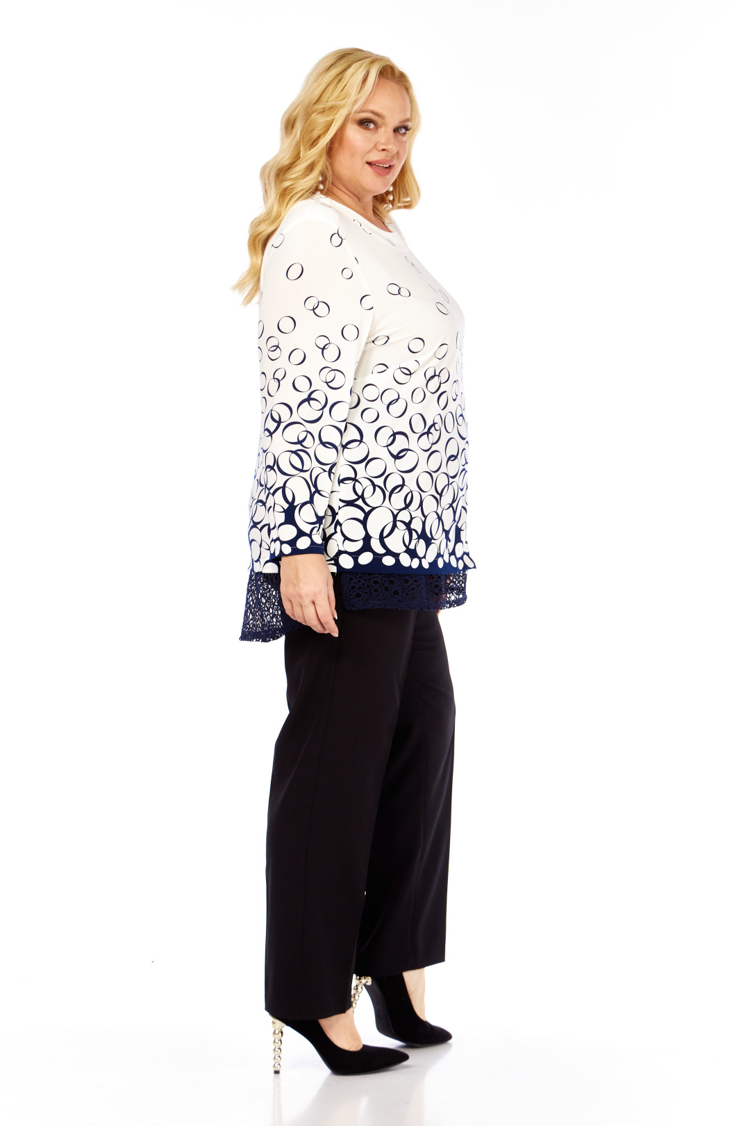 Особое внимание заслуживает нижний край: он оформлен асимметричной кружевной отделкой темно-синего цвета, которая придает изделию романтичности и шика. Благодаря разрезам по бокам, блуза не только выглядит стильно, но и обеспечивает максимальную свободу движений. Силуэт — свободный, объемный, идеально скрывающий недостатки и подчеркивающий достоинства фигуры.