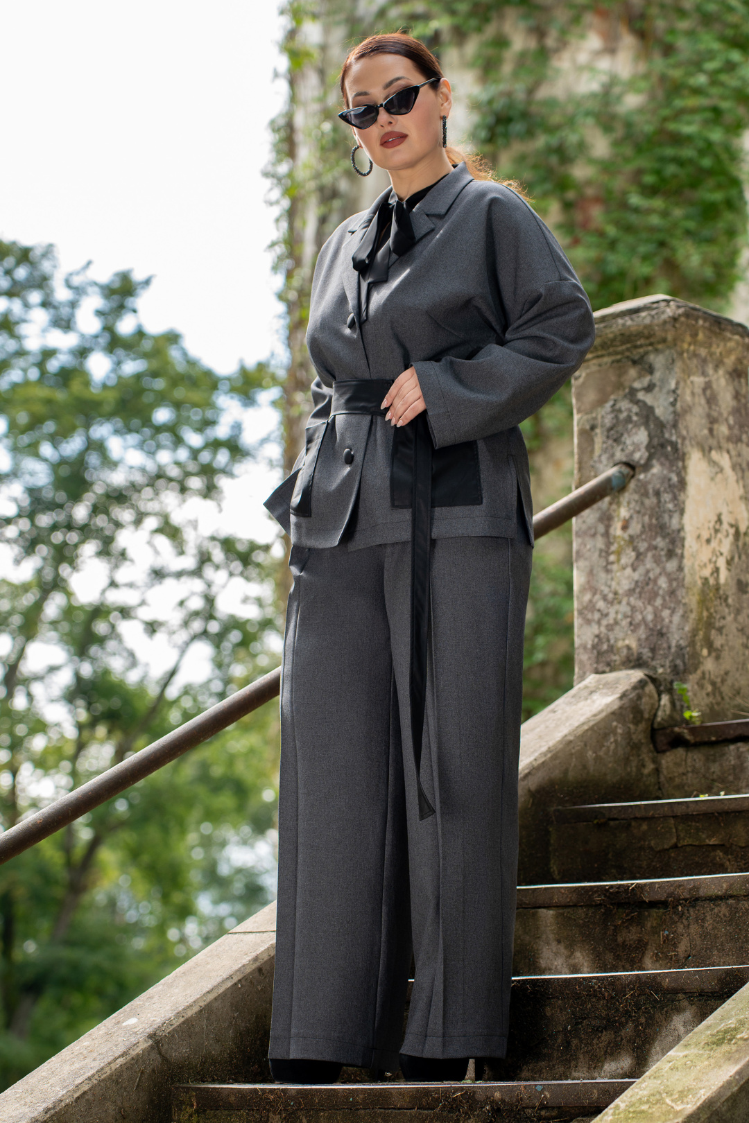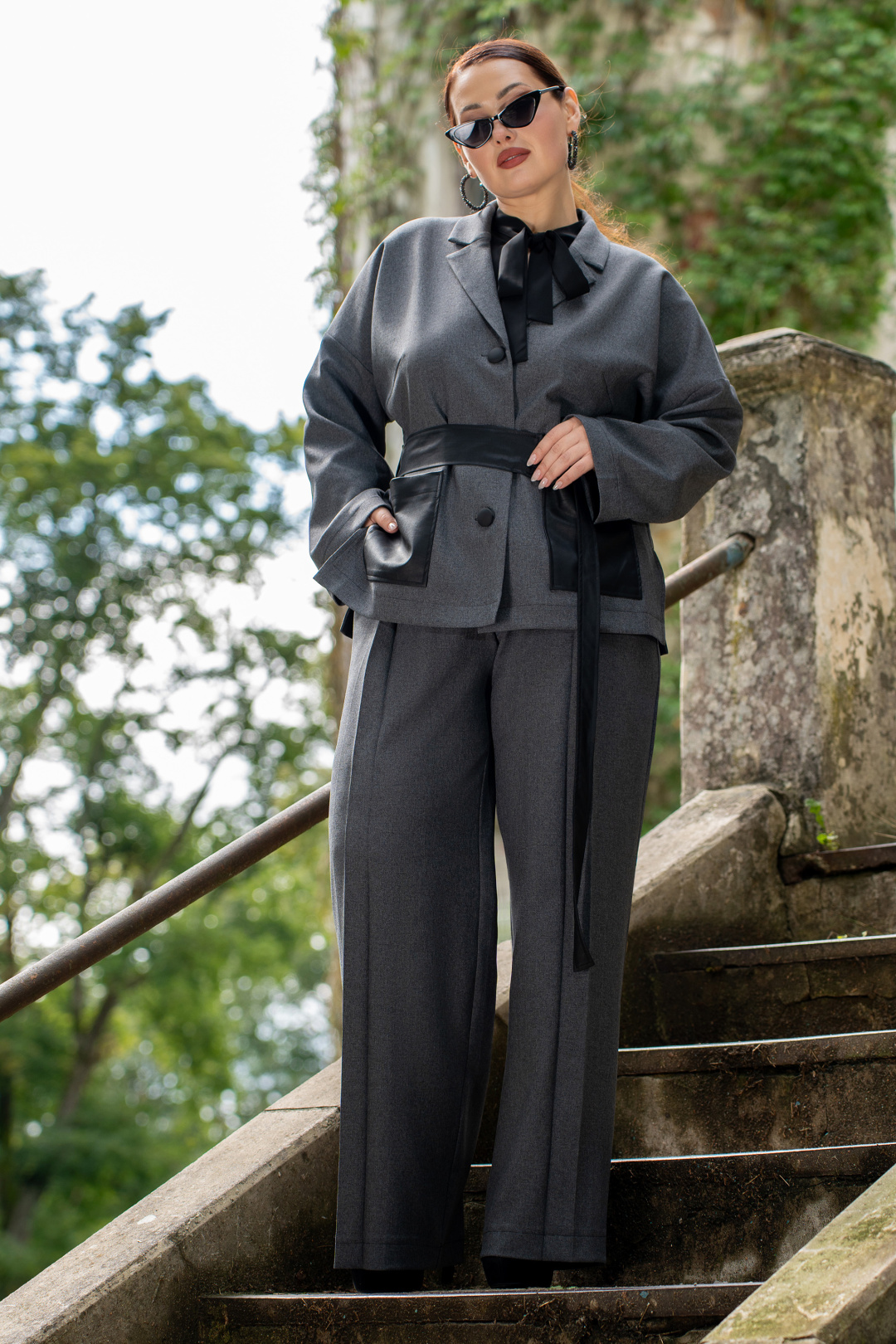 Жакет прямого кроя со съёмным поясом,воротник пиджачного типа. Жакет с центральной бортовой застёжкой на три петли и три пуговицы. На полочках обработаны накладные карманы из экокожи. По боковым швам обработаны разрезы и шлёвки под съёмный пояс из экокожи.