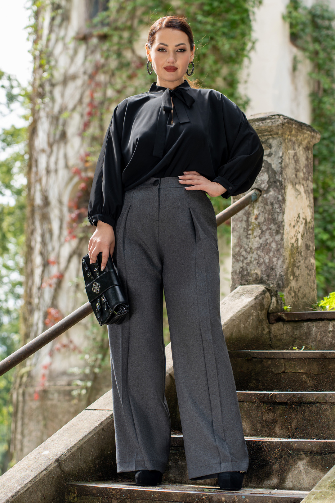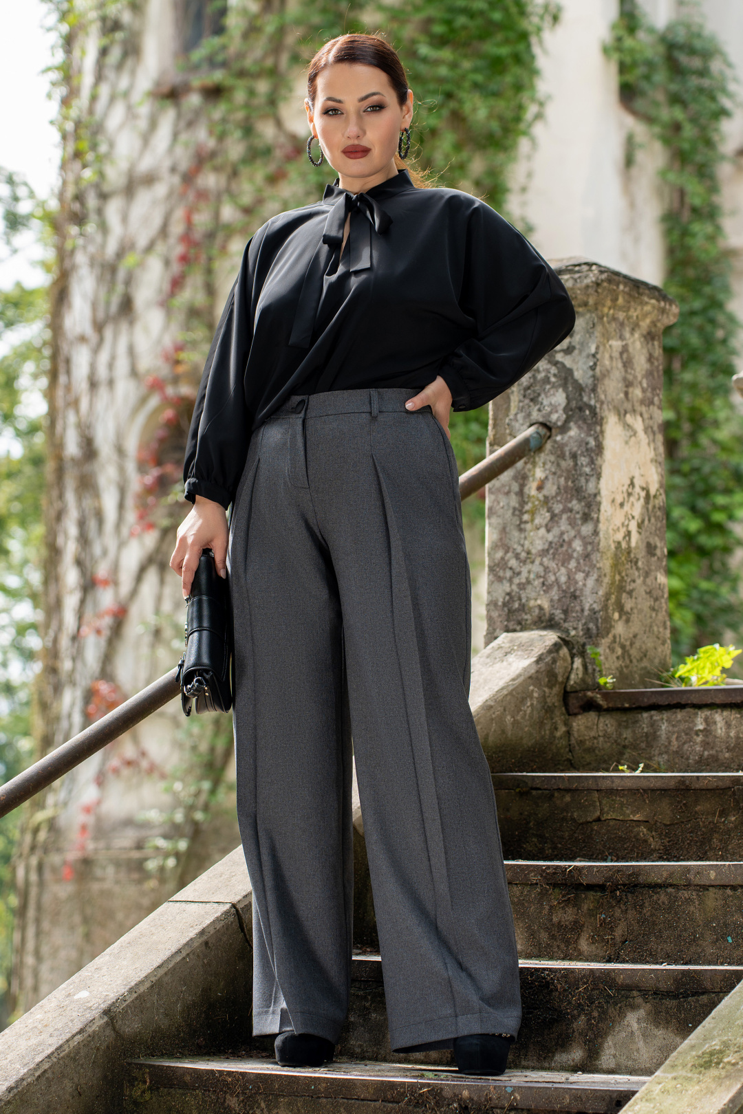 Брюки женские прямого силуэта, современная класическа, по переду пояс со шлёвками, и застёжка на тесьму-молнию и пуговицу, по спинке пояс с эластичной резинкой. Брюки с боковыми наклонными карманами. Брюки со складками по переду.