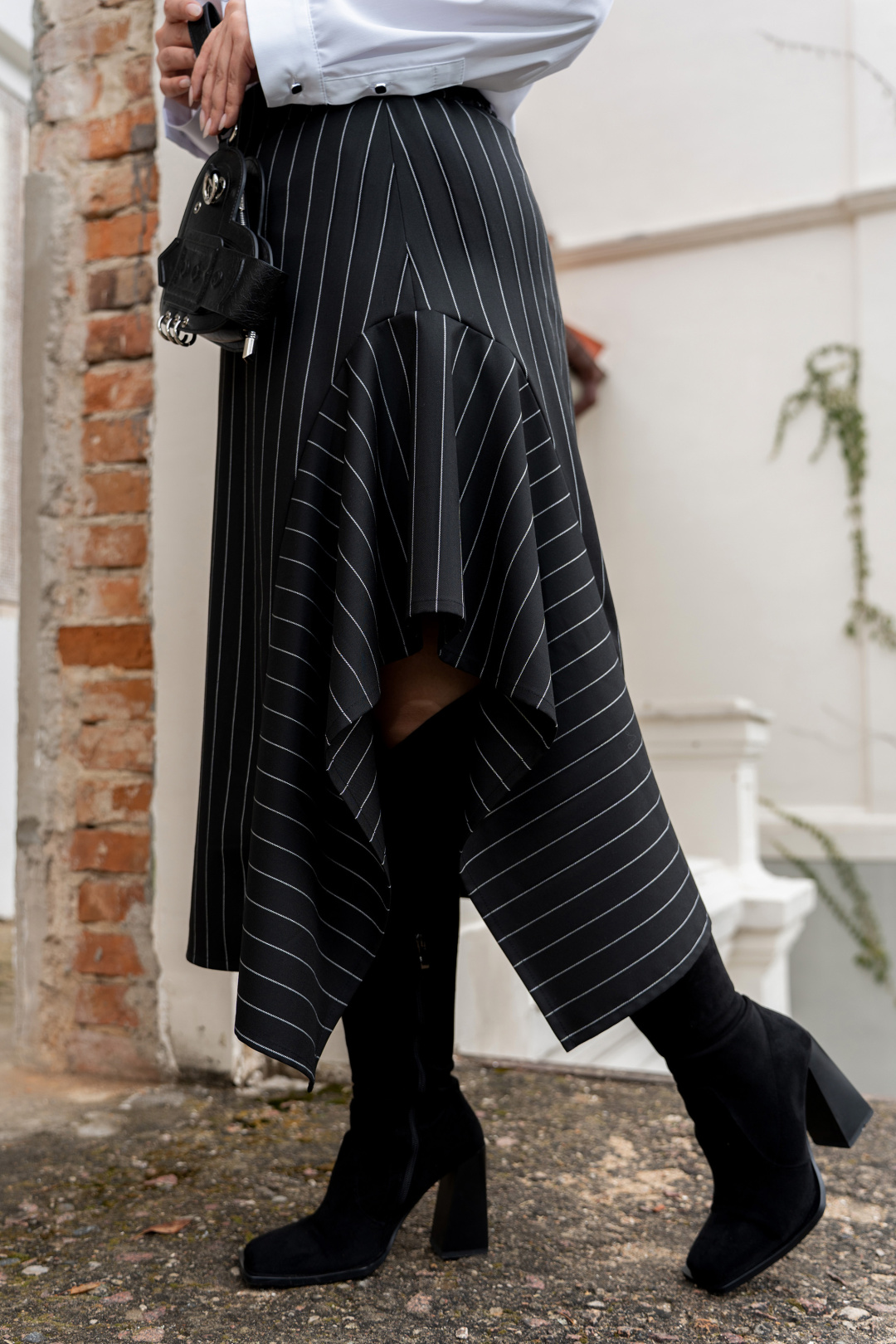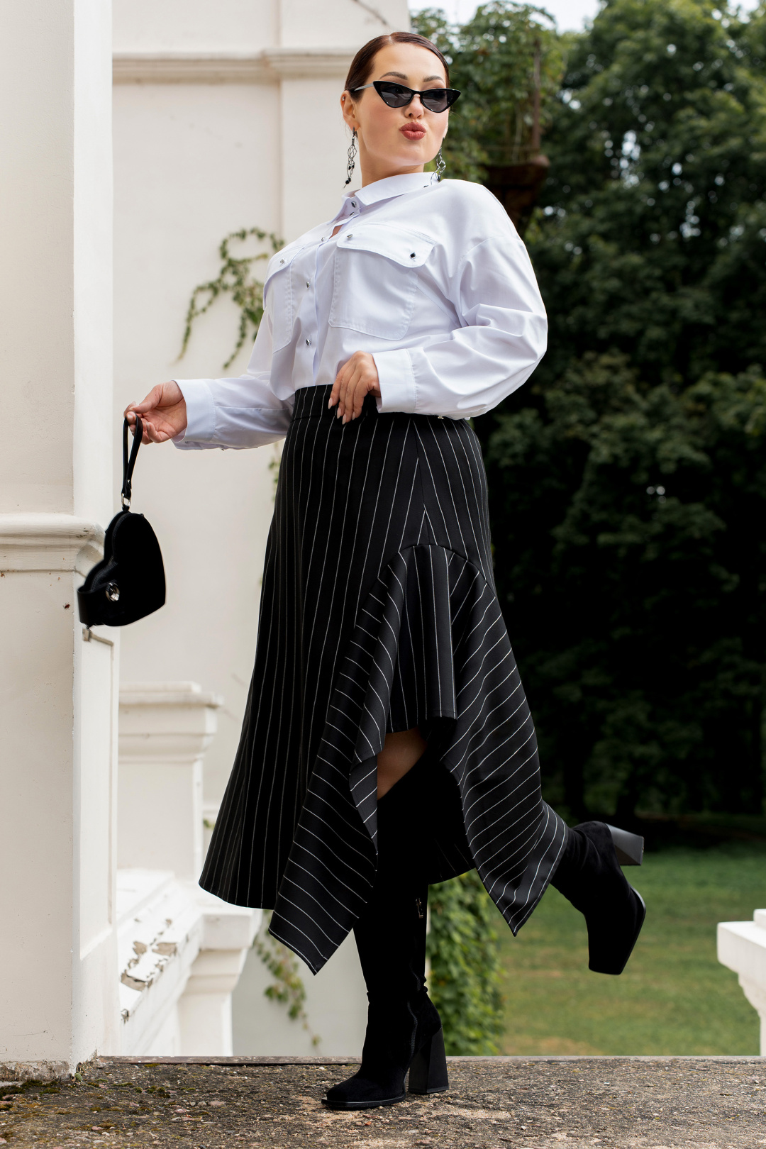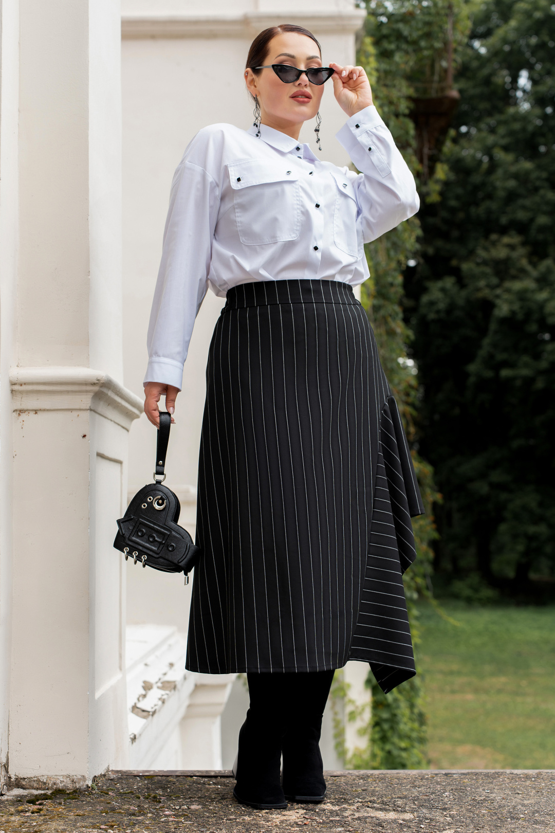 Комплект юбка, рубашка и галстук. Рубашка женская выполнена из хлопоковый ткани, с отложным воротником на стойке, с центральной застёжкой на петли и пуговицы. полочки с нагрудными вытачками с накладными карманами к клапанами, застёгивающиеся на петли и пуговицы, рукава рубашечного кроя, с притачными манжетами, застёгивающиеся на петли и пуговицы. спинка цельная, по бокам обработаны разрезы. Галстук- как добавление к вашему образу дерзости, стиля,изготовлен из экокожи с декоратиными бантиками,регулируестся с помощью застёжки.Юбка женская асиметричного кроя, из классической костюмной полоски, по переду пояс вставка, по спинке пояс с эластичной резинкой.
