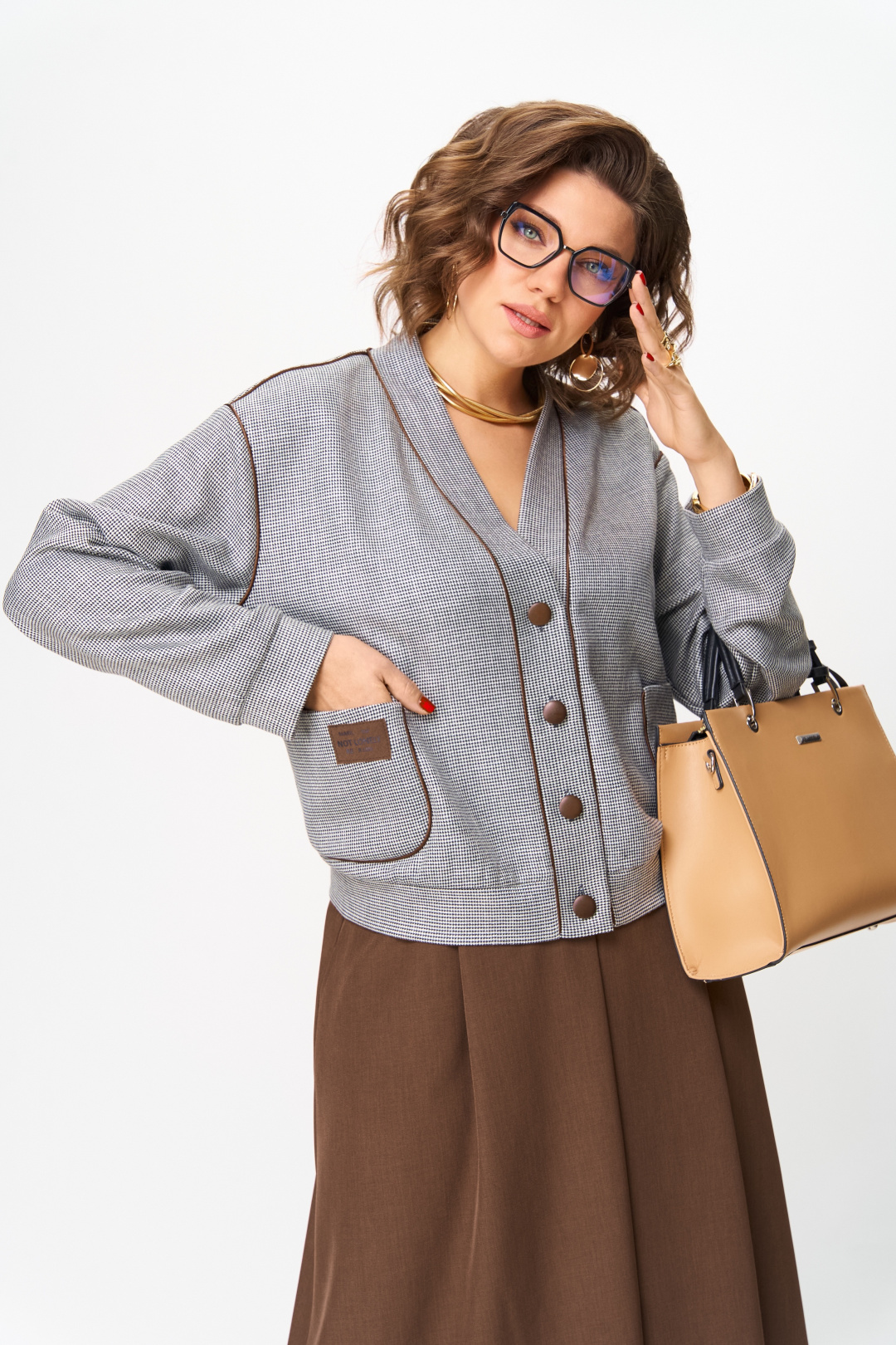 Этот костюм — воплощение интеллектуальной элегантности. Мягкий светло-серый кардиган с коричневыми кантами и крупными пуговицами создаёт образ уютного шарма. V-образный вырез визуально вытягивает шею, а контрастные детали подчёркивают чёткость линий. Рукав на спущенной плойме и манжетой по низу. По перду накладные карманы с декоративной нашивкой. Коричневая юбка миди с глубокими встречными складками и разрезом по переду добавляет образу женственности. В боковых швах карманы. Юбка на подкладке. Для максимально комфортной посадки по бокам пояса вставлена эластичная резинка. Сочетание мягкого верха и строгого низа создаёт баланс между комфортом и аккуратностью, делая комплект универсальным для офиса, повседневных выходов и стильных деловых встреч.