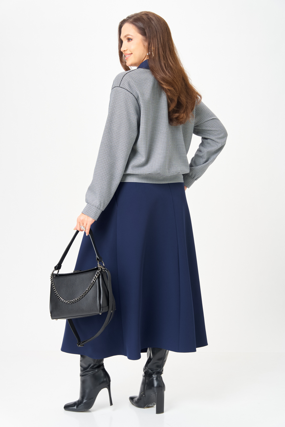 Этот костюм — воплощение интеллектуальной элегантности. Мягкий светло-серый кардиган с коричневыми кантами и крупными пуговицами создаёт образ уютного шарма. V-образный вырез визуально вытягивает шею, а контрастные детали подчёркивают чёткость линий. Рукав на спущенной плойме и манжетой по низу. По перду накладные карманы с декоративной нашивкой. Коричневая юбка миди с глубокими встречными складками и разрезом по переду добавляет образу женственности. В боковых швах карманы. Юбка на подкладке. Для максимально комфортной посадки по бокам пояса вставлена эластичная резинка. Сочетание мягкого верха и строгого низа создаёт баланс между комфортом и аккуратностью, делая комплект универсальным для офиса, повседневных выходов и стильных деловых встреч.