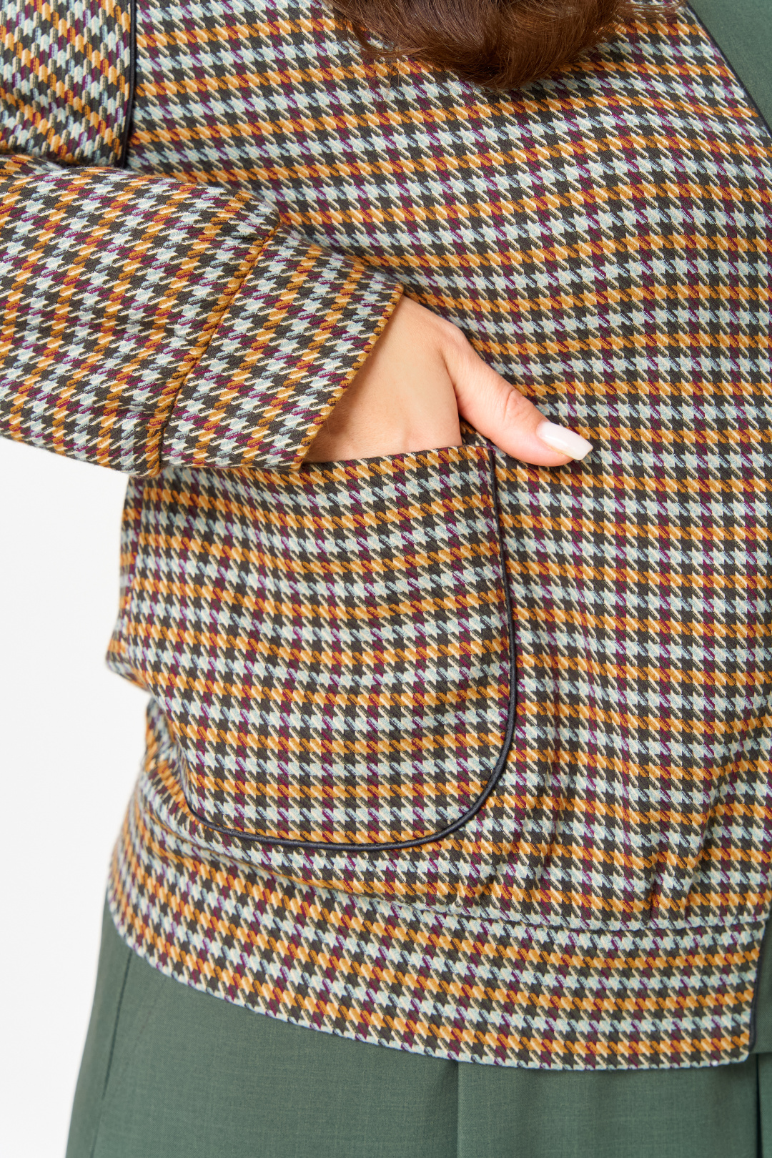 Этот костюм — воплощение интеллектуальной элегантности. Мягкий светло-серый кардиган с коричневыми кантами и крупными пуговицами создаёт образ уютного шарма. V-образный вырез визуально вытягивает шею, а контрастные детали подчёркивают чёткость линий. Рукав на спущенной плойме с манжетой по низу. По перду накладные карманы с декоративной нашивкой. Коричневая юбка миди с глубокими встречными складками и разрезом по переду добавляет образу женственности. В боковых швах карманы. Юбка на подкладке. Для максимально комфортной посадки по бокам пояса вставлена эластичная резинка. Сочетание мягкого верха и строгого низа создаёт баланс между комфортом и аккуратностью, делая комплект универсальным для офиса, повседневных выходов и стильных деловых встреч.