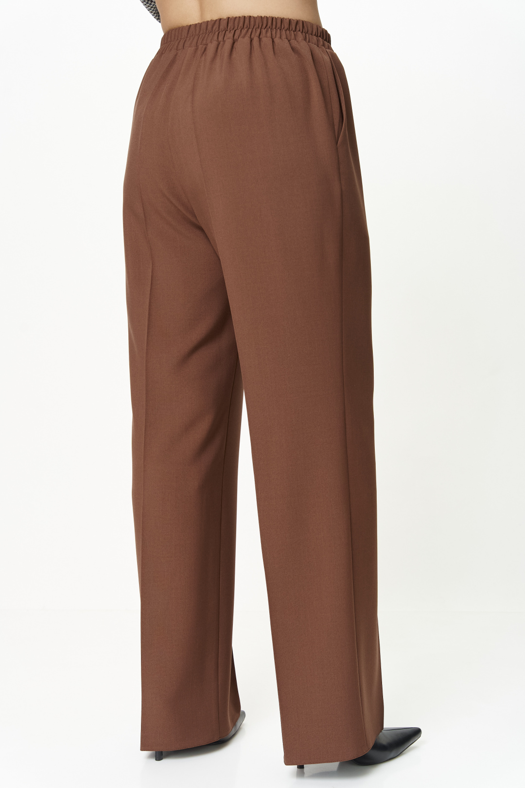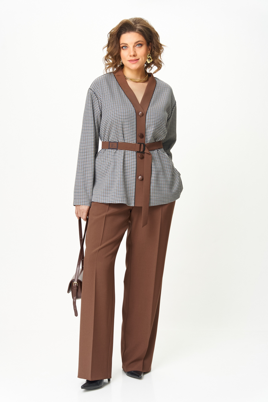 Костюм выделяется классическим узором "гусиная лапка" в сочетании с теплыми коричневыми акцентами, создавая элегантный контраст между графичностью и гладкостью. Кардиган свободнного кроя с глубоким V-образным вырезом и застежкой на крупные четыре пуговицы. Линия плеча спущена. Рукав втачной одношовный, спинка без особенностей. Швы декорированы контрастным черным кантом. Кардиган оснащен интегрированным поясом с пряжкой и нашивкой для регулировки талии, что подчеркивает силуэт. Брюки широкие с мягкими складками по переду и боковыми карманами вблизи боковых швов, подчёркивают лёгкость и свободу движения. Для максимально комфортной посадки по поясу вставлена эластичная резинка по спинке и бокам.