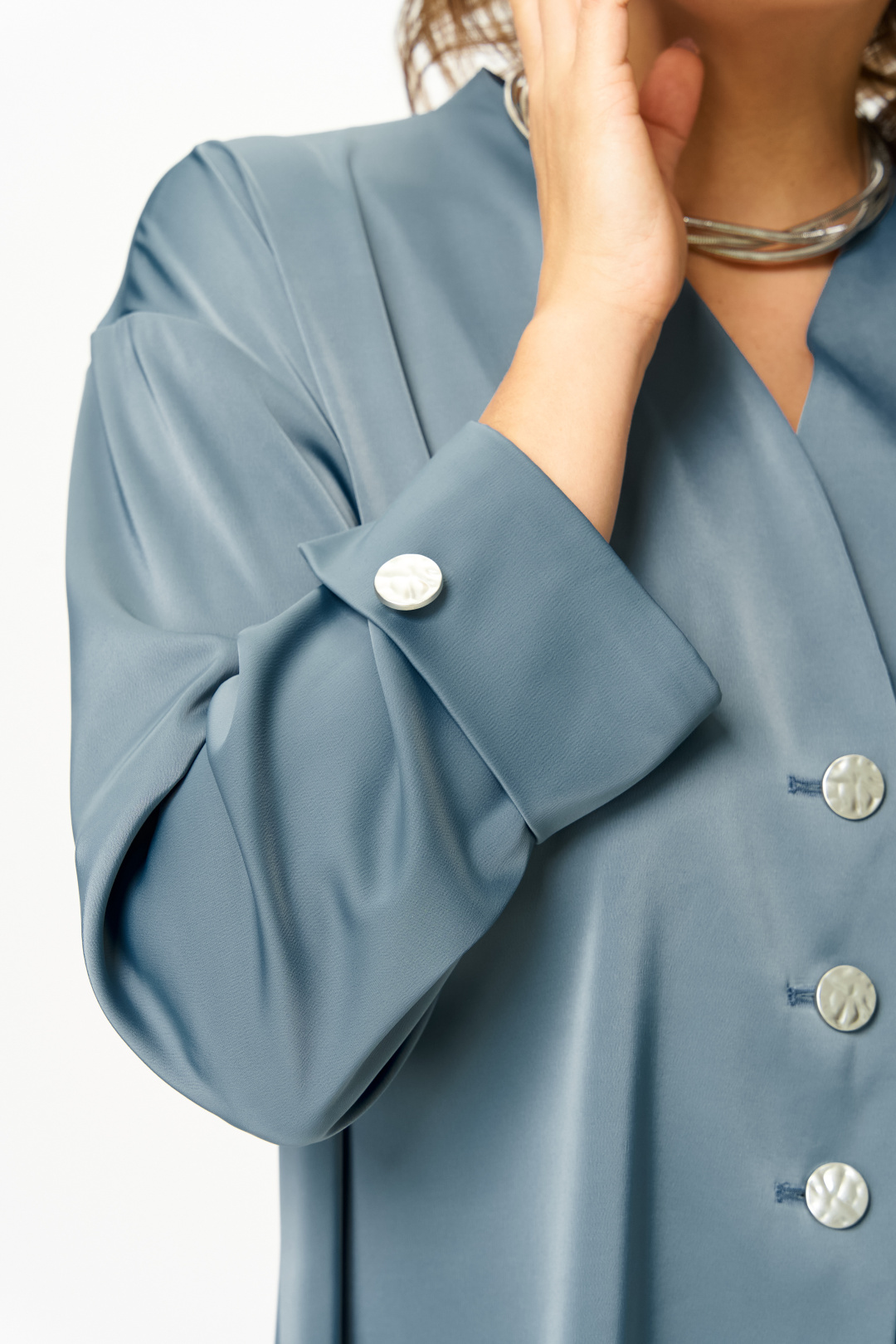 Этот костюм — воплощение сдержанной роскоши и непринуждённой элегантности. Мягкий сатиновый блеск пыльно-голубой ткани создаёт эффект благородства и лёгкости, а свободный силуэт подчёркивает женственность без излишней строгости. Свободный крой с V-образным вырезом, застежка на крупные декоративные пуговицы. Длинные рукава с широкими манжетами обеспечивают элегантную посадку, подчеркивая линию запястья. Ткань струится мягкими складками, создавая драпировку, внутренняя подкладка отсутствует для легкости и естественного движения. Брюки широкие с мягкими складками по переду и боковыми карманами вблизи боковых швов, подчёркивают лёгкость и свободу движения. Для максимально комфортной посадки по поясу вставлена эластичная резинка по спинке и бокам.