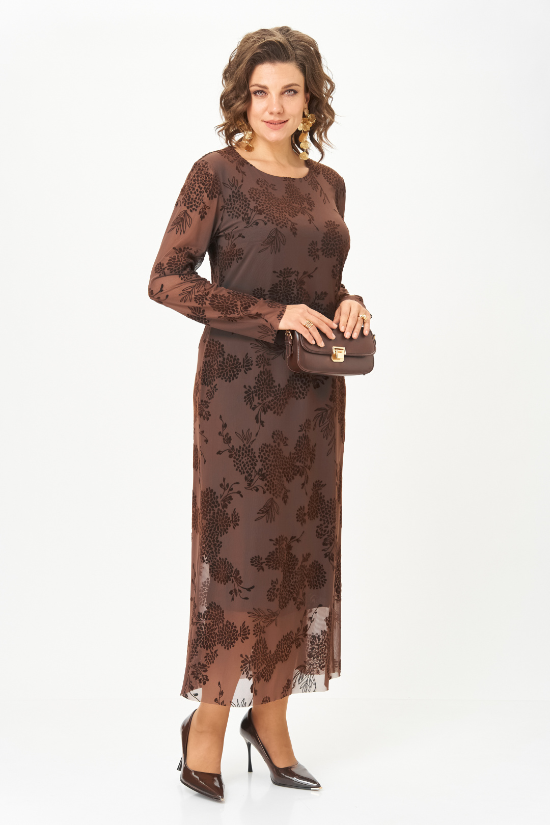 Элегантное макси-платье выполнено из прозрачной сетки коричневого цвета, украшенное изысканным цветочным рисунком, что придает изделию особую роскошь. Длинные рукава и лодочная горловина гармонично смотрятся с легко облегающим силуэтом, подчеркивающим фигуру. Идеальный выбор для создания эффектного вечернего образа, который подчеркнет ваш уникальный вкус.