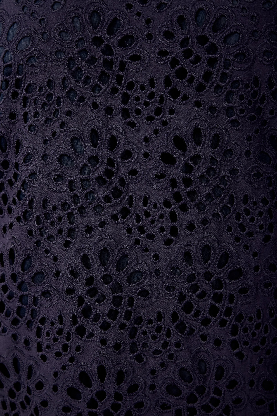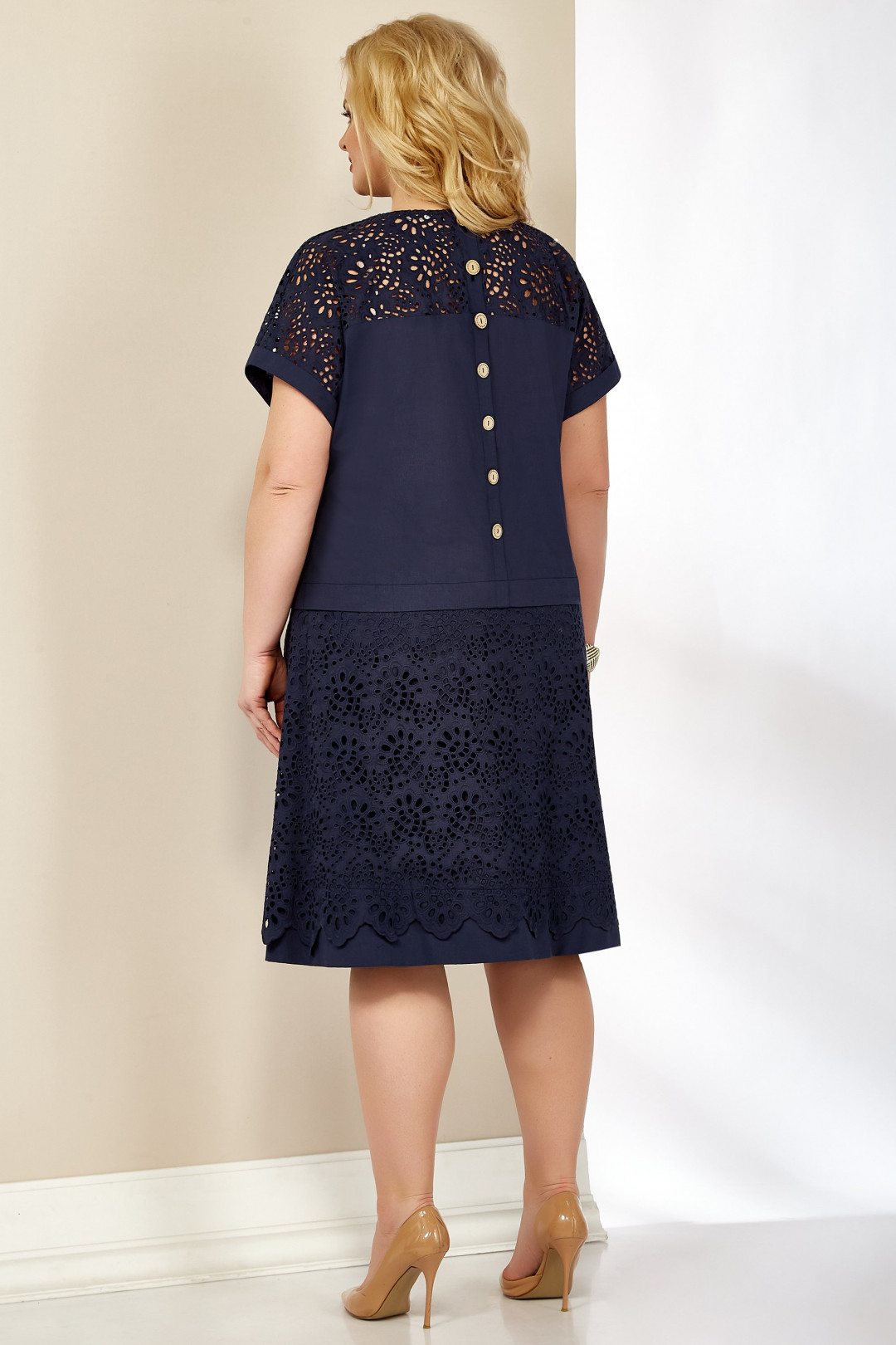 Юбка выполнена из ажурной хлопковой ткани темно синего цвета со вставкой однатон по низу. Застегивается на молнию и пуговицы в боковом шве. По спинке юбка на резинке, по переду действующие карманы .
