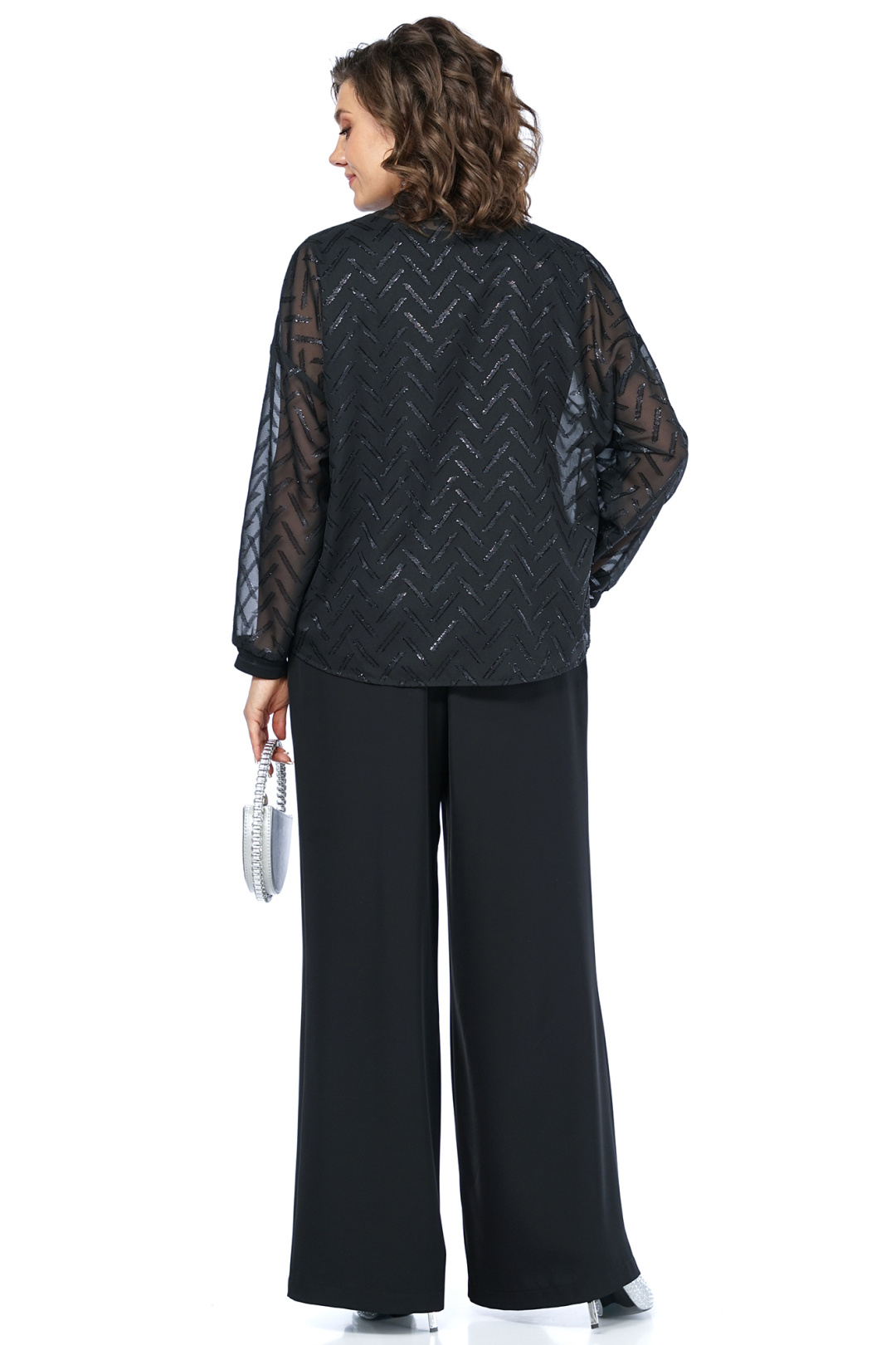 Брюки широкие свободные, прямого силуэта, с притачным поясом с резинкой по боковым. Застёжка по левому боковому на потайную молнию и петлю пуговицу по поясу. Передние части с косыми боковыми карманами, с мягкими бантовыми складками от пояса. Задние части с талевыми выточками