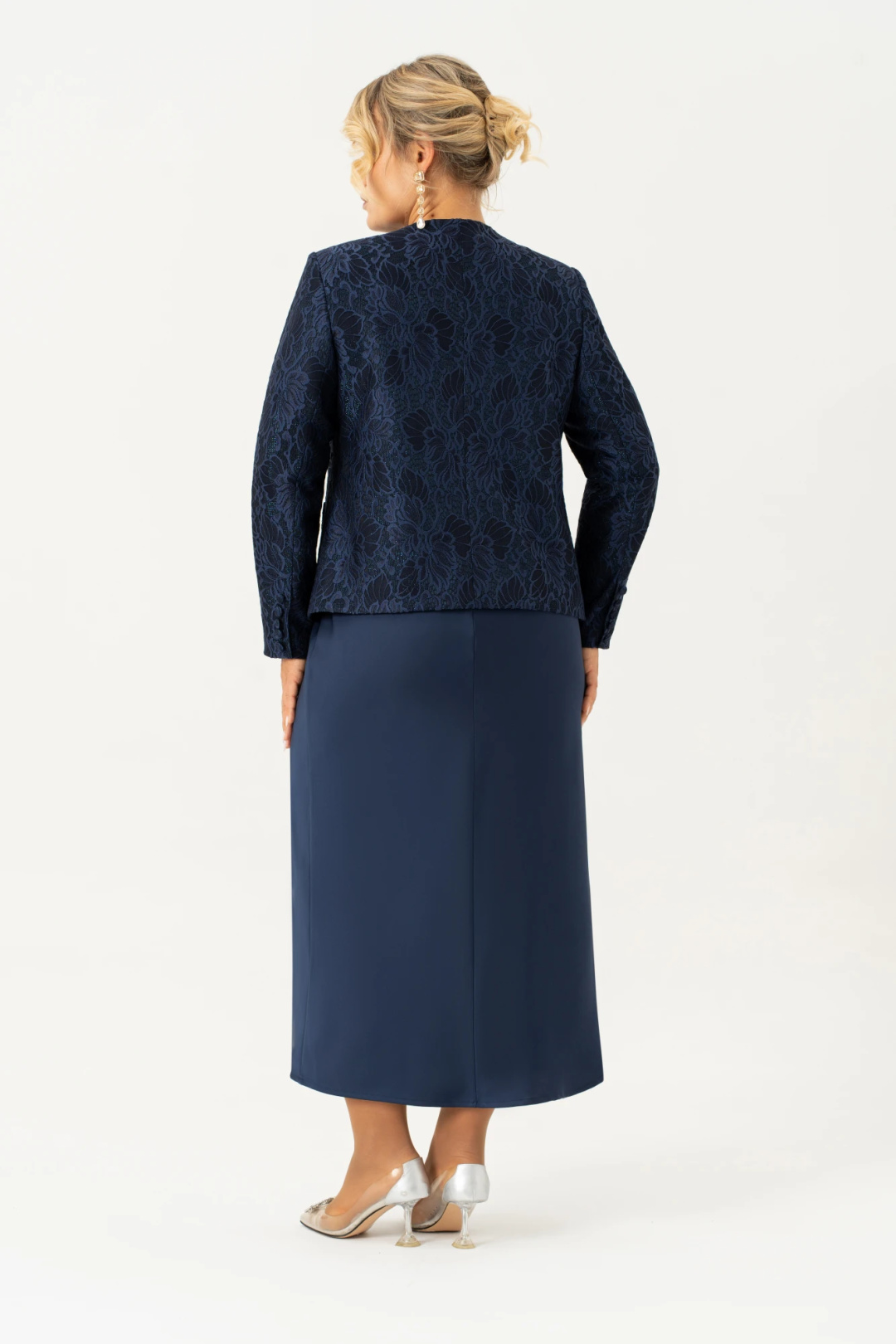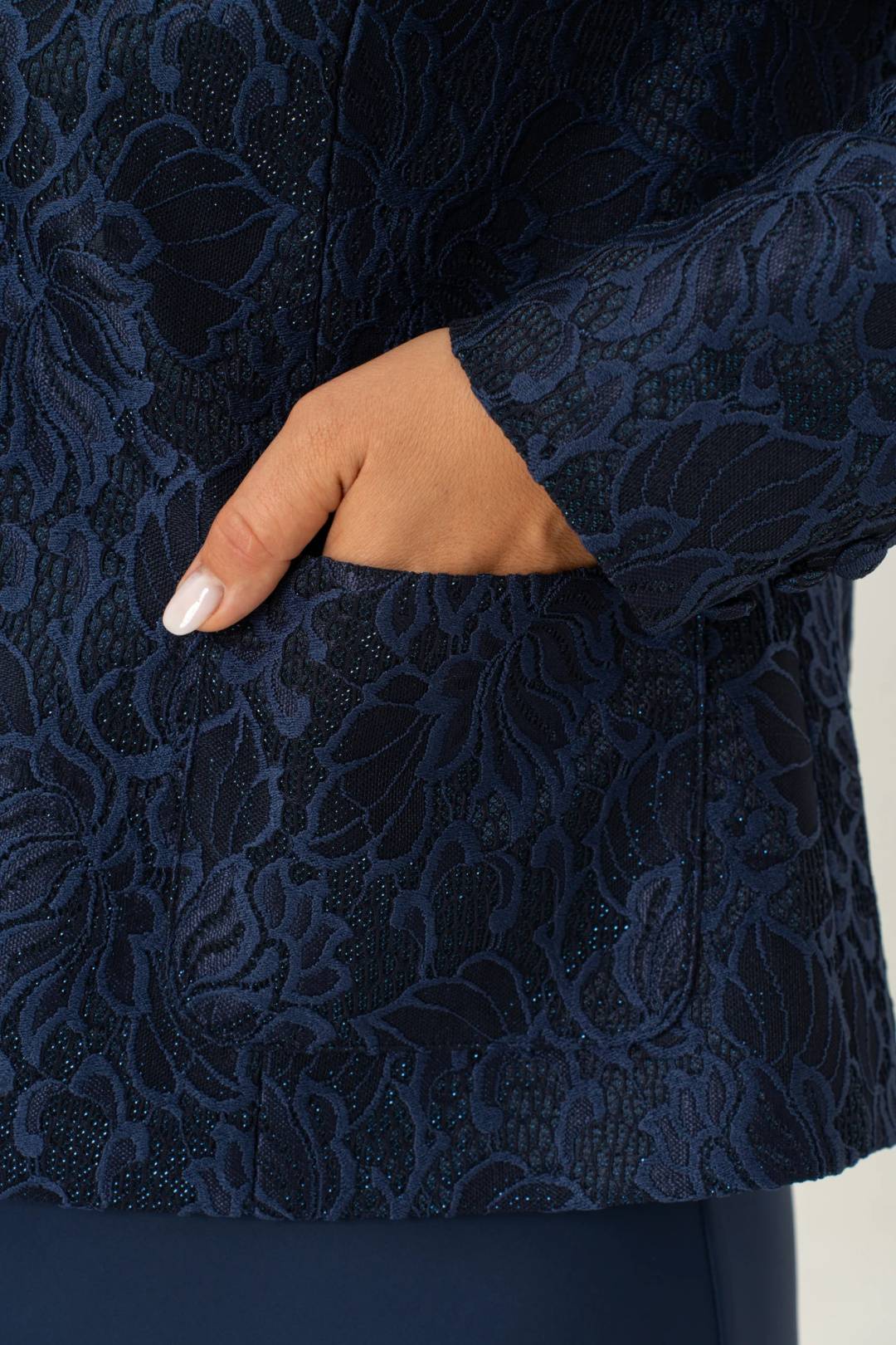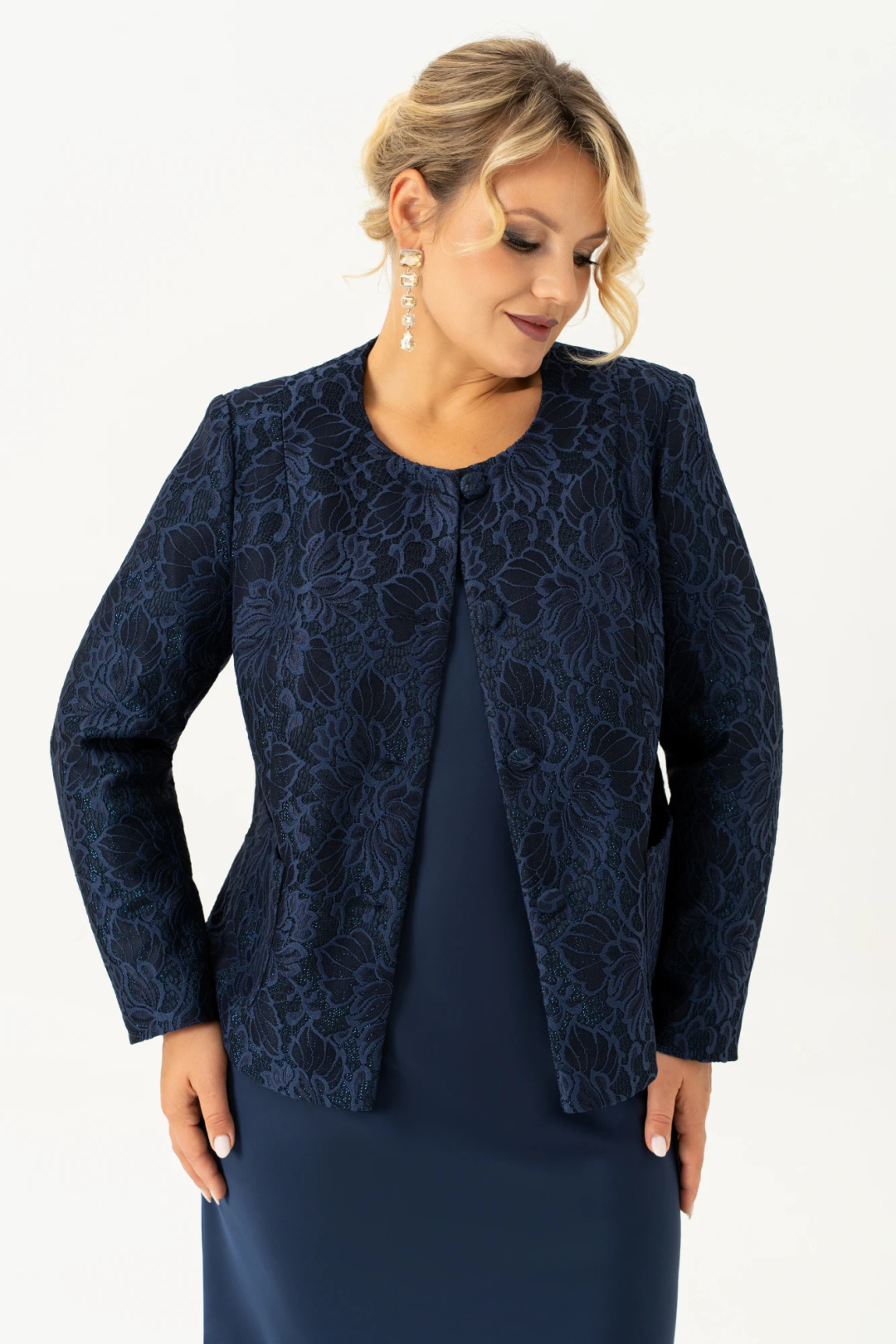 Красивый и стильный жакет из кружевного жаккарда подойдет и для строгого образа, и для создания светлого, яркого и нежного лука с романтичными мотивами. Жакет короткий, полуприлегающего силуэта на подкладке. Спинка со средним швом. По переду жакета есть рельефные швы от плеча. Застёжка на петли и пуговицы. Рукав втачной , длинный, двухшовный. Горловина круглая, смотрится очень актуально и эффектно в сочетании с накладными карманами. Этот жакет подойдет и к брюкам и к платью, что позволяет создать много шикарных образов. Выбор этого стильного жакета станет замечательным дополнением вашего гардероба для особых случаев, обеспечивая Вам стиль и комфорт.