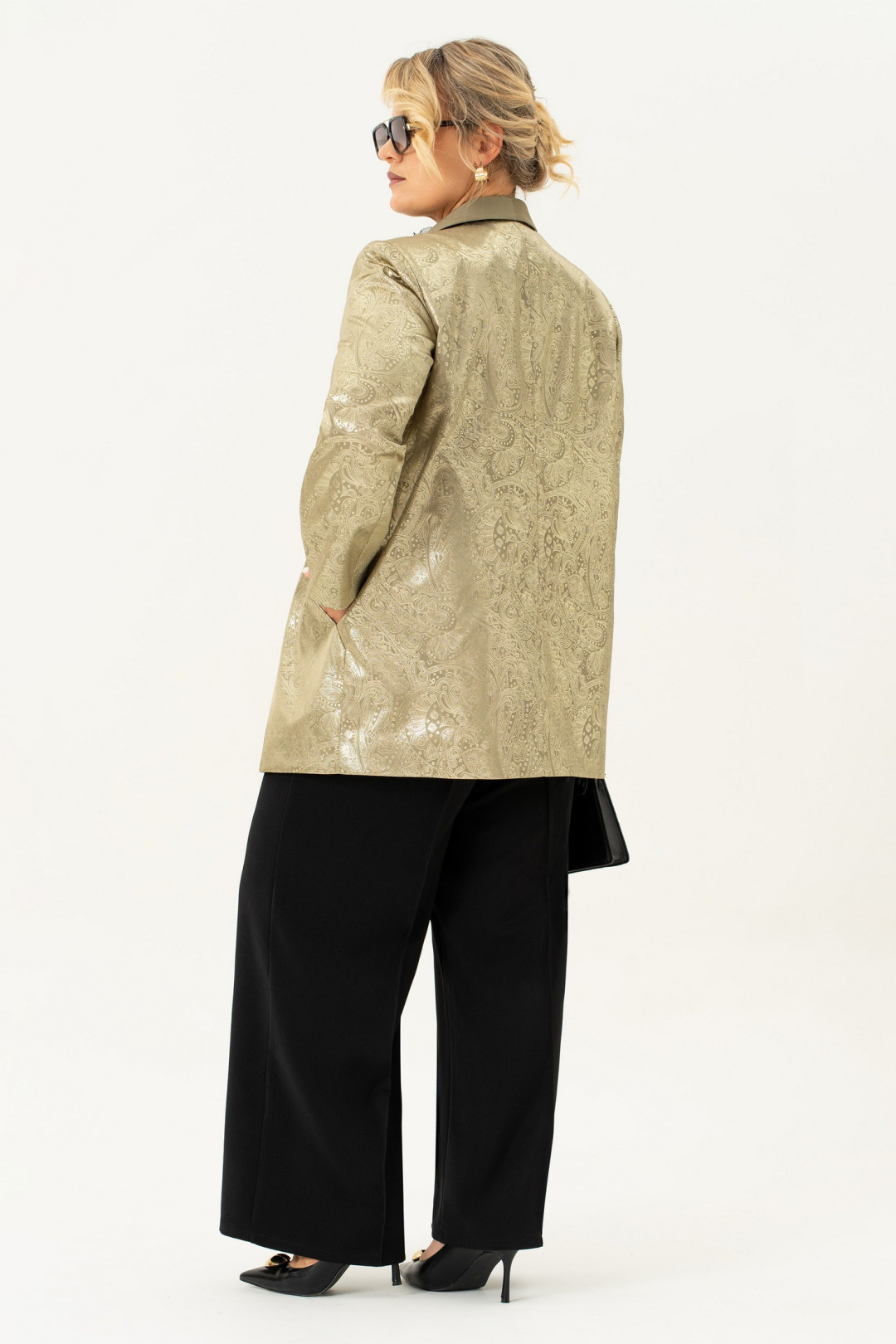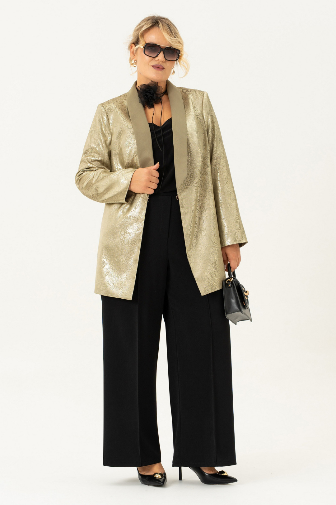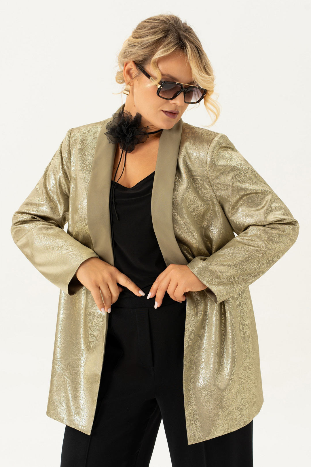 Этот женский нарядный жакет представлен в ярких тонах. Благодаря своему прямому, слегка приталенному силуэту, жакет обеспечивает максимальный комфорт и удобство при ношении. Вам не придется беспокоиться о чувстве стеснения или дискомфорта, так как он идеально подстраивается под вашу фигуру. Этот нарядный пиджак гарантированно привлечет внимание и подчеркнет вашу индивидуальность. Он доступен в больших размерах и подходит для женщин с разными типами фигуры. Вы сможете выглядеть модно и элегантно независимо от своего размера. На жакете обработан воротник шалька и карманы в фигурных рельефах. Жакет на подкладке с длинным рукавом. Застежка на декоративный крючок. Длина изделия (см):80Длина рукава (см):62