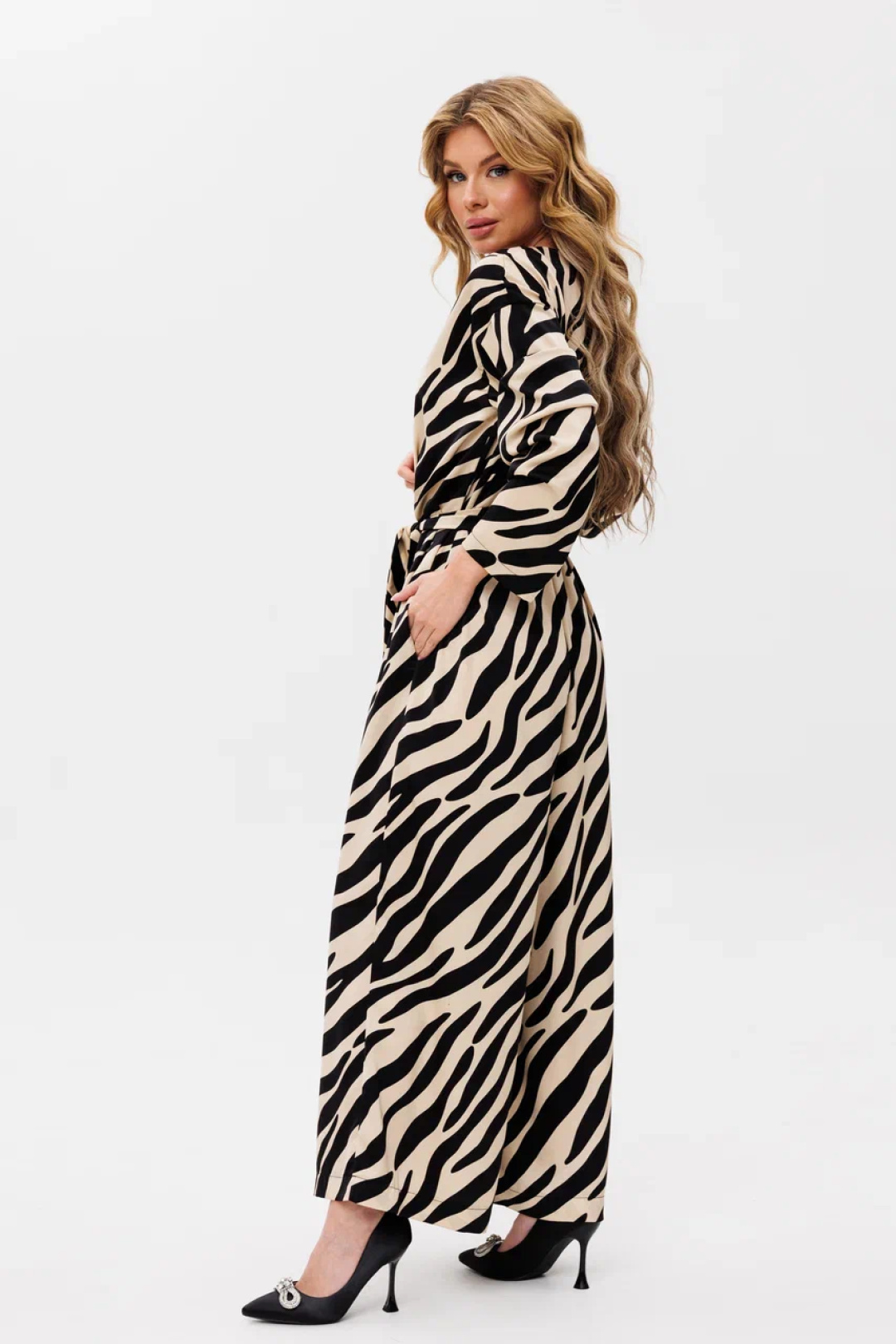 Комбинезон свободного силуэта со спущенным плечом и застежкой на потайную тесьму молнию с переди.Вырез горловины круглый. Рукав втачной длинный.В боковых швах действующие карманы.Пояс из основной ткани в комплекте.