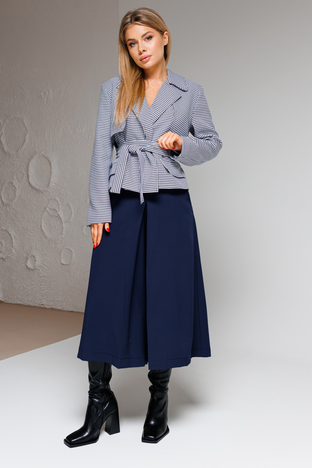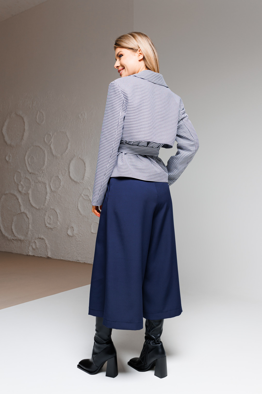 Жакет прямого силуэта,с воротником пиджачного типа.По переду и спинке отлетные кокетки.По переду в области талии декоративные клапаны.Жакет на подкладке с поясом.Застежка на пришивные кнопки. Юбка-брюки А-СИЛУЭТА С ЗАСТЕЖКОЙ НА ПОТАЙНУЮ ТЕСЬМУ МОЛНИЮ С ПРИТАЧНЫМ ПОЯСОМ И КАРМАНАМИ СПЕРЕДИ. ПО ПЕРЕДУ ВСТРЕЧНАЯ СКЛАДКА.
