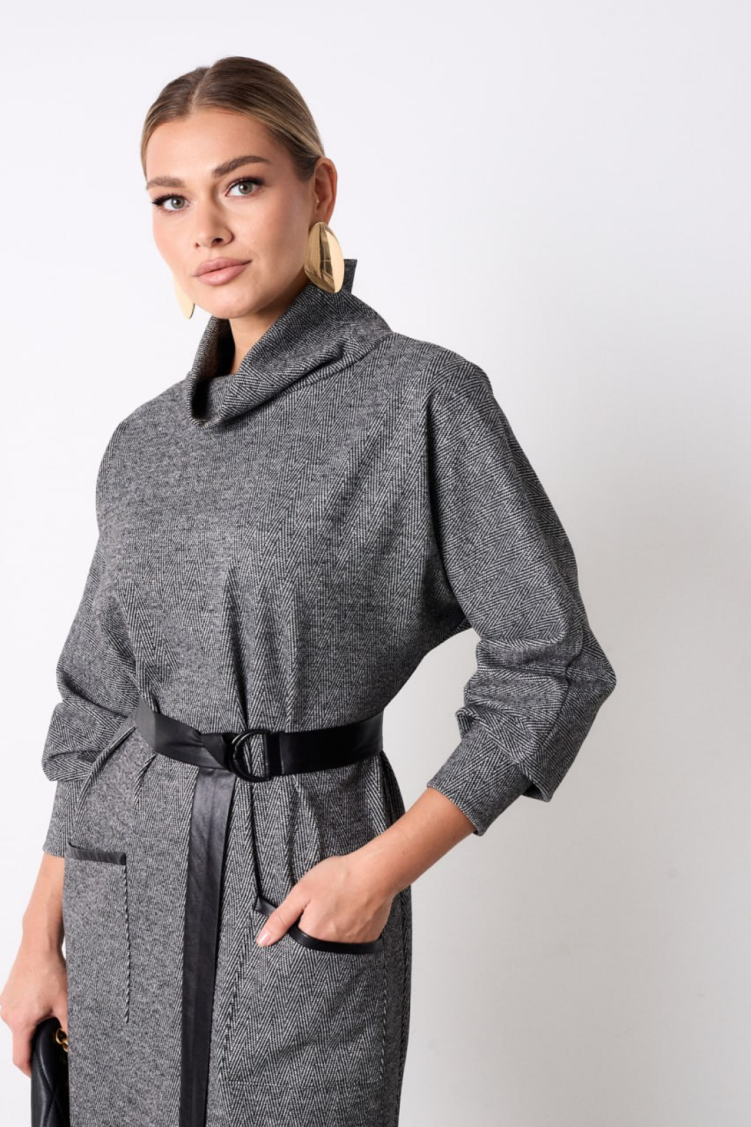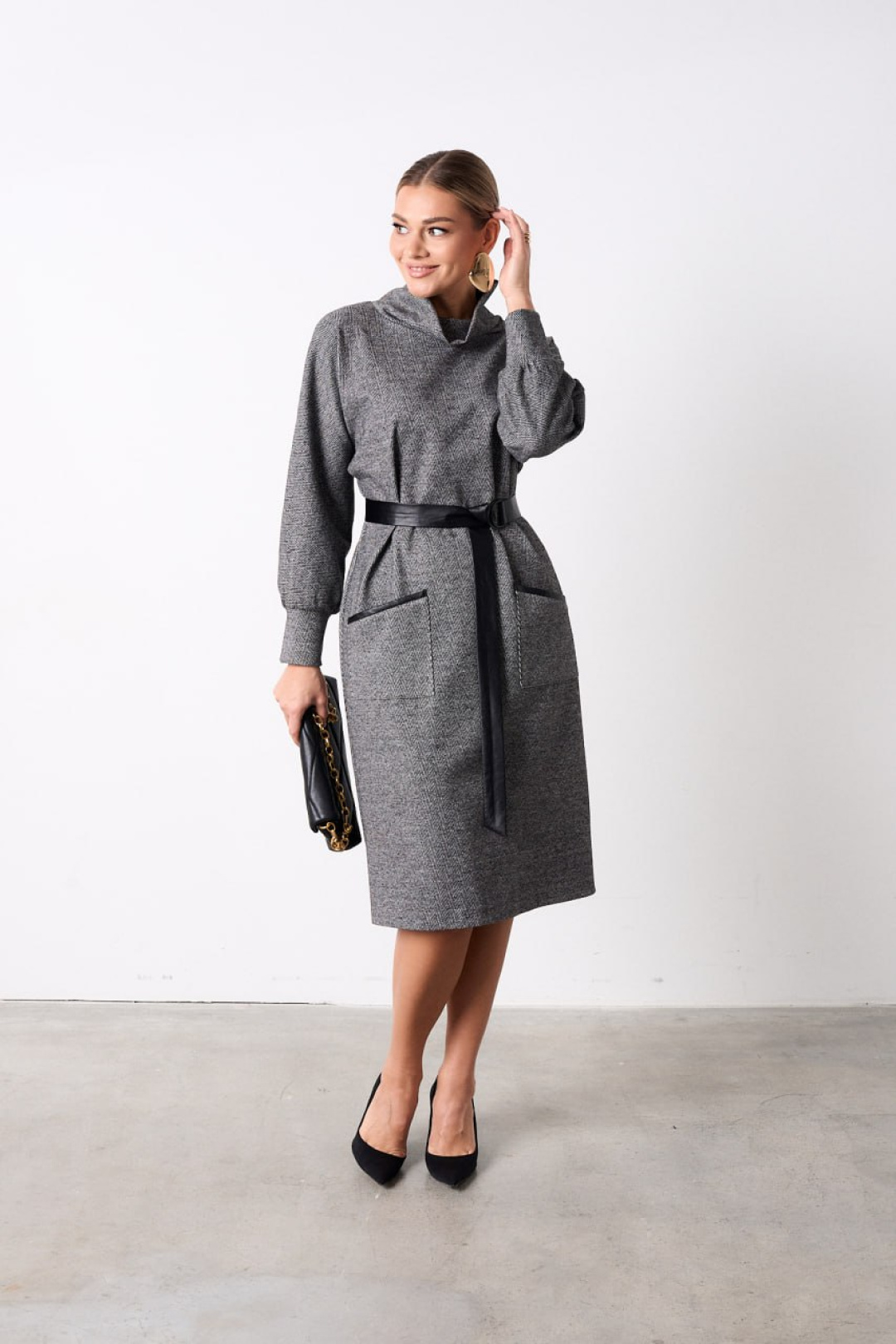 Элегантное платье серого цвета выполнено из мягкого трикотажа, что обеспечивает комфорт в носке. Модель обладает полуприлегающим силуэтом и длиной чуть ниже колена, идеально подходящей для создания утончённого образа. Особенным акцентом являются настрочные накладные карманы на бедрах с стильной отделкой из кожи, добавляющие практичности и шарма. Воротник-хомут дополняет горловину, создавая аккуратный и современный вид. Длинные цельнокроеные рукава завершаются манжетами для комфорта и изысканности. Платье снабжено съемным кожаным поясом на пряжке-протяжке, позволяющим акцентировать талию. Это платье станет идеальным выбором для деловых встреч или повседневной элегантности.