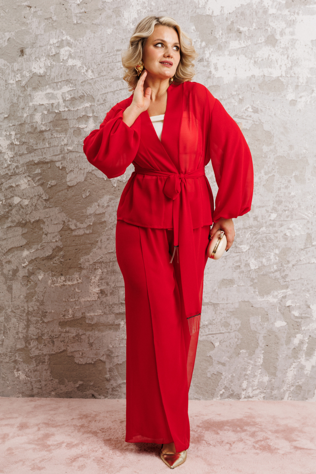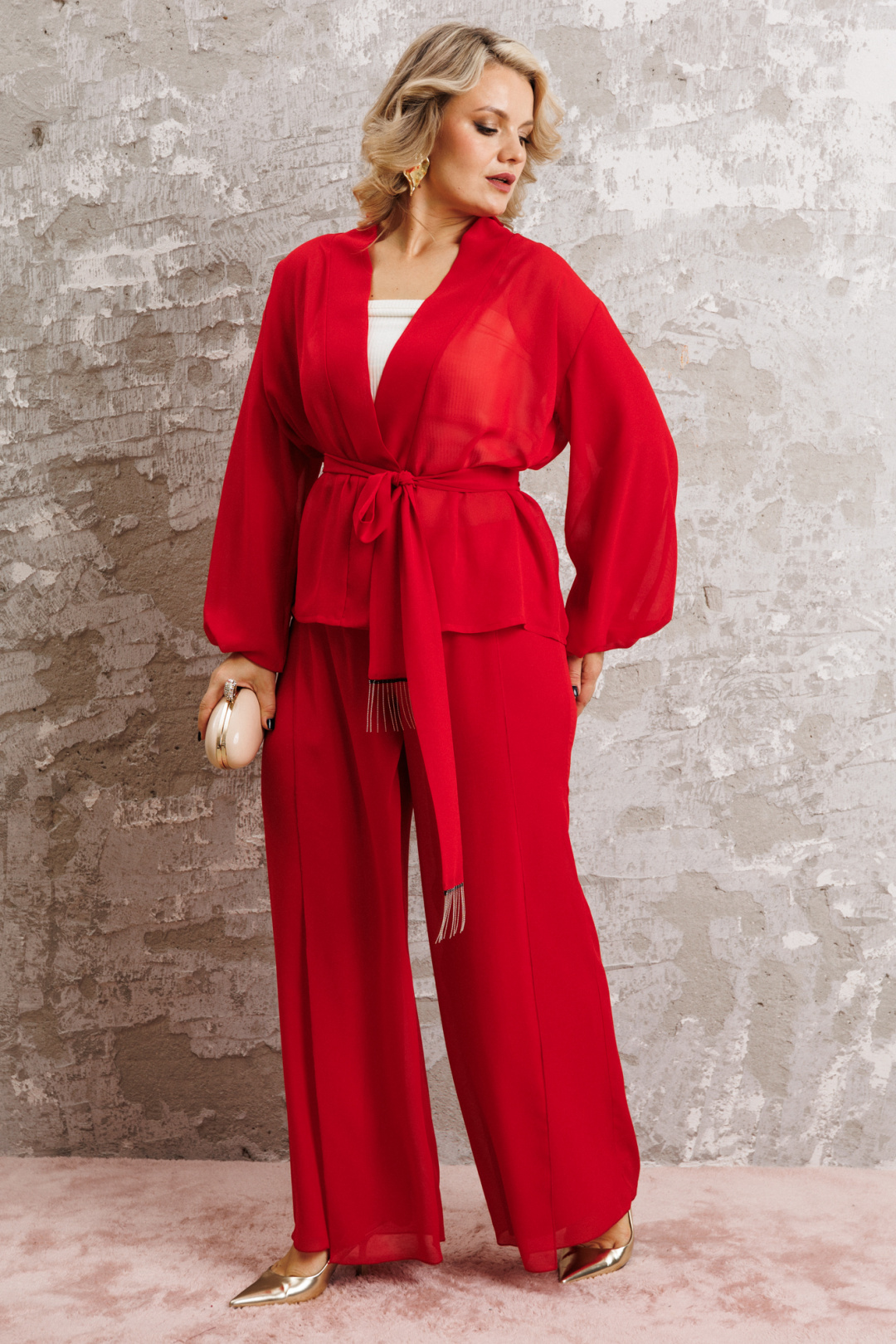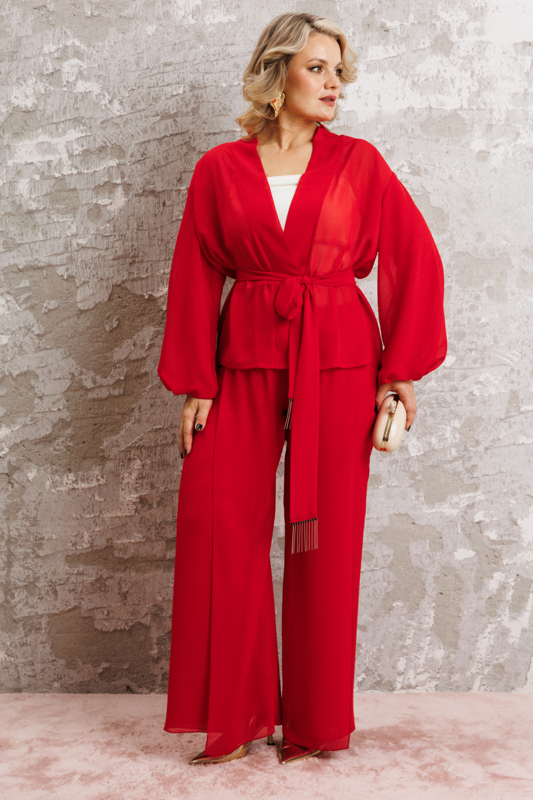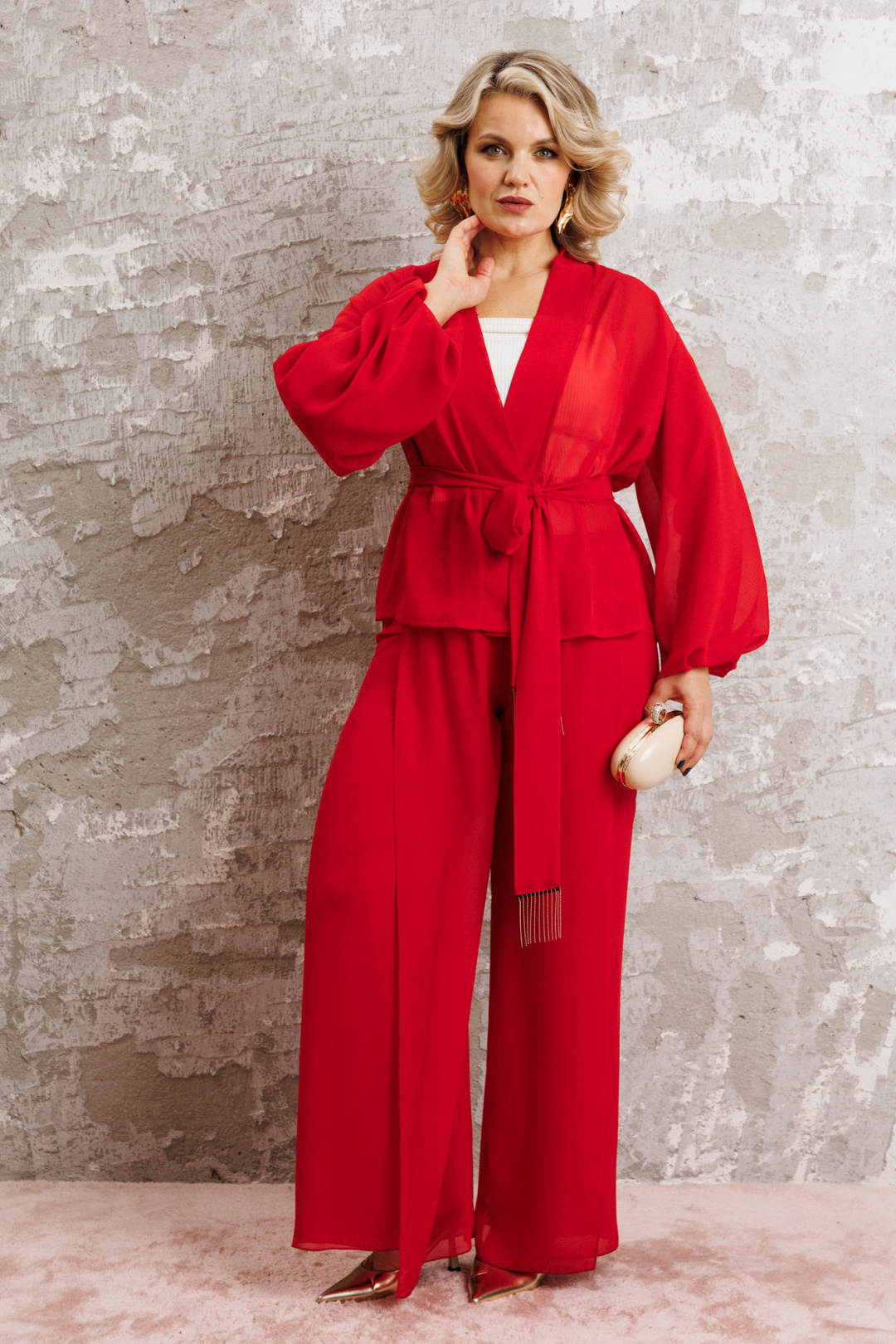 Элегантный вечерний костюм-двойка из шифона, состоящий из блузки свободного кроя и широких брюк. Красивый и эффектный брючный костюм - это идеальный образ для особых случаев, вечерних выходов, праздничных и торжественных мероприятий, будь то корпоратив, свадьба, юбилей, выпускной, день рождения, Новый год Блузка прямого силуэта из шифона со пущенной линией плеча. Рукав двойной, расширенный к низу со складками. По спинке и полочке идет планка. В комплекте с блузкой идет съемный пояс. На концах пояса металлизированная бахрома. Брюки прямые на трикотажной подкладке масло, с запахом по переду, пояс на резинке.Благодаря фасону и крою, костюм визуально вытянет силуэт, сделает фигуру стройнее, подчеркнет ее достоинства, скроет недостатки. Элегантный брючный костюм от Anastasia- комфорт и уверенность в себе на любом мероприятии Длина блузки: (48-56)-61см. Длина рукава-52см. Длина брюк:(48-54)-105см., (56)-108см.