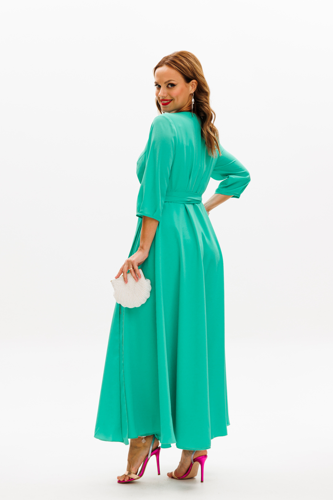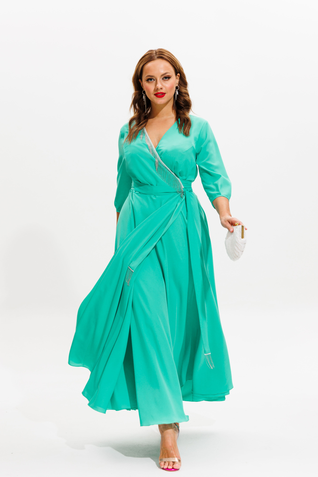 Элегантное  женское платье из блузочной ткани отрезное по линии талии. Благодаря своему крою прекрасно будет смотреться на любой фигуре, скрывая недостатки. Спинка и полочка -двойные.  Юбка-солнце-клеш (двойная). На лифе переда-нагрудные вытачки с проймы и по 2-е мягкие складки по талии. Спинка со средним швом и выточками.  В правом боковом шве лифа - отверствие для пояса,который протягивается и завязывается по переду.  Рукав втачной,одношовный, длиной 3/4. По низу рукава - мягкие складки. В качестве декора - металлизированная бахрома по горловине полочки  и по краю пояса.  Длина платья: верхняя часть: -(50-52)- 36см,(54-56)-37 см., юбка (50-56)-100см. Длина рукава: (50-56)-41 см.