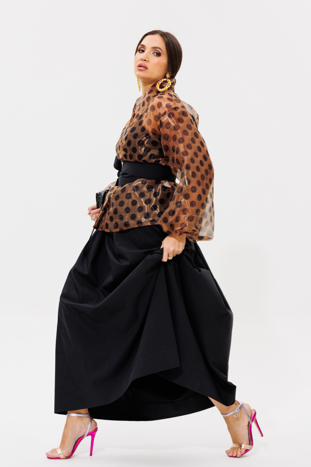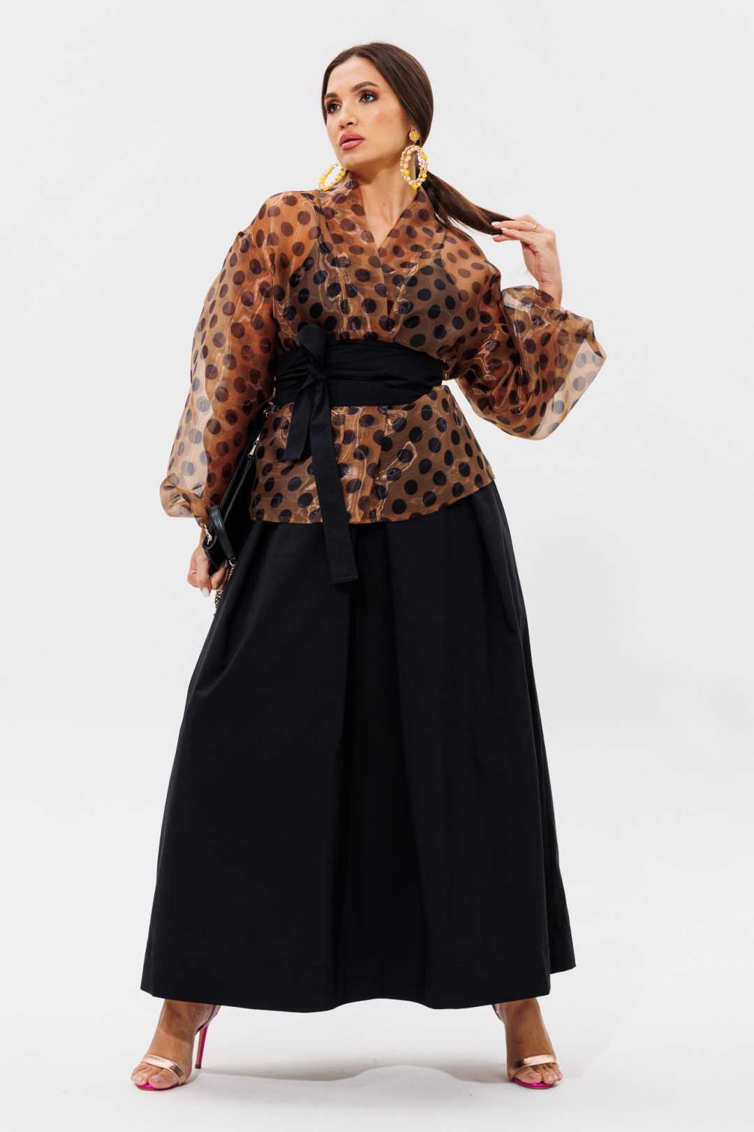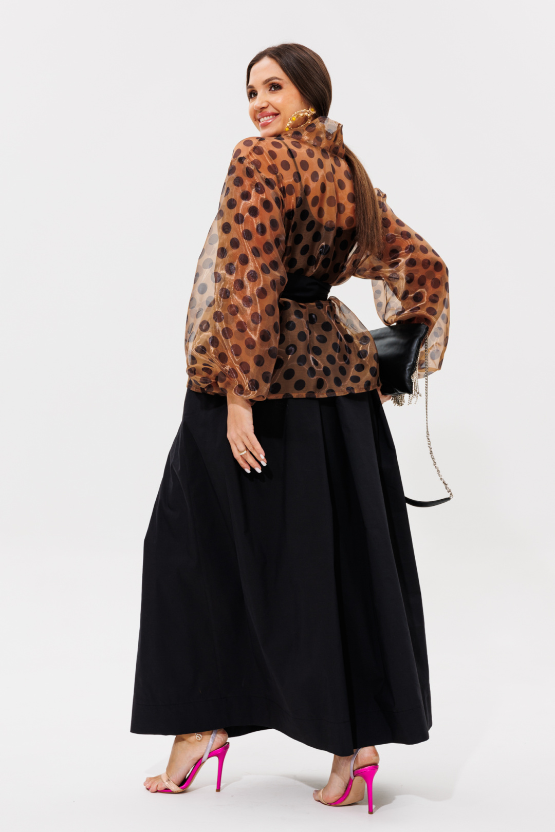 Шикарный комплект женский 2-х предметный от бренда Anastasia, идеальный для любого случая. Этот комплект сочетает в себе элегантность и комфорт . Туника прямого силуэта из органзы в горох со спущенной линией плеча. Рукав двойной, расширенный к низу со складками. По спинке и полочке идет планка. С ее помощью легко можно трансформировать повседневный образ в праздничный. Юбка А-образного силуэта в пол на подкладке. По подкладке идет валан, для поддержания обьема юбки. По переду и спинке по центру идет встречная складка, по бокам- односторонние. По спинке застежка молния. В комплект входит сьемный пояс. Длина туники по спинки(48-56)-66 см. Длина рукава: (48-56)-53см. Длина юбки 99 см