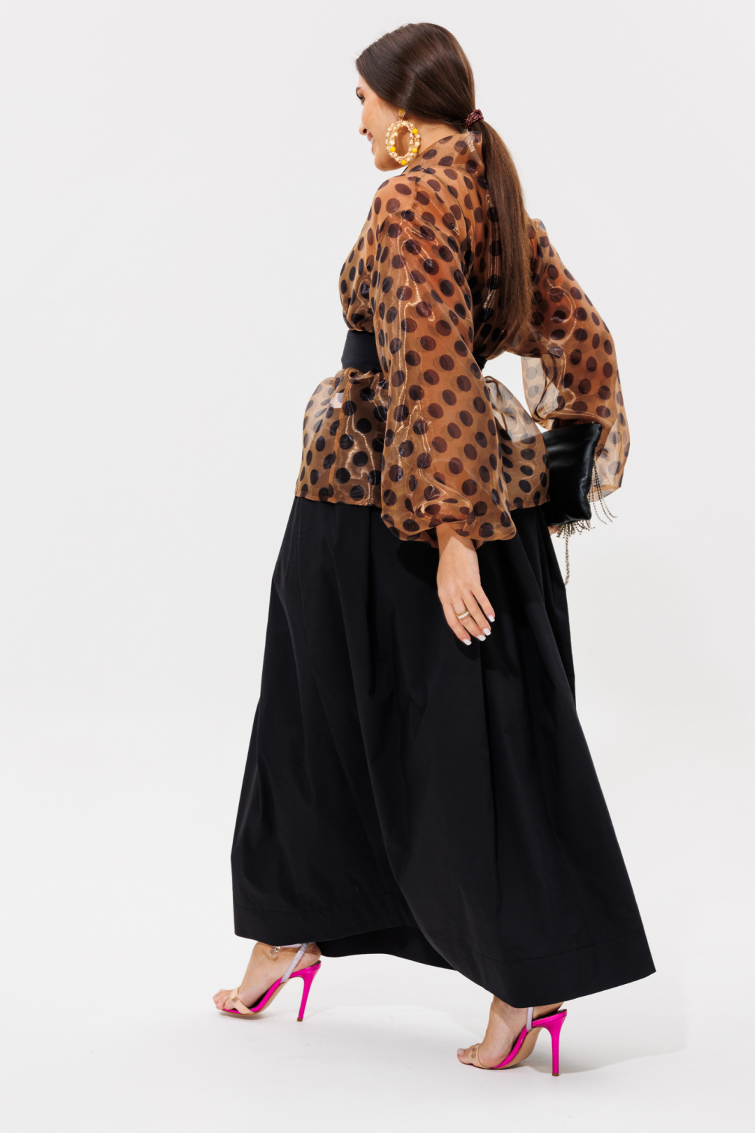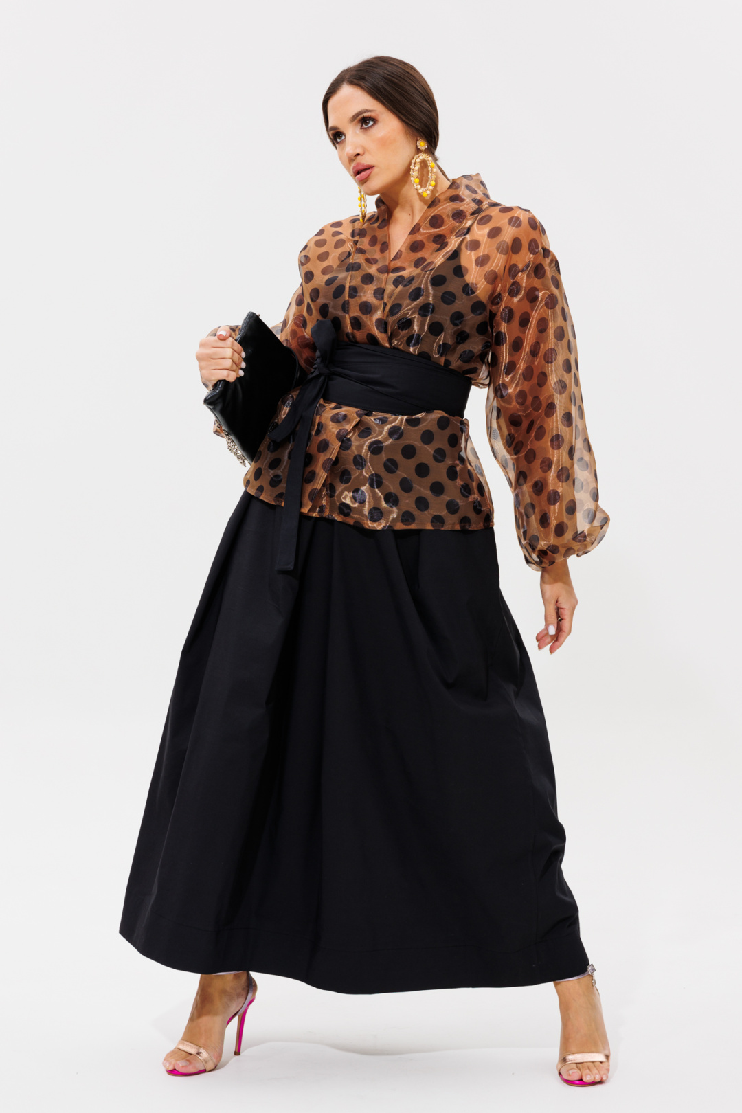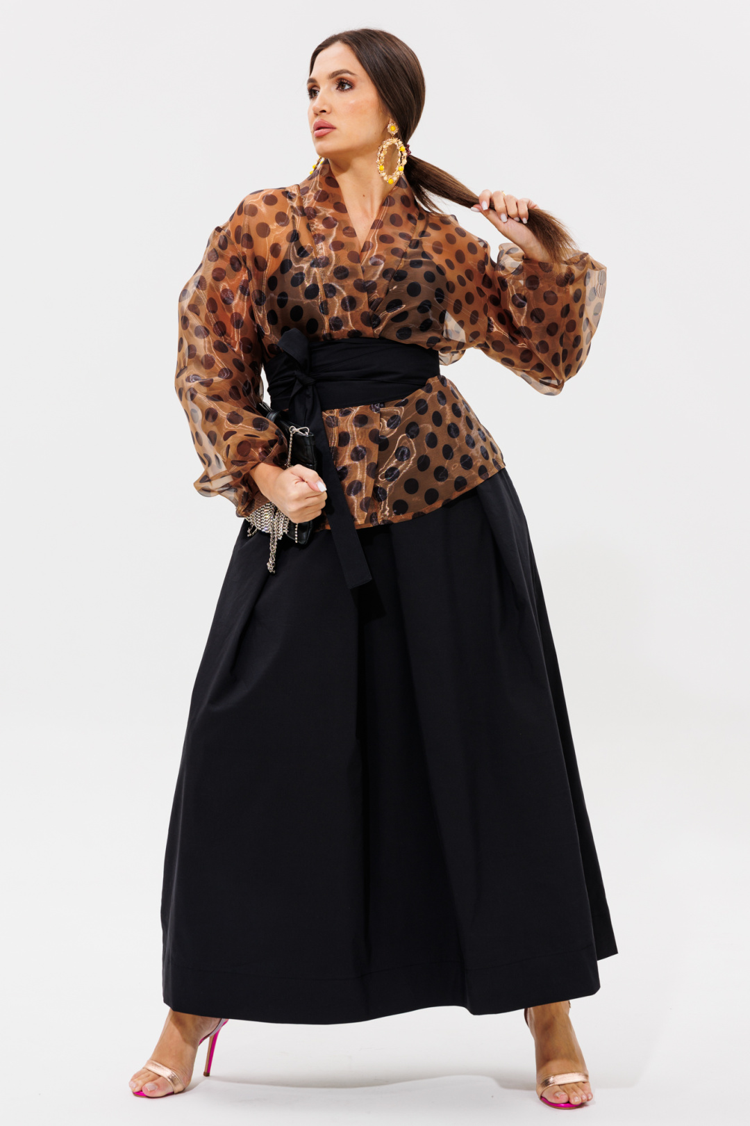 Шикарный комплект женский 2-х предметный от бренда Anastasia, идеальный для любого случая. Этот комплект сочетает в себе элегантность и комфорт . Туника прямого силуэта из органзы в горох со спущенной линией плеча. Рукав двойной, расширенный к низу со складками. По спинке и полочке идет планка. С ее помощью легко можно трансформировать повседневный образ в праздничный. Юбка А-образного силуэта в пол на подкладке. По подкладке идет валан, для поддержания обьема юбки. По переду и спинке по центру идет встречная складка, по бокам- односторонние. По спинке застежка молния. В комплект входит сьемный пояс. Длина туники по спинки(48-56)-66 см. Длина рукава: (48-56)-53см. Длина юбки 99 см