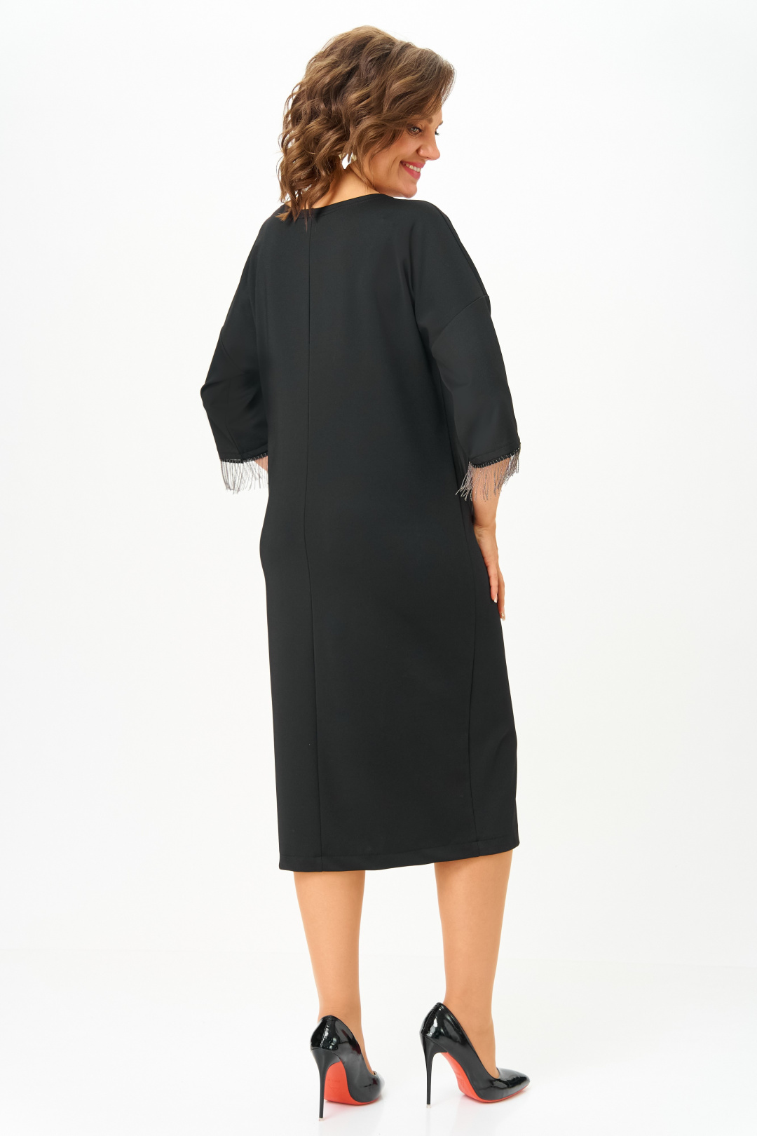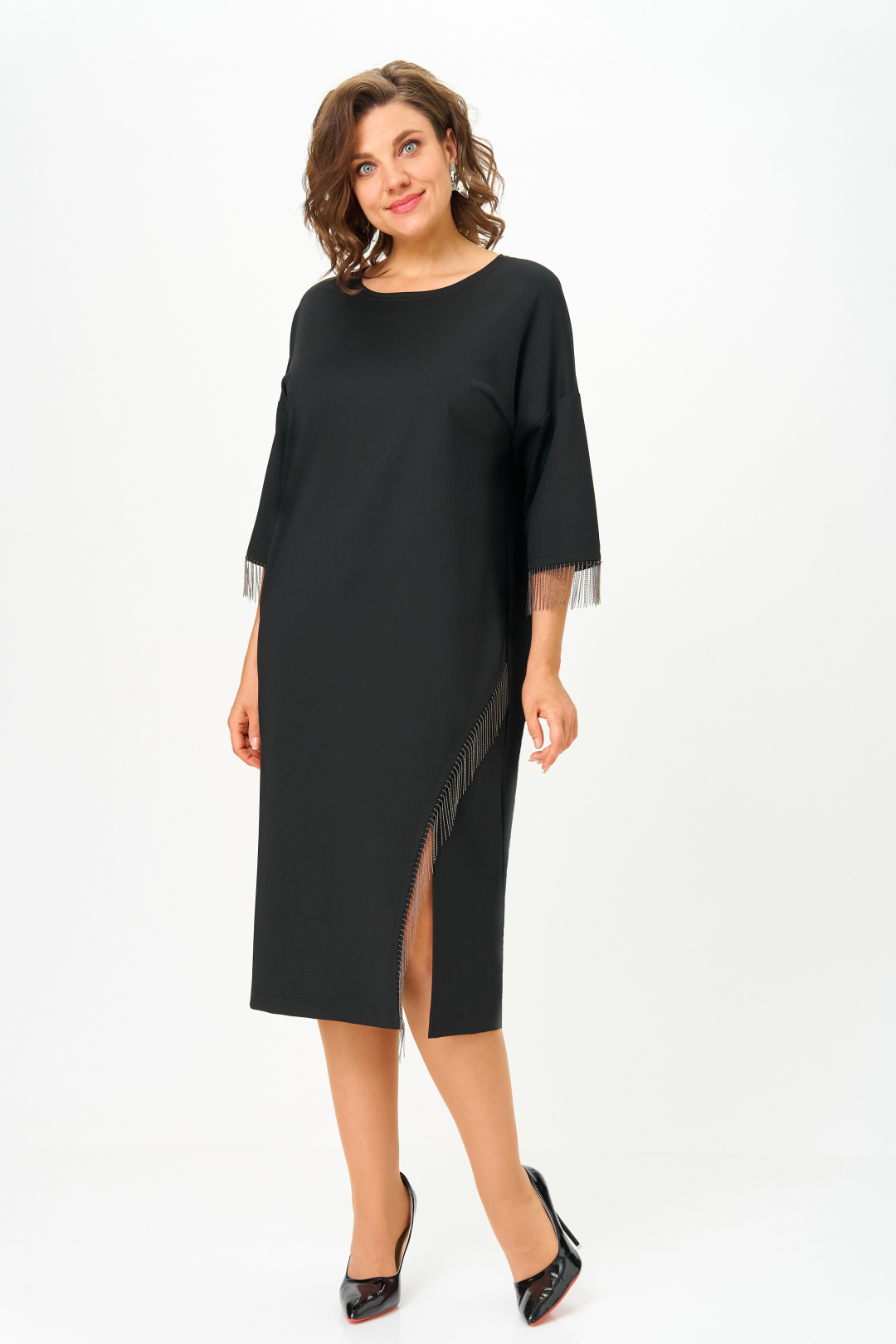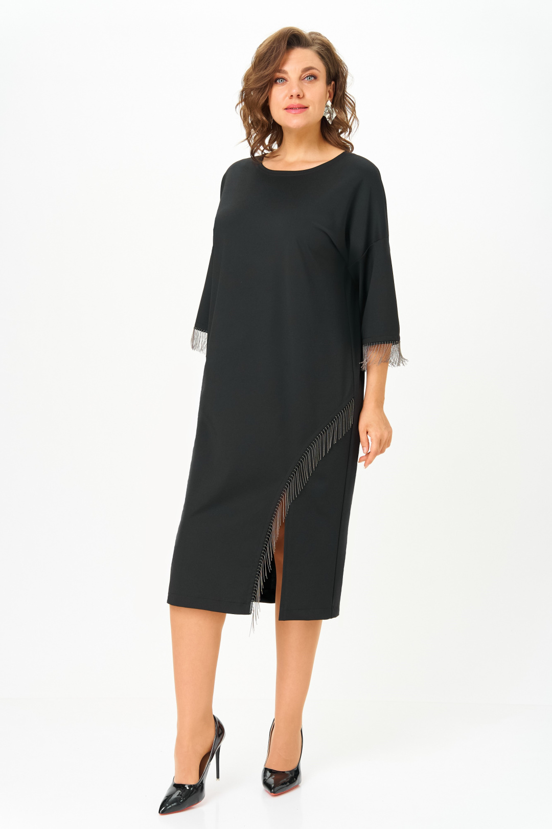 Черное платье миди — не просто одежда, это заявление о вашем стиле и вкусе. Элегантное праздничное платье прямного силуэта из трикотажного полотна. Ткань не мнется. Благодаря своему крою подойдёт для разных типов фигуры. Оно подчеркнёт вашу индивидуальность и станет отличным дополнением к вашему гардеробу. В нём вы будете чувствовать себя уверенно и комфортно, зная, что выглядите на все сто. Выбирая его, вы выбираете качество, комфорт и стиль. Классическое черное платье прямого силуэта, со спущенным плечом. По переду идет подрез с разрезом. В качестве декора по подрезу и низу рукава- металлизированная бахрома. По спинке идет средний шов. Такое платье незаменимая вещь в любом гардеробе. Рекомендуется носить на черное белье. Длина платья по спинке (48-52) - 108см, (54-58) - 112 см. Длина рукава: (48-58) - 24 см.