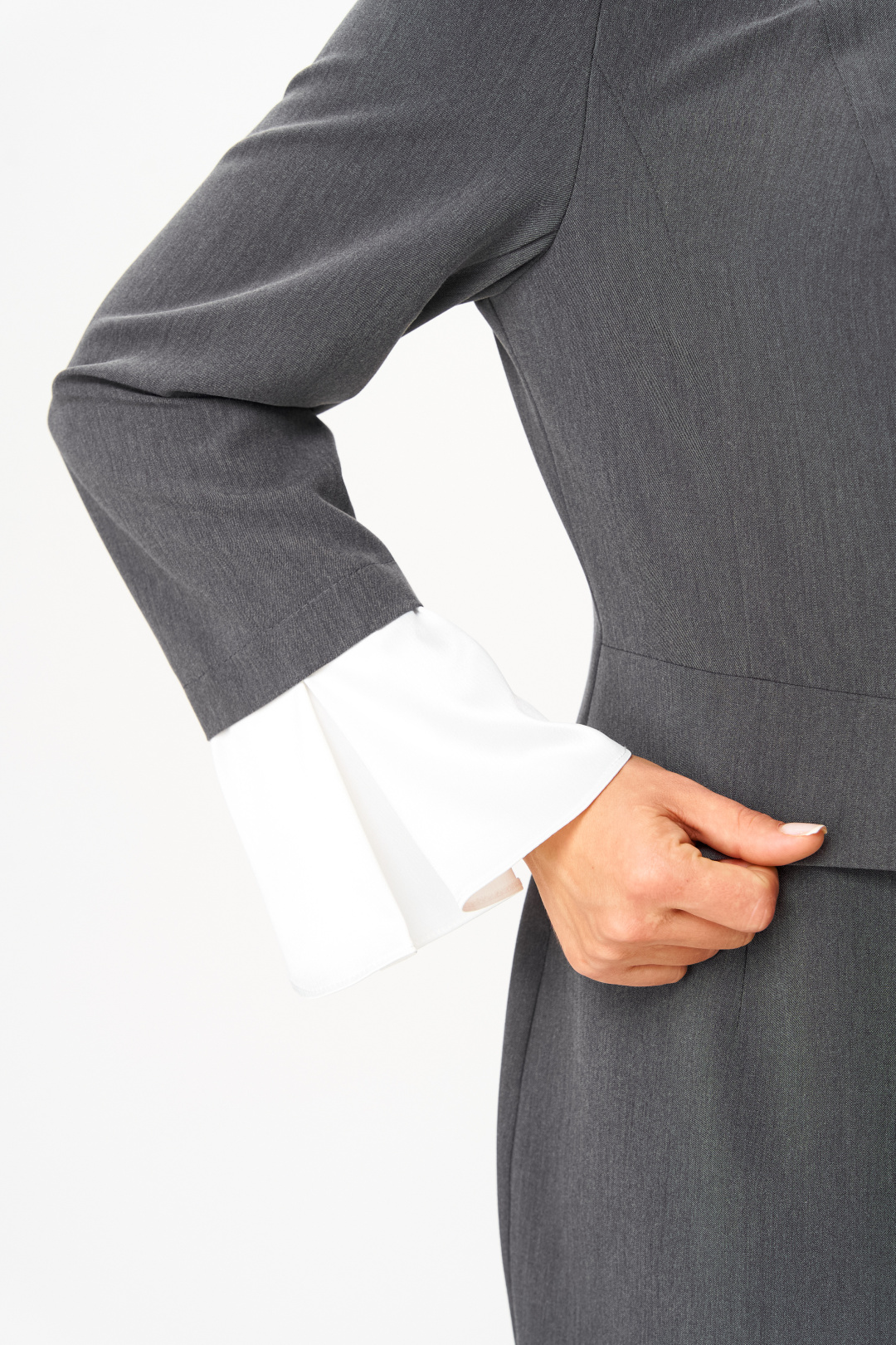 Полочка платья с вертикальными рельефами в верхней части и с отрезной боковой нижней частью с талиевой вытачкой и декоративным клапаном. Застежка двубортная, на петлю и пуговицу. Горловина V-образной формы, обработана воротником типа “апаш” из отделочной ткани. Спинка со средним швом и вертикальными рельефами. Рукав длинный, втачной, двухшовный.