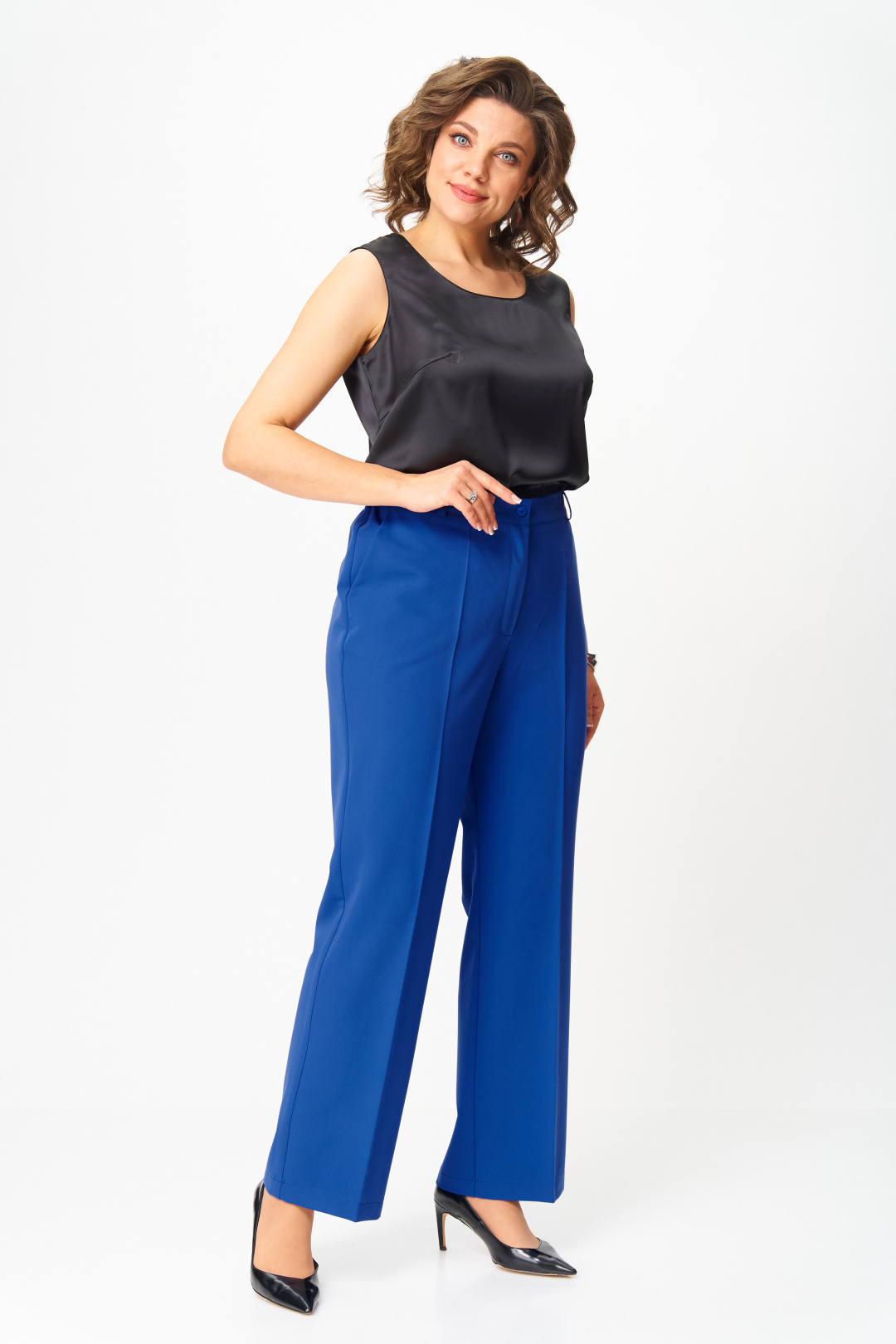 Брюки полной длины, прилегающие в области бедер и свободные в колене и по низу. Брюки со стрелками. По передним половинкам выполнены наклонные карманы. В левом боковом шве обработана застежка на потайную молнию. По талии брюки на притачном поясе с эластичной тесьмой и застежкой на петлю и пуговицу. По поясу брюк обработаны шлевки под ремень.