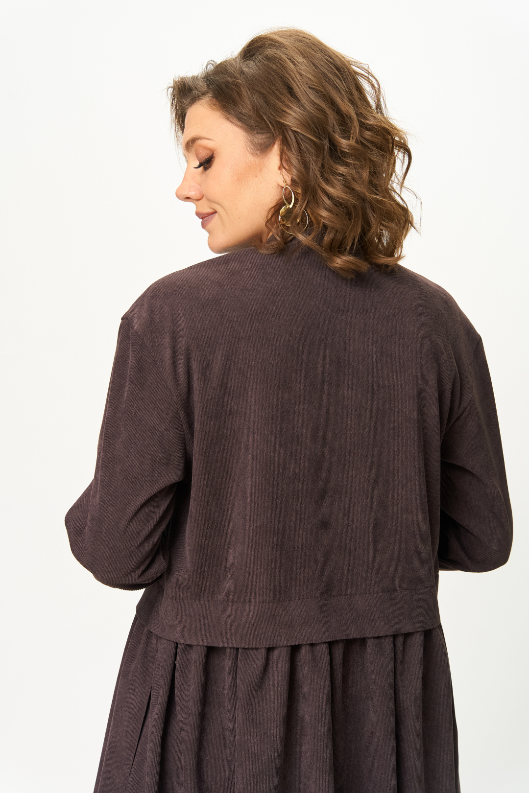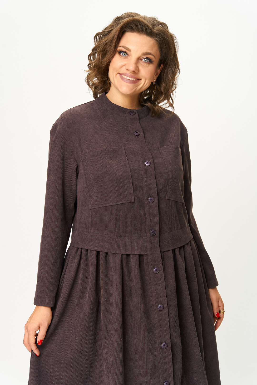 Платье прямого силуэта, длиной за колено, выполнено из вельвета в мелкий рубчик. Полочка платья с отрезной планкой по центру и застежкой на петли и пуговицы. Лиф платья отрезной , со складкой по низу, к срезу которой притачана юбка со сборкой. Полочка лифа с нагрудными вытачками и накладными карманами. Горловина круглой формы обработана воротником-стойкой. Пройма углубленной формы с рукавом рубашечного типа, рукав длинный, одношовный. В боковых швах юбки обработаны карманы.