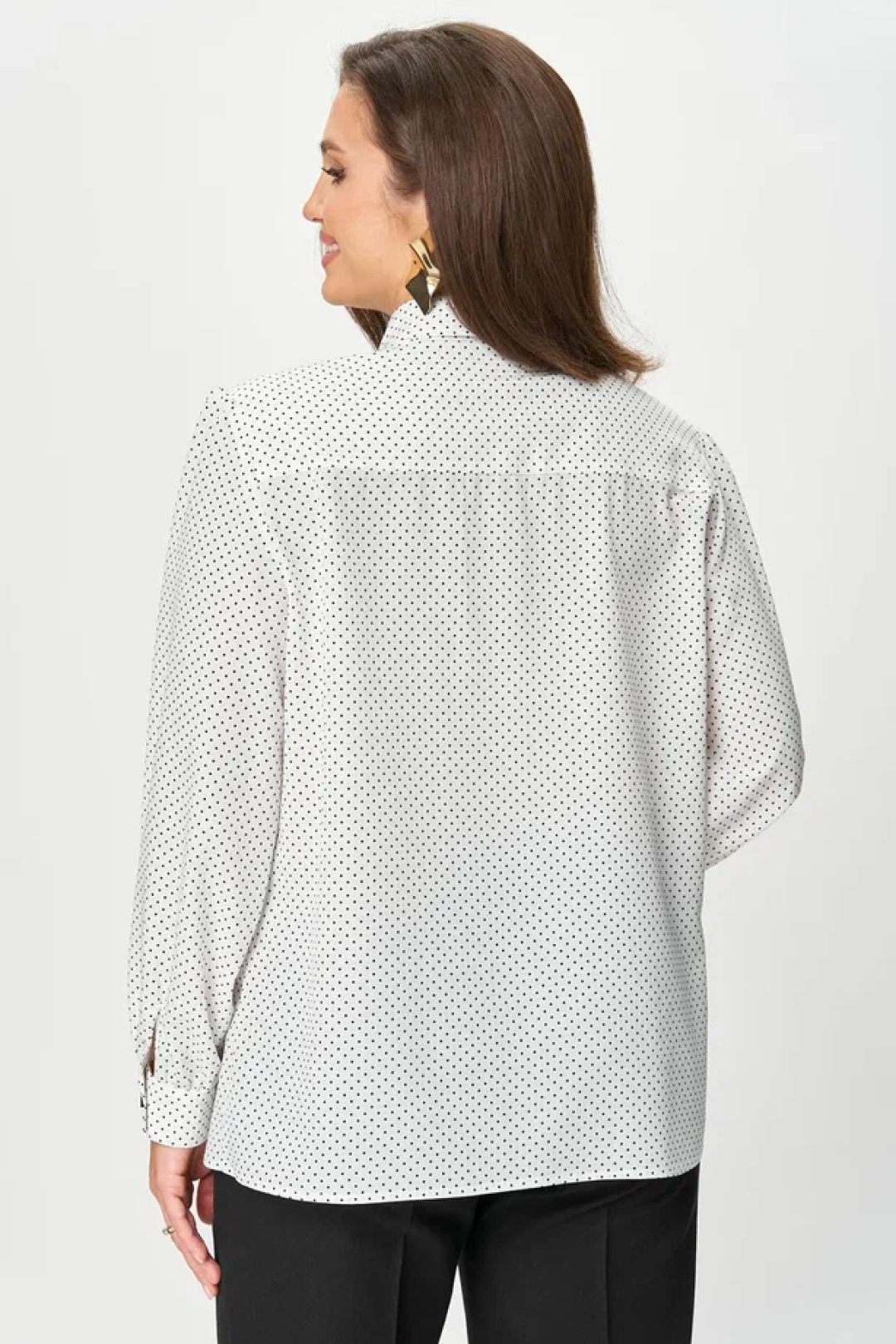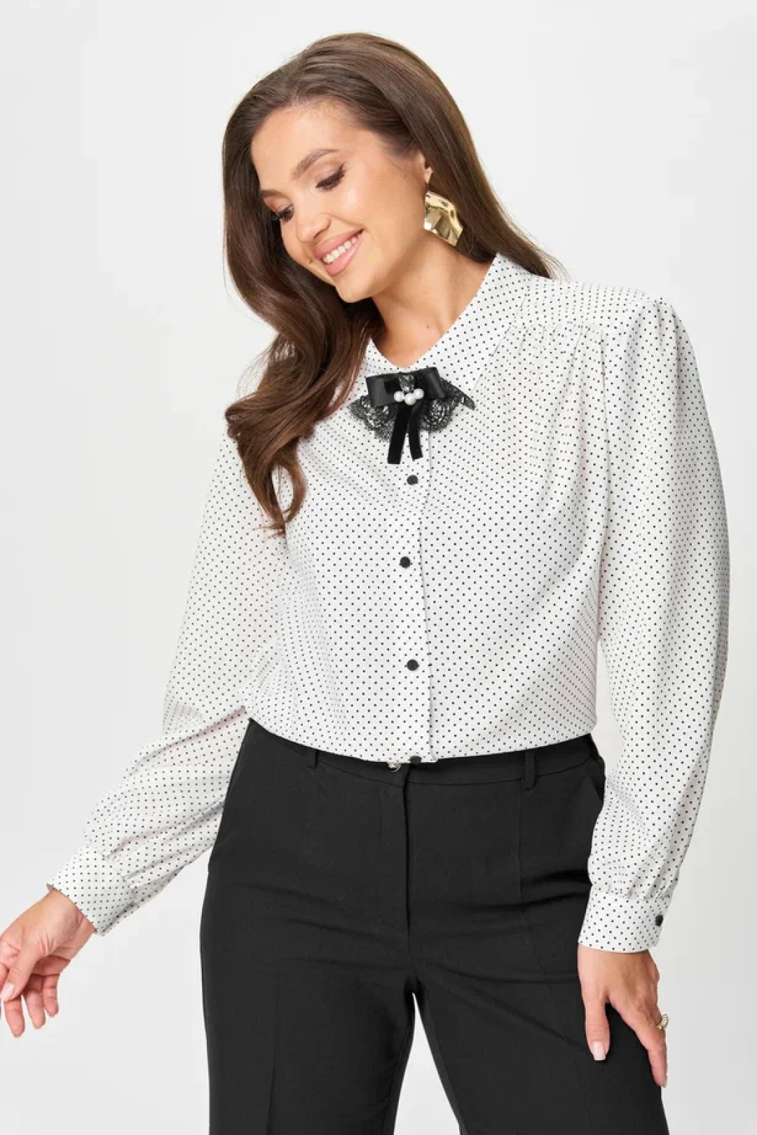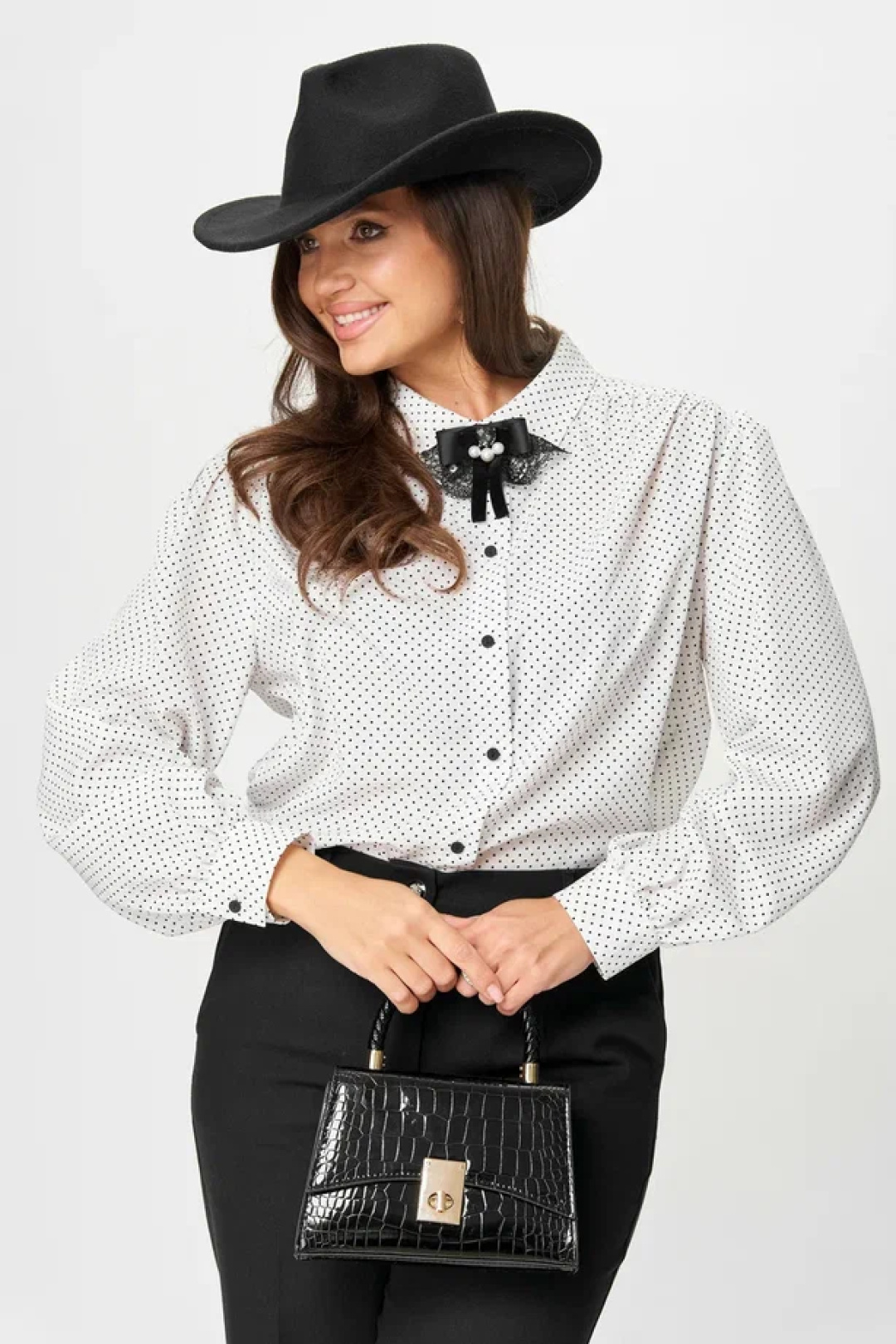 Блузка в горох с объемными рукавами на манжетах прекрасно впишется в любой гардероб. Изделие с планкой на пуговицах прекрасно сидит на фигуре, прямой крой вещи вытягивает силуэт, скрывает несовершенства и подчёркивает достоинства. Модель из крепа подойдет для носки в теплую погоду, зимой под жакет, жилет, кардиган, прекрасно сочетается не только с классическими брюками и юбками. Дизайнерская брошь ручной работы дополняет и украшает блузку.