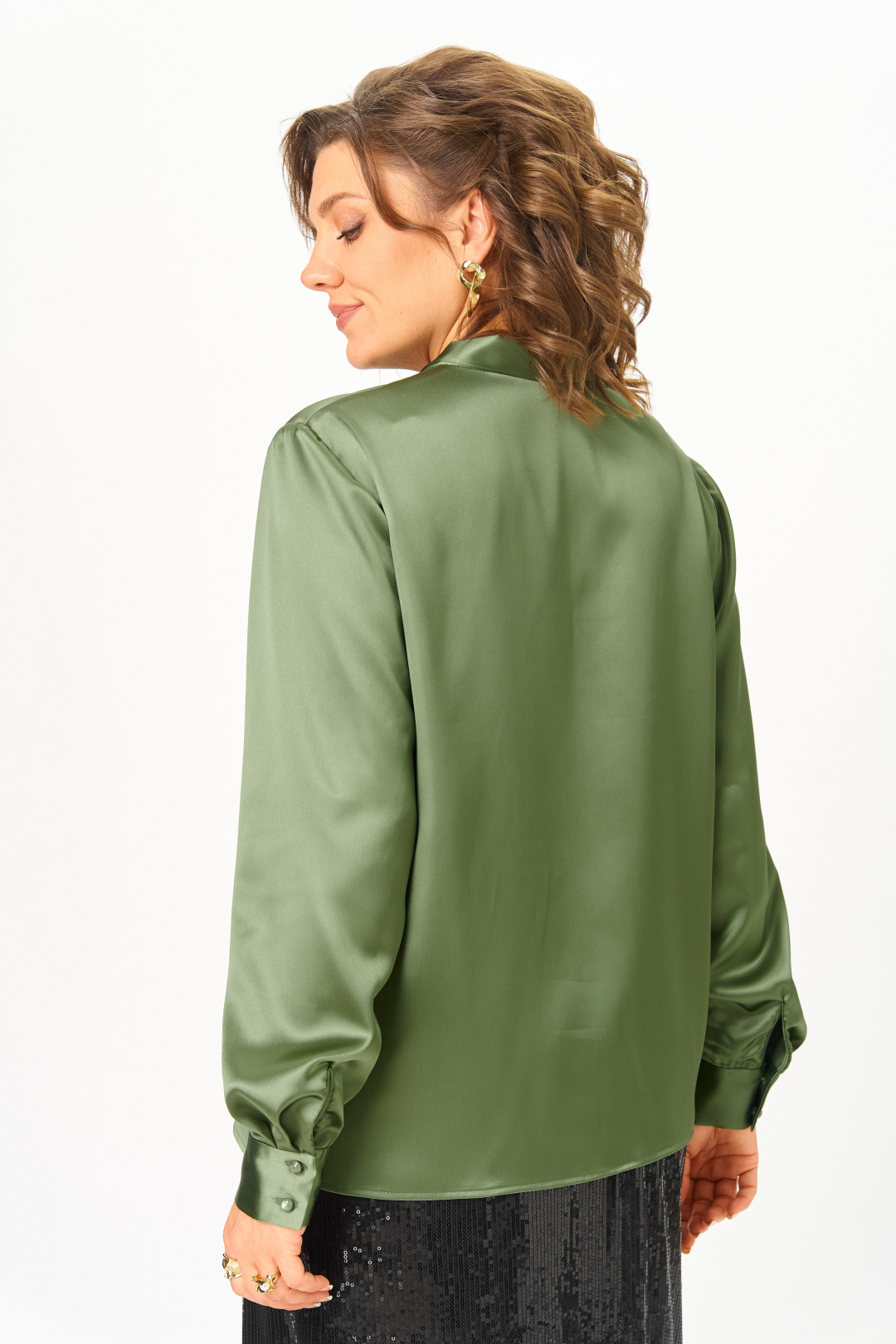 Оливковая женская блузка-рубашка из лёгкой атласной ткани с изысканным бантом над вырезом представляет собой гармоничное сочетание деловой элегантности и романтичного шарма. Прямой свободный силуэт обеспечивает комфорт в течение всего дня, сохраняя при этом аккуратный и утончённый вид. Треугольный вырез с изящными завязками, превращающимися в модный бант на груди, добавляет образу ноту женственности, делая его одновременно строгим и нежным. Длинный рукав с элегантной манжетой на пуговице позволяет регулировать посадку. Лёгкий тонкий атлас добавляет луку воздушности, сохраняя при этом необходимую для офиса сдержанность. Особенностью этой модели является её универсальность - представленная в больших размерах, она подчёркивает достоинства фигуры разного типа. Блузка-рубашка одинаково хорошо смотрится как в строгом деловом ансамбле, так и в более романтичных повседневных, праздничных и стильных образах.
