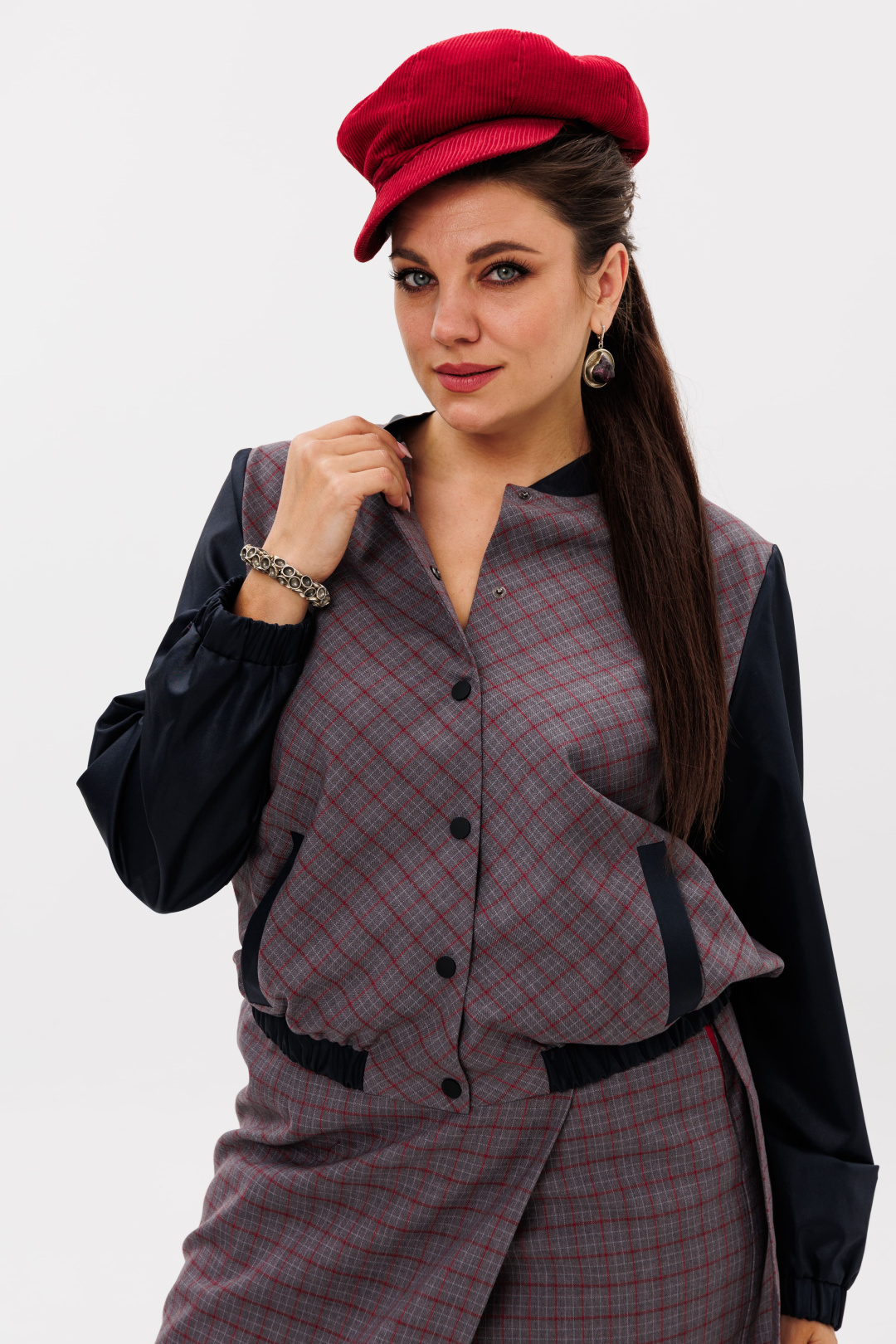 Бомбер выполнен из костюмной ткани в сочетании с тканью с напылением под кожу. Силуэт прямой, с застежкой на кнопки по всей длине.
