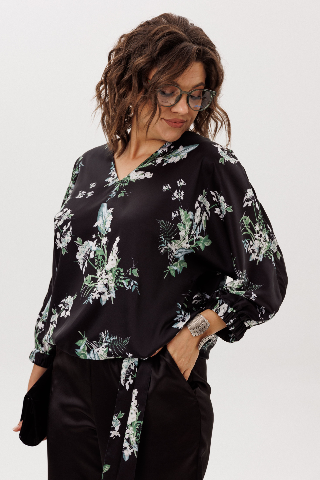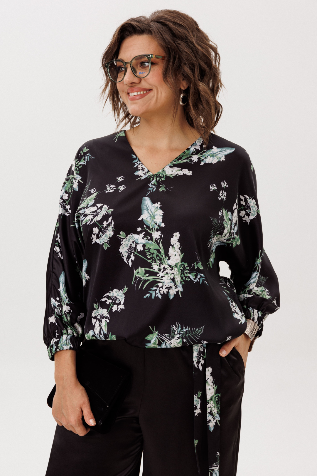Особую динамику и индивидуальность блузе придают детали: цельнокроеные рукава три четверти подчёркивают целостность и плавность линий, а притачной пояс и манжеты, собранные в нежную сборку благодаря эластичной резинке, создают выразительный контраст с текучестью основной ткани. Эта умная конструкция позволяет вам самостоятельно регулировать длину блузы, творчески преобразуя её силуэт — от парящего и расслабленного до более собранного и чёткого.