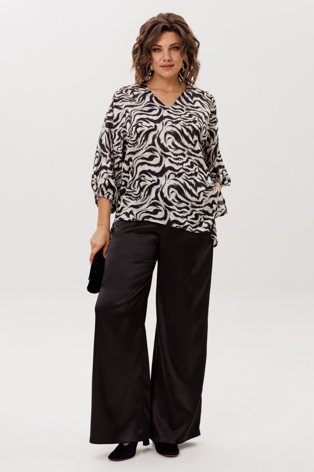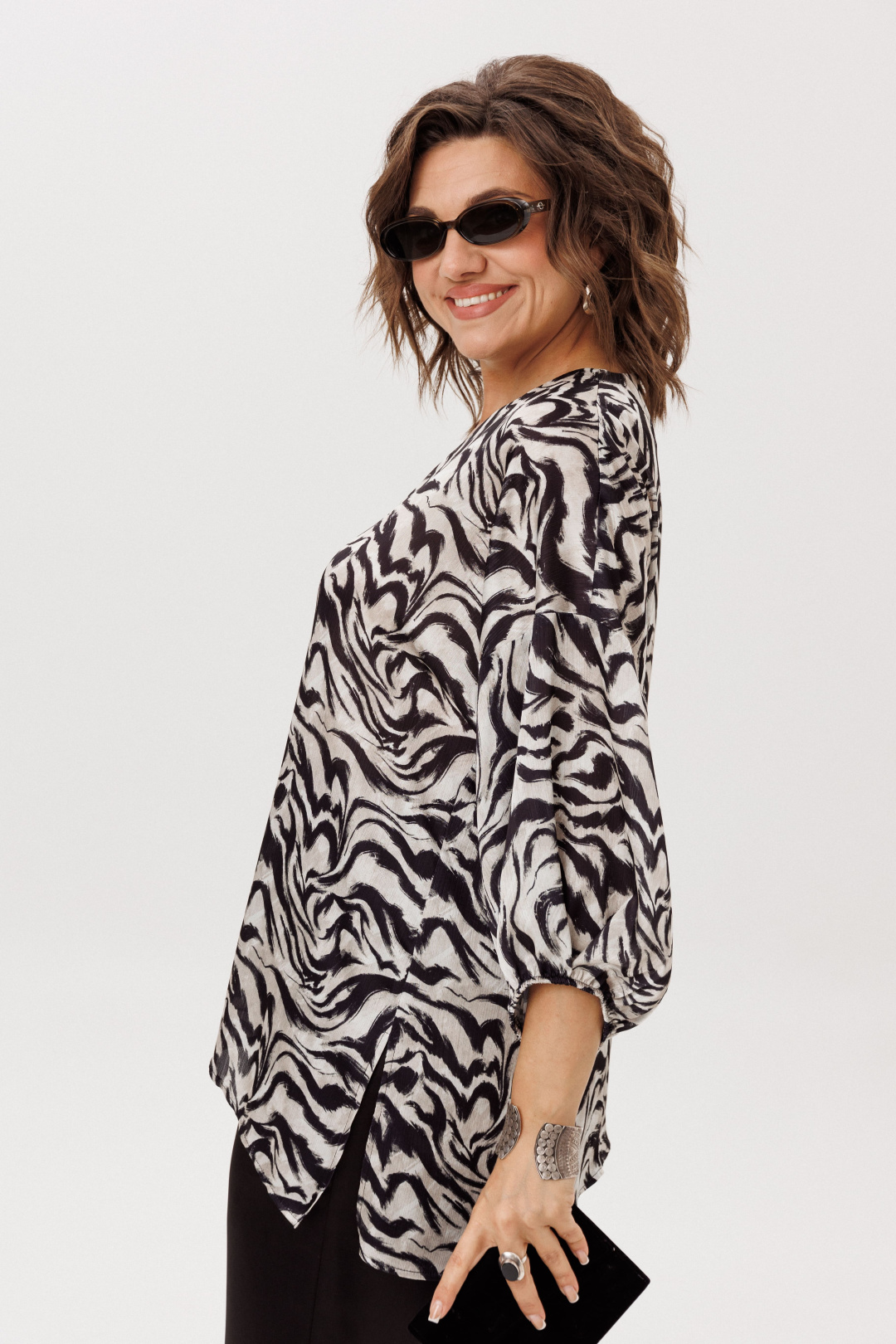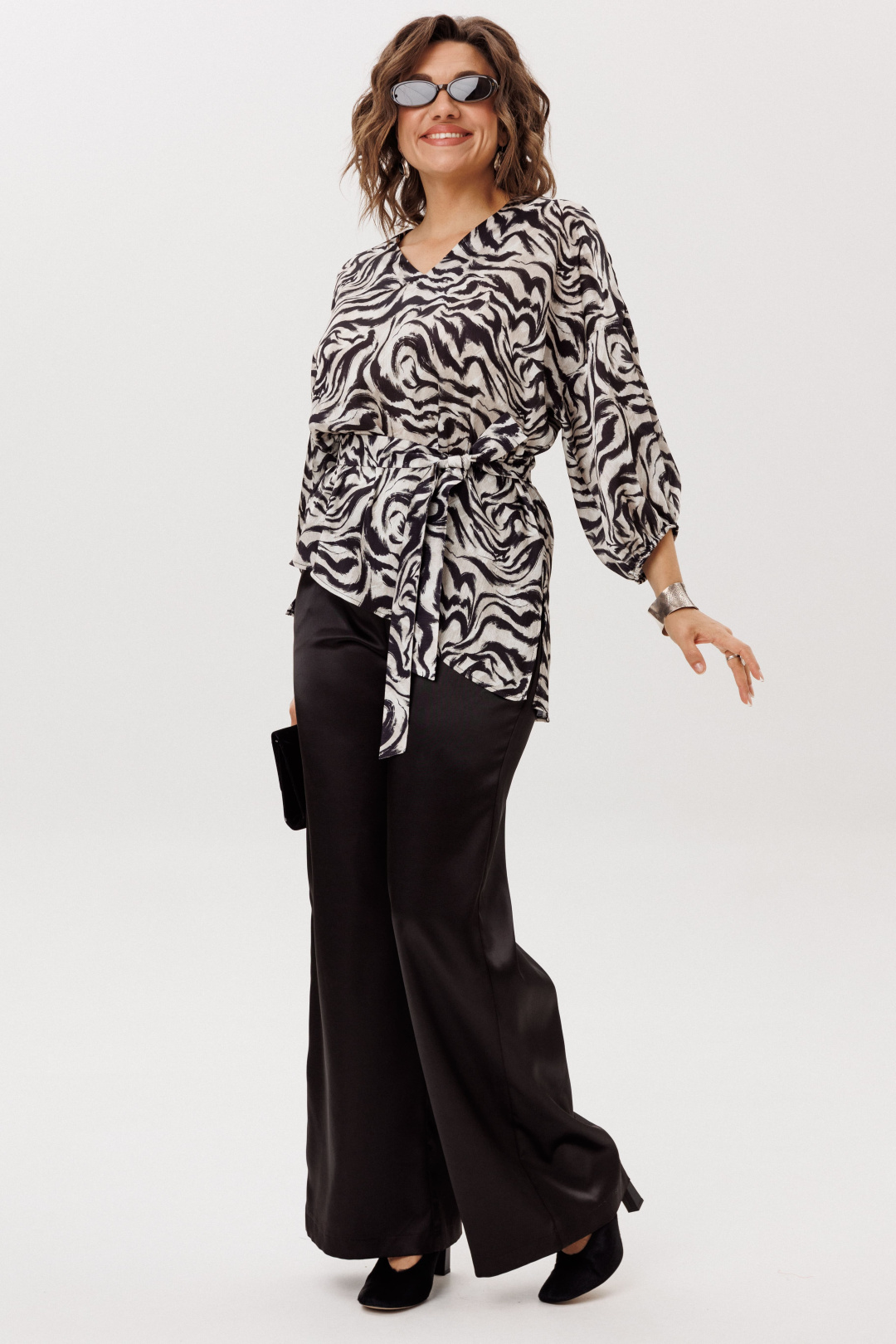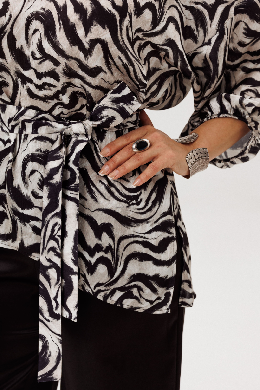 Главная особенность этой модели — продуманная многозадачность. Пояс в комплекте позволяет вам самостоятельно создавать нужный образ: затяните его, чтобы подчеркнуть талию и создать фигуру «песочные часы», или отпустите для расслабленного силуэта в стиле бохо. Завершает картину асимметричный низ с разрезом — деталь, которая делает блузу по-настоящему уникальной и визуально вытягивает силуэт.