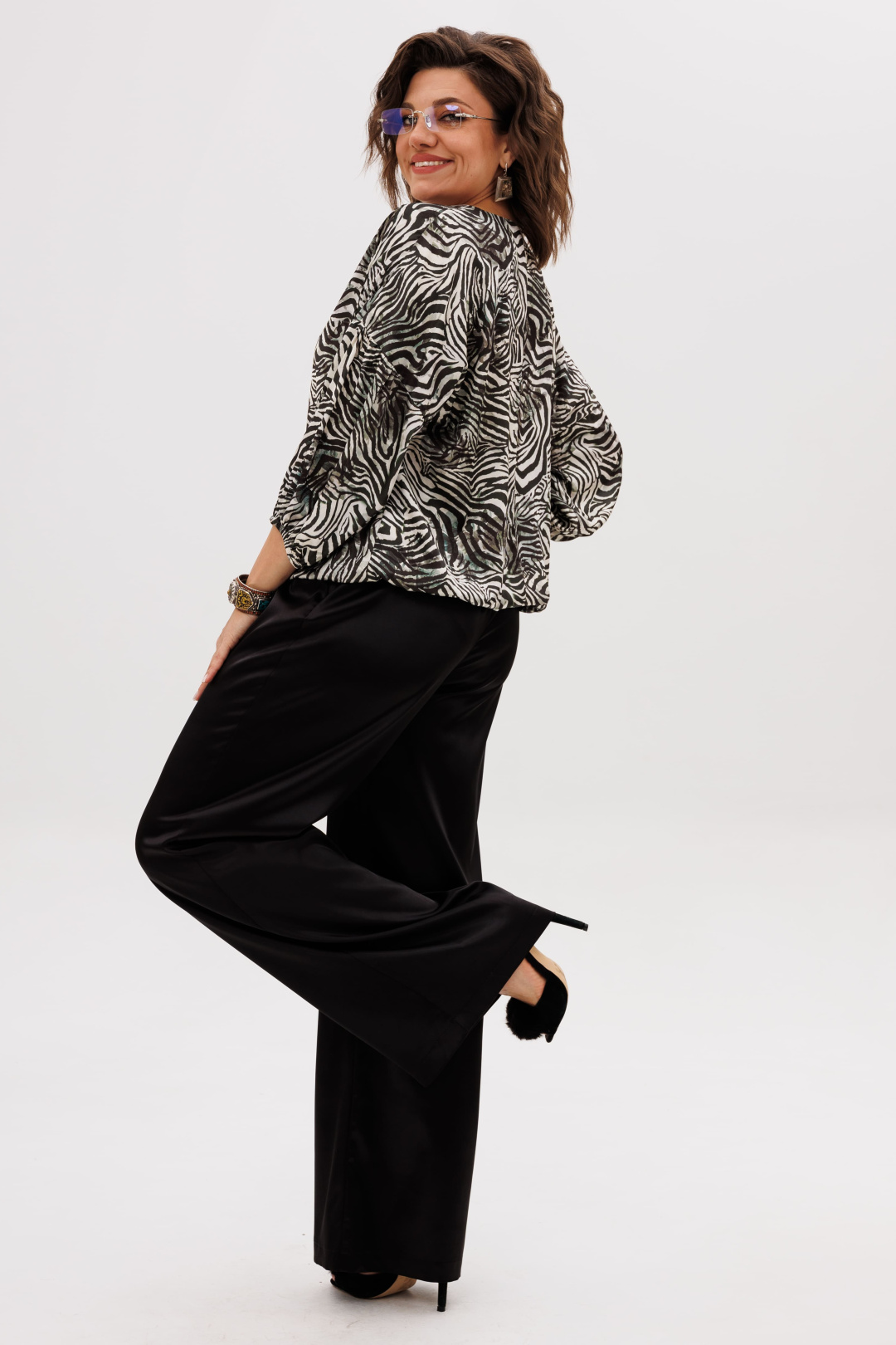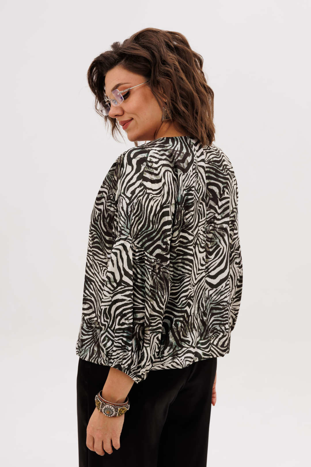 Но главная тайна этой модели скрыта в ее сердце — эластичная резинка, проходящая по всему низу блузы. Эта деталь полностью меняет правила игры. Теперь вы сами становитесь творцом своего образа: укоротите блузу для дерзкого современного вида или отпустите ее для струящегося, романтичного силуэта. Она послушно следует за вашим желанием, подстраиваясь под настроение и ситуацию.