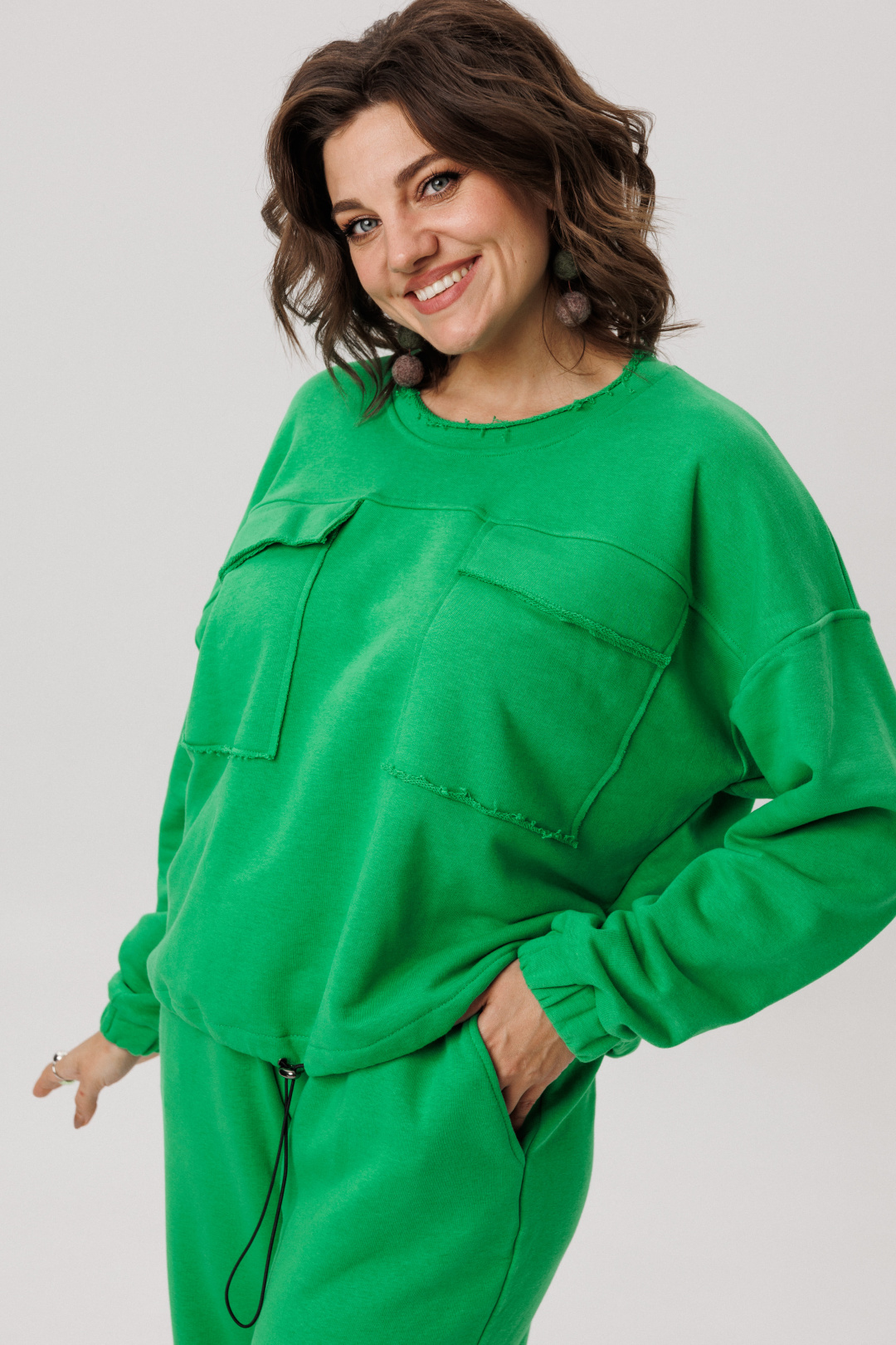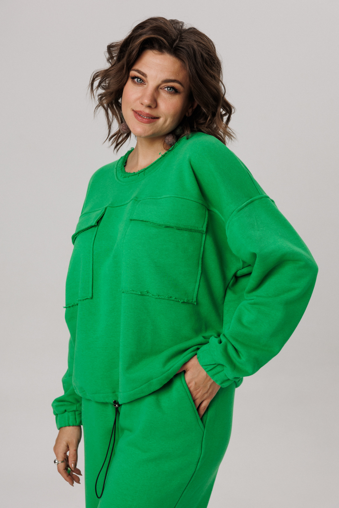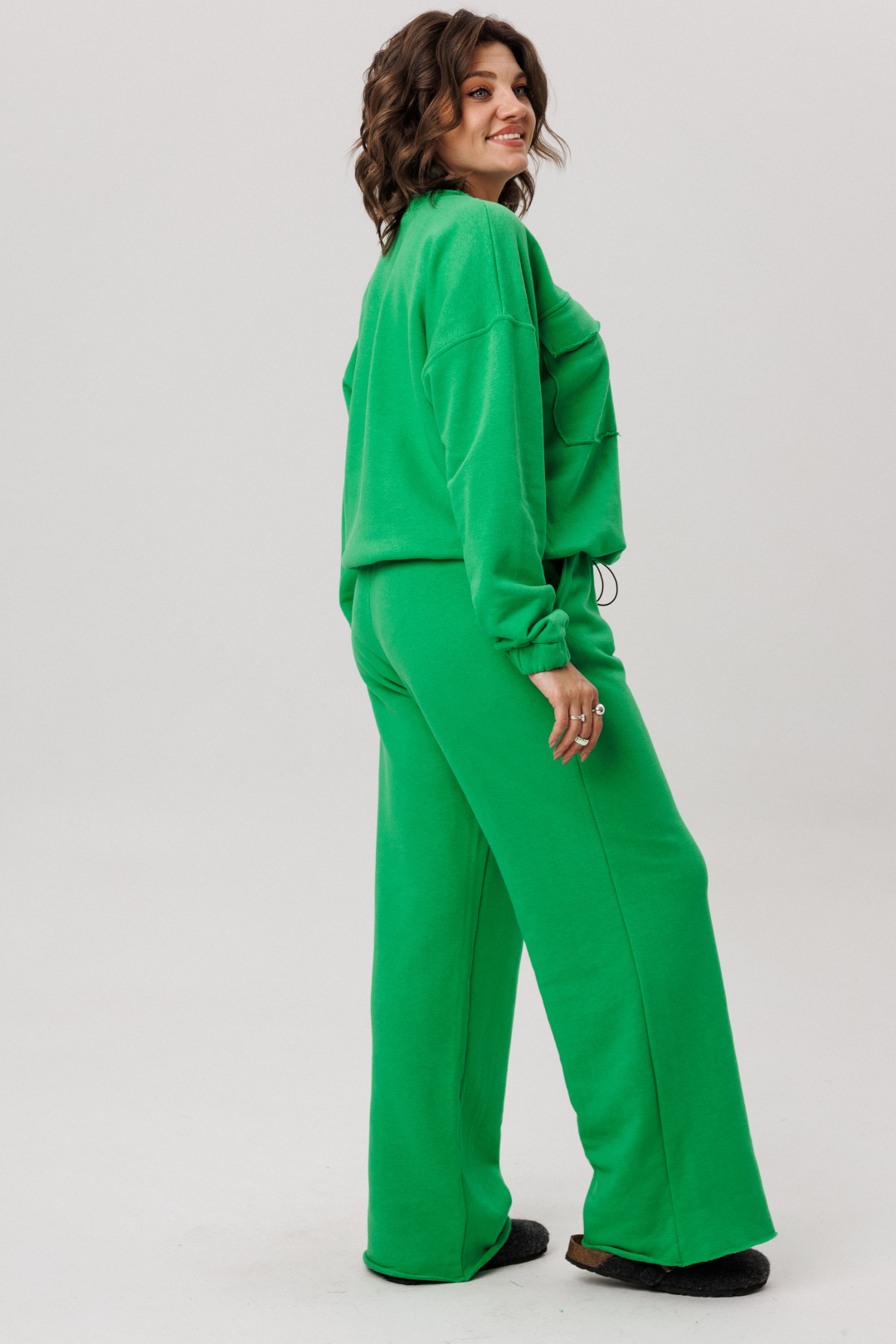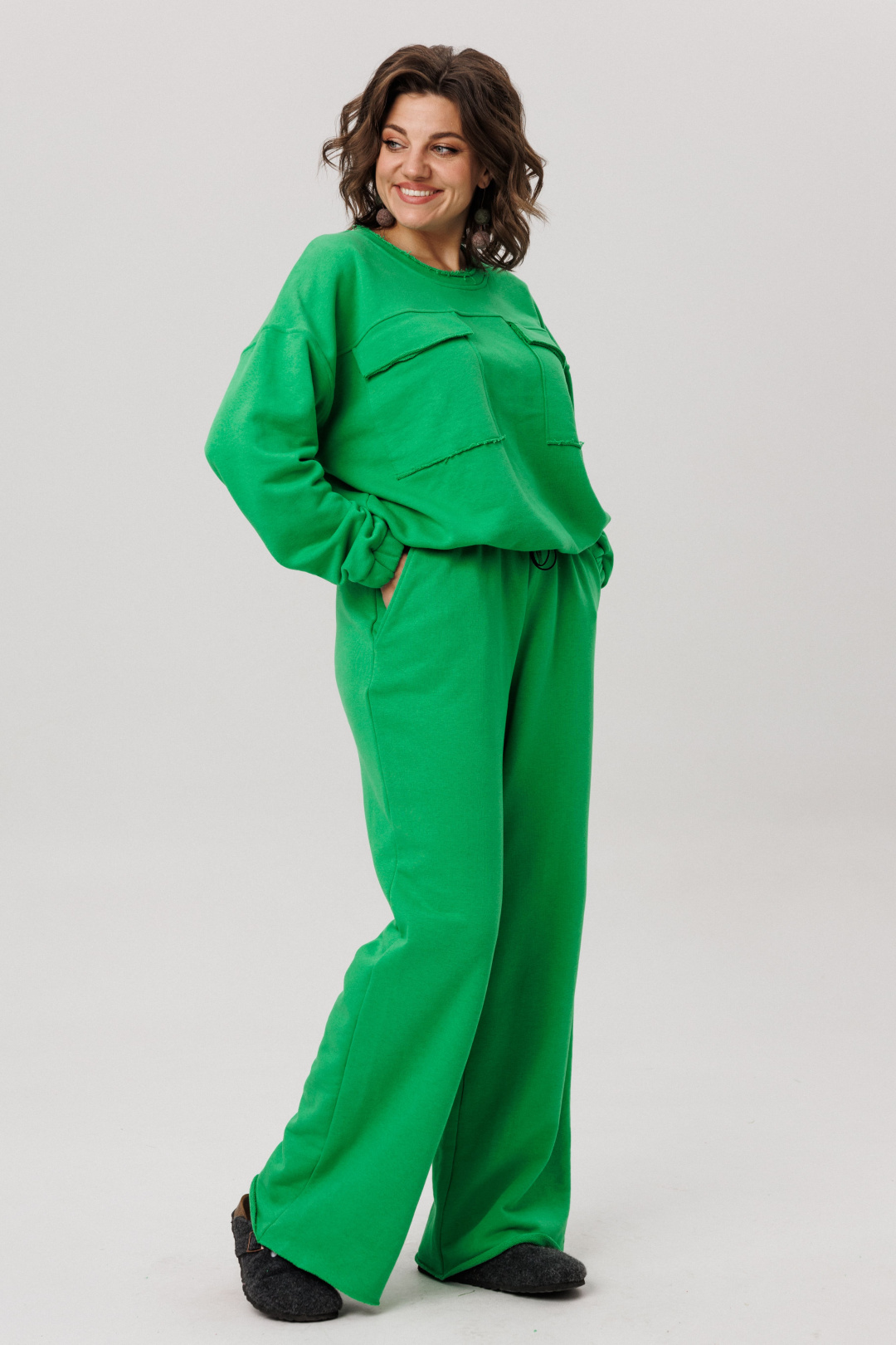 Верхняя часть костюма, выполненная в виде объемного свитшота, представляет собой мастерское сочетание расслабленных линий и продуманных деталей. Удлиненная линия плеча и длинные рукава струятся мягкими складками, завершаясь аккуратной манжетой. Фронтальная часть оформлена изящной отрезной кокеткой, а накладные карманы с клапанами, добавляют образу тактильной выразительности. Низ свитшота, оформленный на кулиске, позволяет вам самостоятельно регулировать степень свободы и объем, делая силуэт именно таким, как вам хочется сегодня.