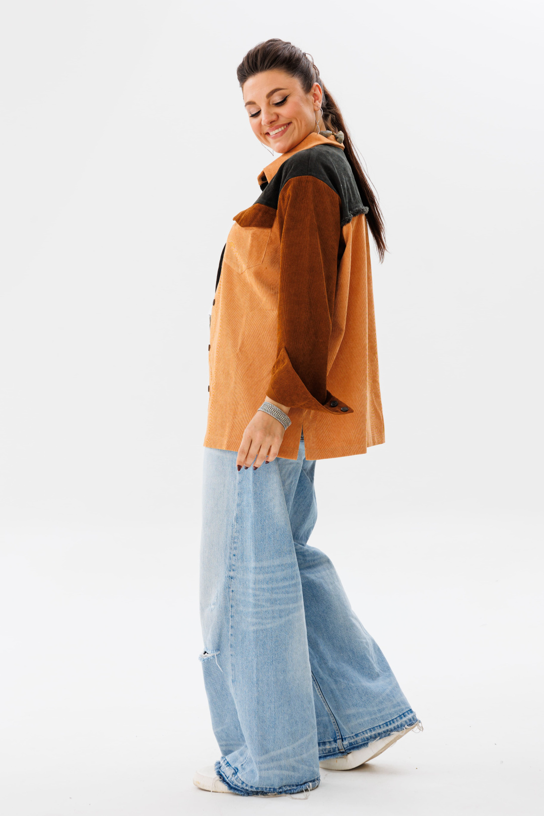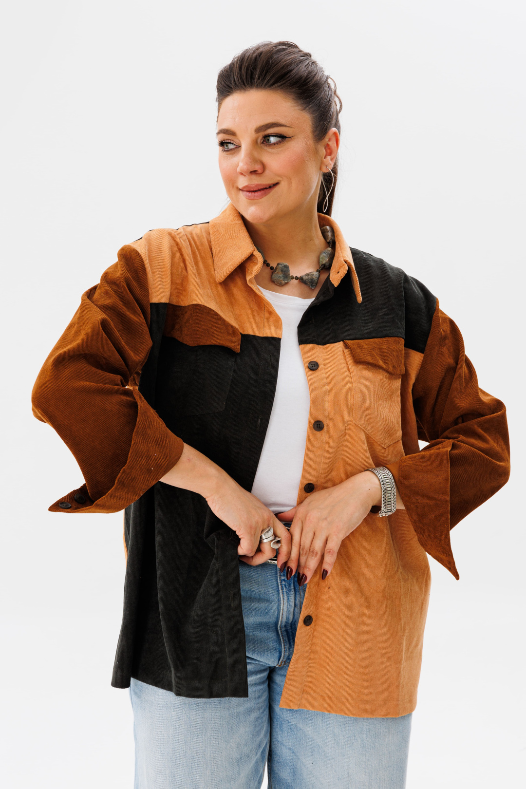 Элементы рубашки сочетаются тремя цветами – это смелое решение, которое даёт возможность собирать образы с любыми вашими вещами!