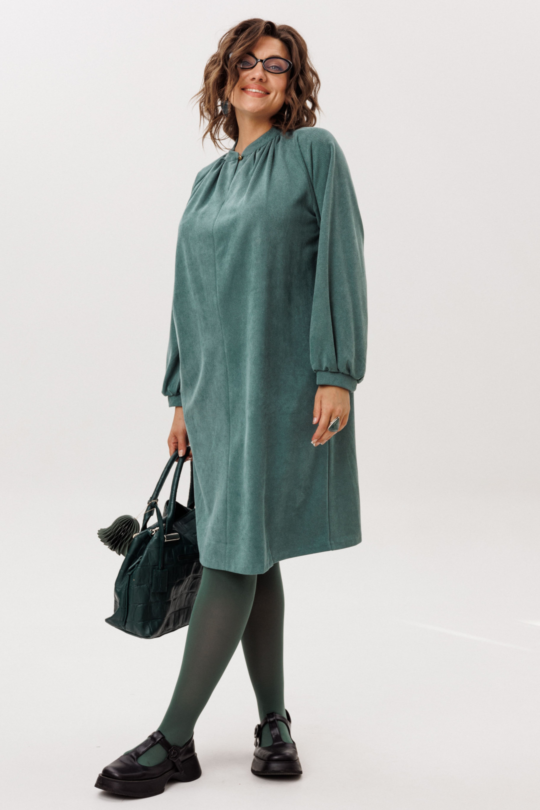 Это платье - образец гармонии, где лаконичный прямой силуэт встречается с нежными романтичными деталями. Его строгие линии смягчаются игристой сборкой у стойки горловины и на длинных рукавах, собранных в изящные манжеты.