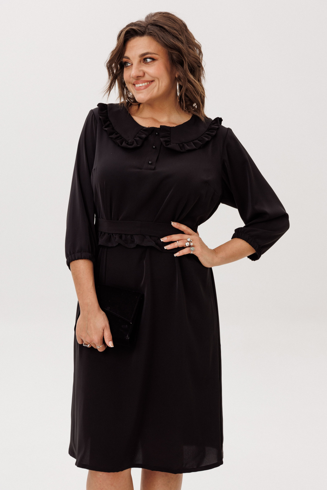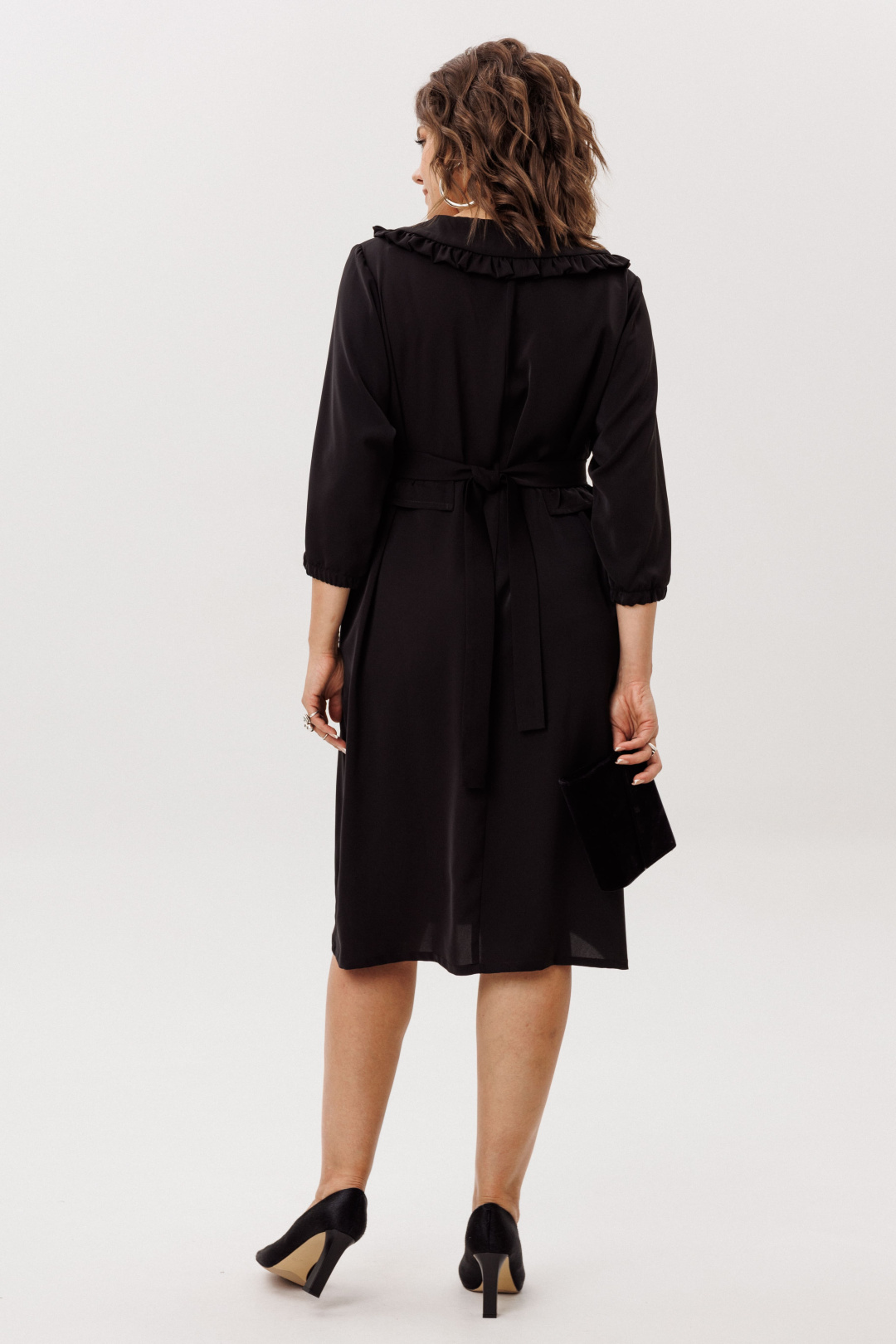 Круглый вырез горловины обработан отложным воротником с рюшем, придающим платью шарм и изысканность.