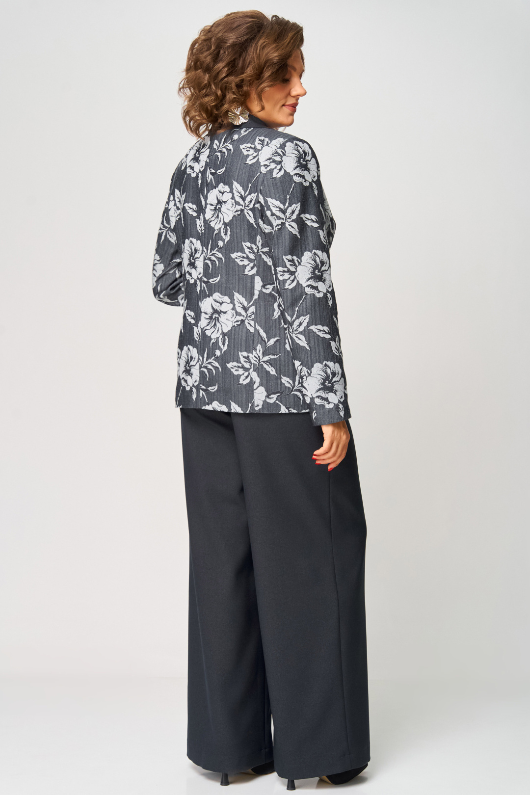Однобортный жакет полуприталенного силуэта, на подкладке, с плечевыми накладками. Воротник пиджачного типа с отложными лацканами. По переду центральная застежка на петли и пуговицы и прорезные карманы с клапаном, талиевые вытачки и рельефы. Низ бортов закругленной формы. Спинка со средним швом и рельефами. Рукав втачной двухшовный длинный.