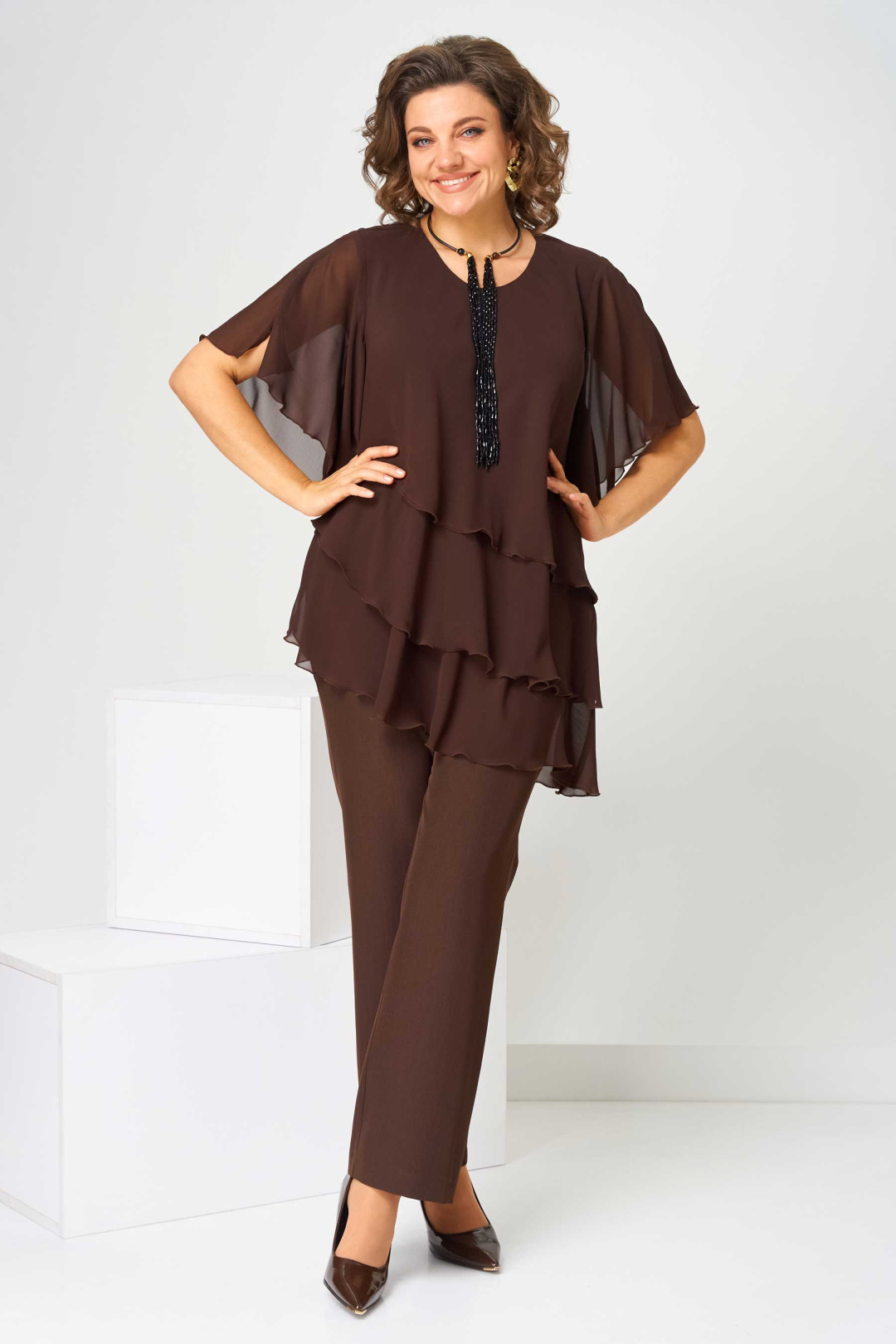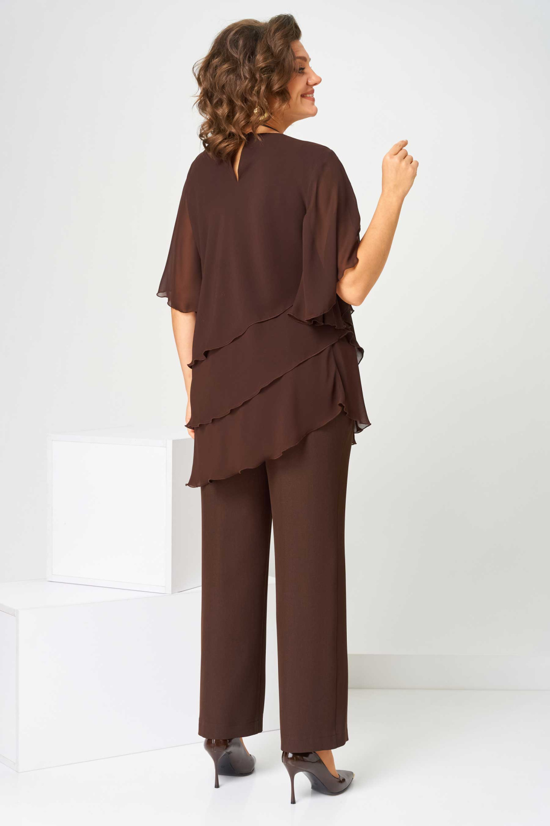 Костюм брючный (двойка) женский свободного силуэта, состоит из блузки и брюк. Блузка с рукавом 3/4 с разрезом и фигурным низом. Изделие (блузка) трехслойное, все слои с асимметричным низом. Застежка-капелька на спинке. Брюки немного расширены к низу, на поясе с резинкой. Застежка на гульфик, на тесьму-молнию.