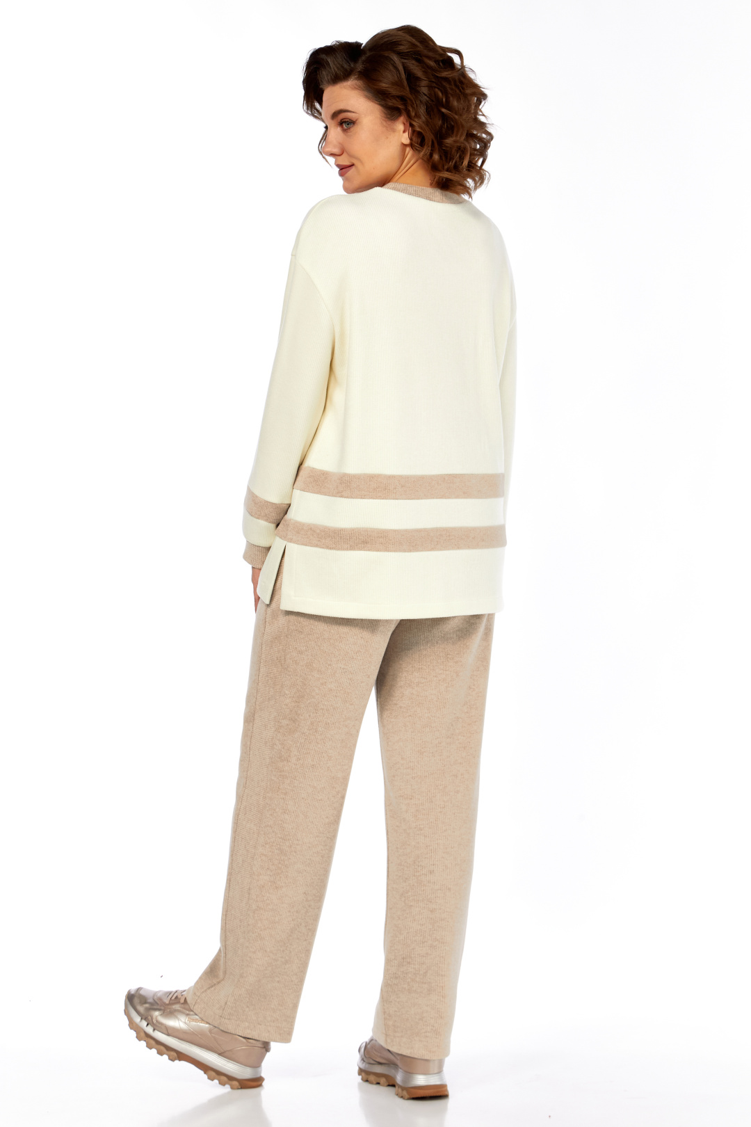 Джемпер прямого силуэта удлинённый с разрезами по бокам. Плечи слегка спущены. Рукава одношовные, длинные, низ на двойных притачных манжетах.Круглый вырез горловины обработан двойной бейкой. Джемпер выполнен из молочного трикотажного полотна в мелкий рубчик со вставками-полосками по переду, спинке и рукавам из трикотажного полотна в цвет брюк. По переду декоративная пластинка.