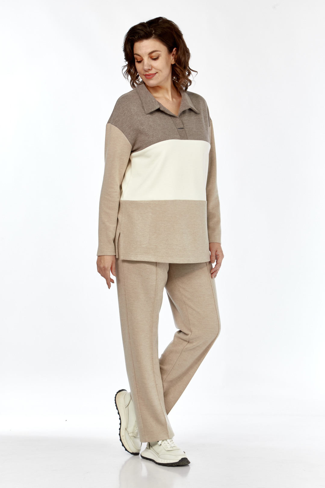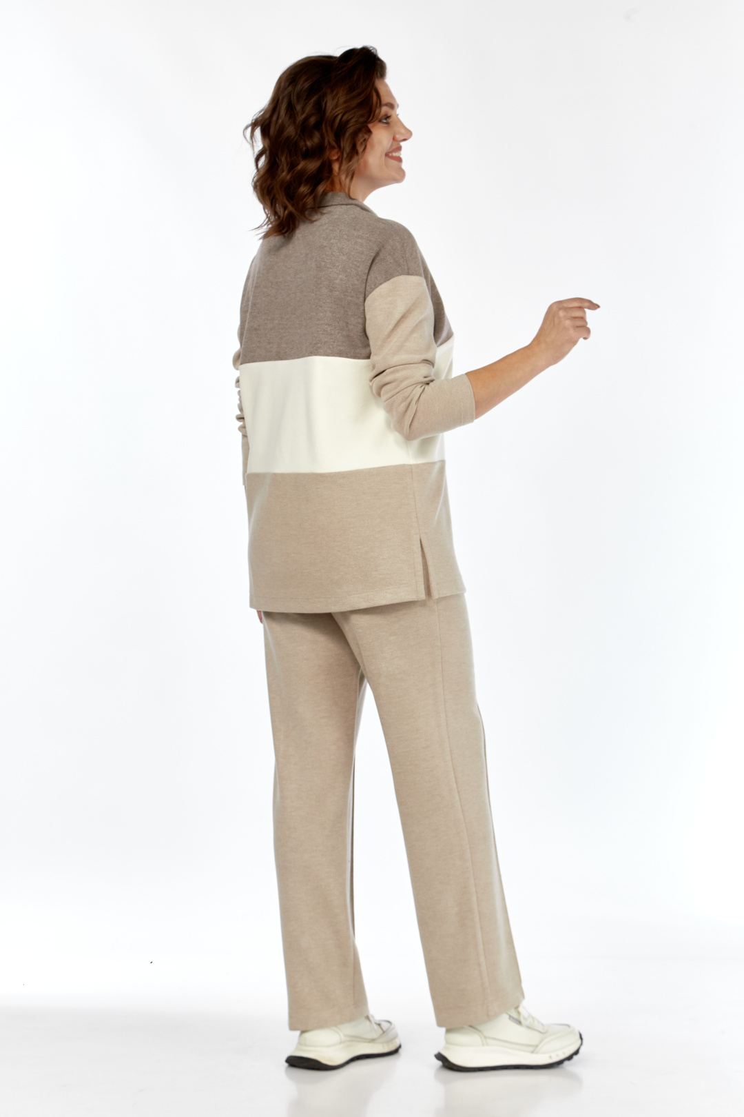 Женский двухпредметный костюм состоит из удлиненного джемпера и брюк, выполнен из трикотажного полотна в мелкий рубчик 3 цветов.