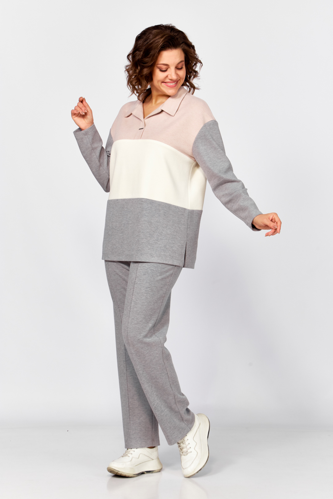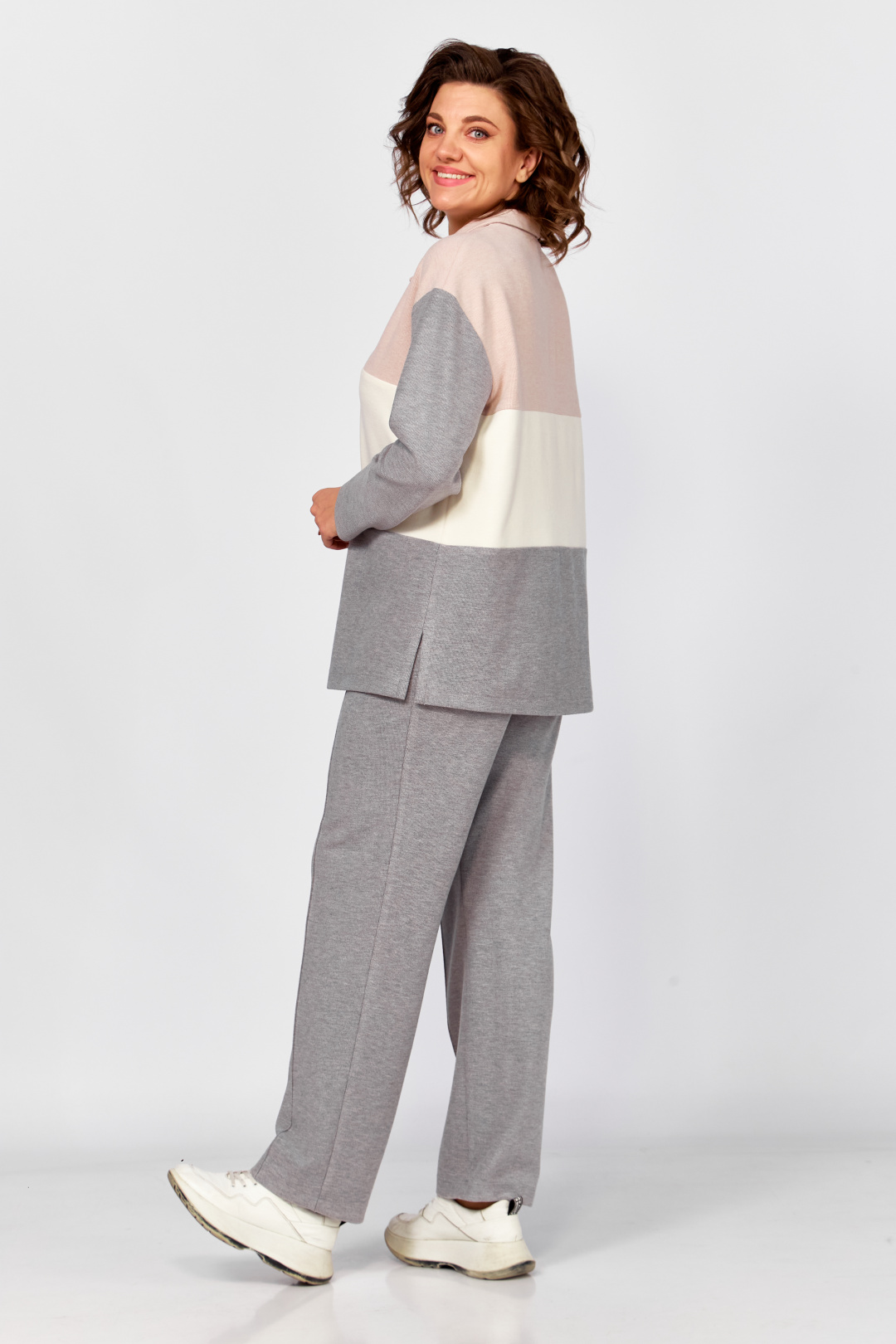 Женский двухпредметный костюм состоит из удлиненного джемпера и брюк, выполнен из трикотажного полотна в мелкий рубчик 3 цветов.