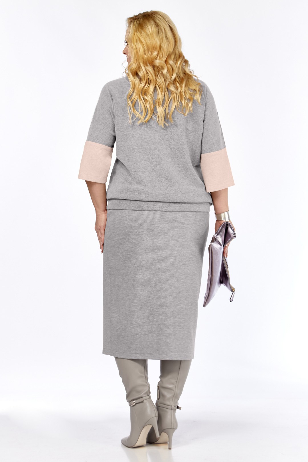 Женский двухпредметный костюм состоит из свободного джемпера и юбки с интригующим разрезом спереди слева.Костюм выполнен из трикотажного полотна в мелкий рубчик ,как вельвет,в 3-х цветах.