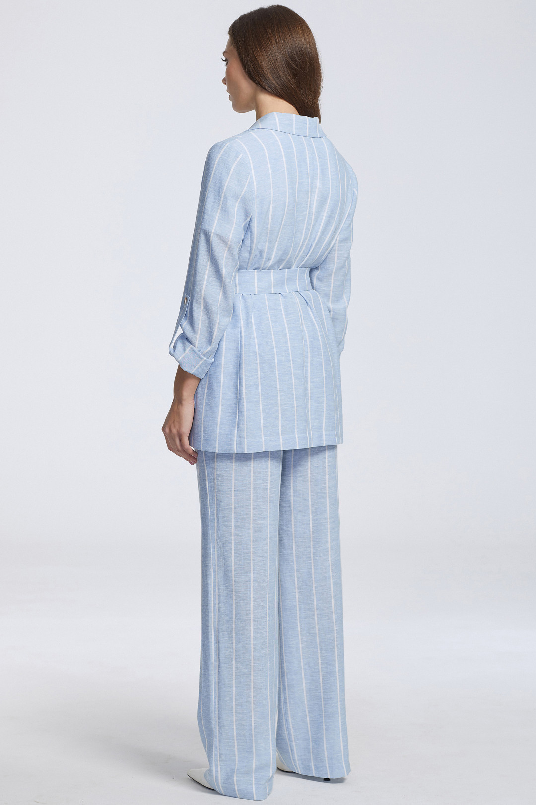 Интересный свободный однобортный жакет в стиле сафари – беспроигрышный вариант, который подружится с любыми вещами. Для пошива модели использовали льняную ткань со стильным дизайном в широкую полоску. Изделие с отложным воротником с широкими лацканами, застёжкой на петлю-пуговицу, с двумя карманами-портфелями с интересными клапанами с патами и отделочными пуговицами. Приталенный силуэт создает широкий длинный пояс с двумя металлическими полукольцами. Жакет выполнен частично на хлопковой подкладке. Рукава втачные длинные, которым при желании можно придать более мягкую форму, присборив на пату с пуговицей.