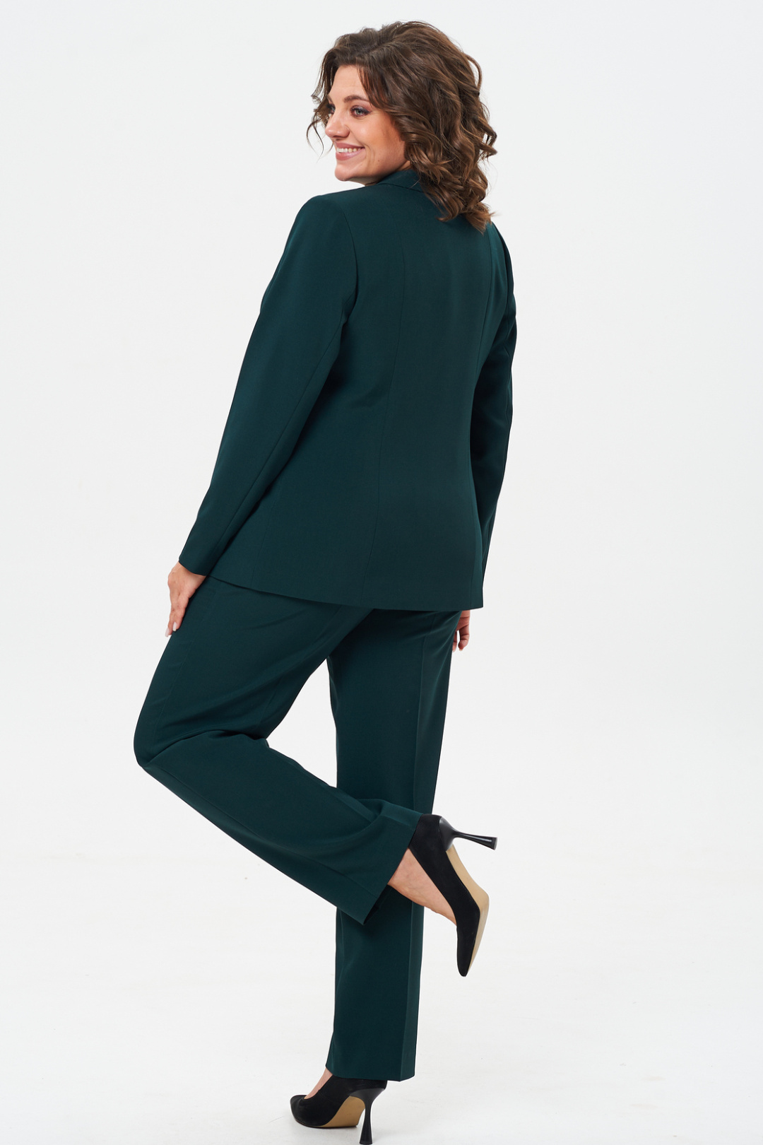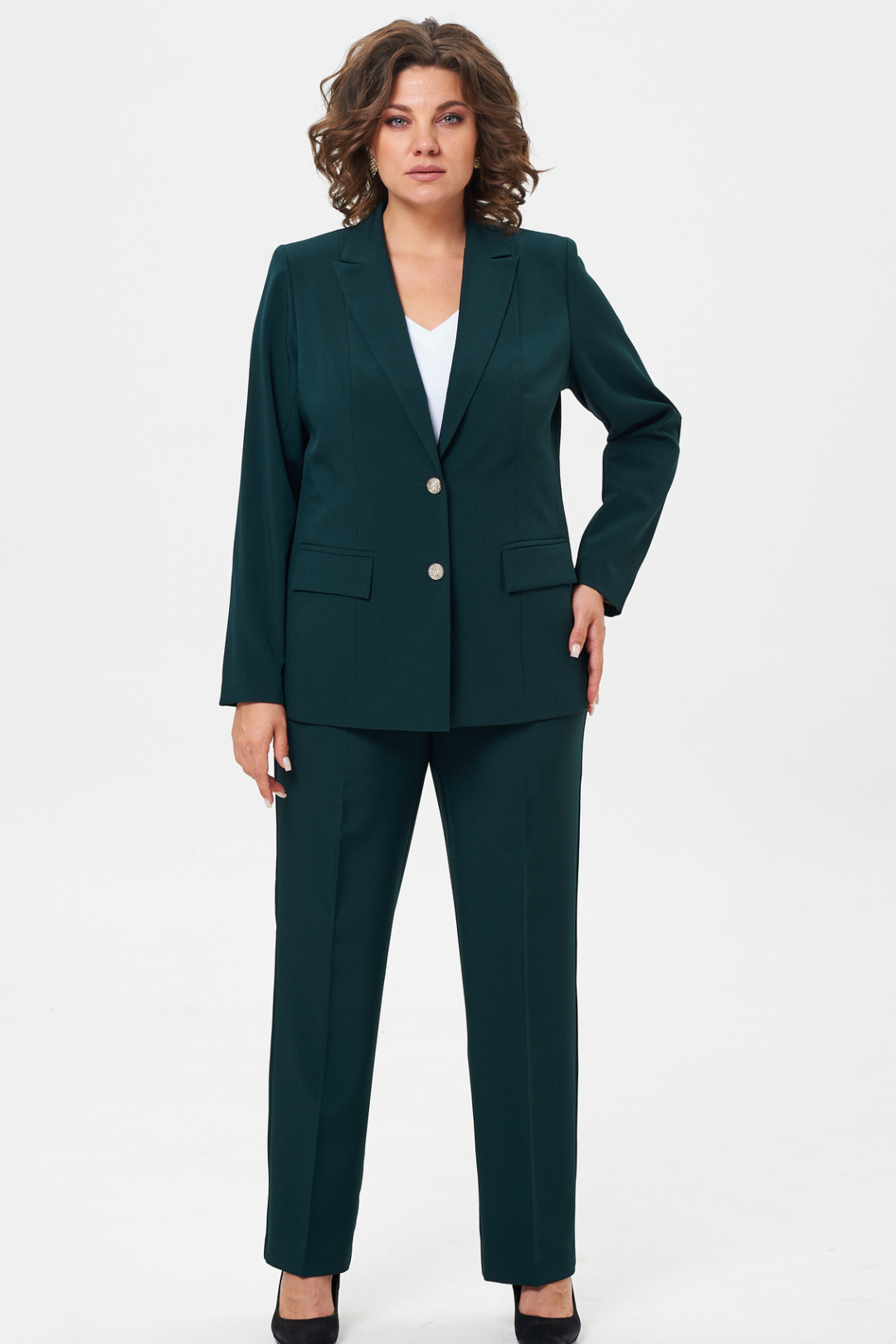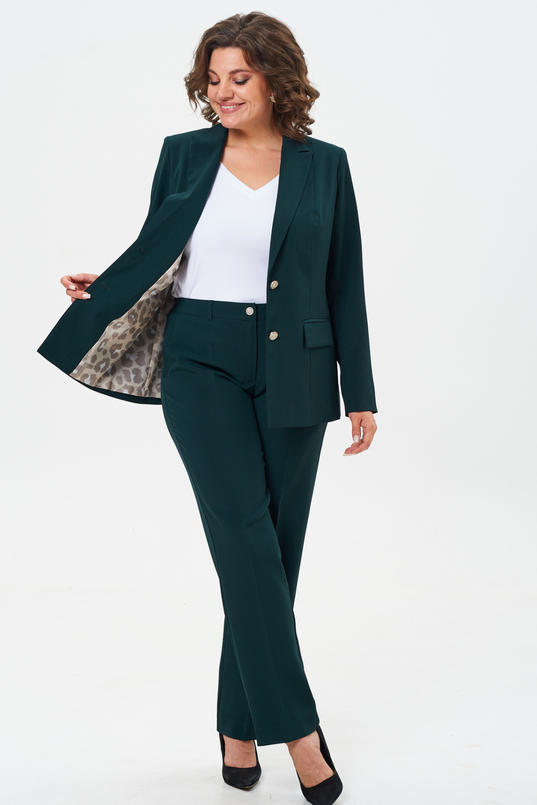 Комплект женский-двойка, из текстильной ткани, жакет удлиненный, полуприлегающего силуэта с центральной бортовой застежкой на пуговицы до линии перегиба лацкана. Спереди рельефные швы от плечевого шва, отрезной бочок и карман с клапаном. Спинка с рельефами от плечевого шва. Рукав втачной, двухшовный. Воротник пиджачного типа. Жакет на подкладке, длина по спинке 67 см, длина рукава 62 см. Брюки прямые, классические, с заутюженными стрелками, по переду обработаны карманы с отрезным бочком, застежка на тесьму-молнию и 1 пуговицу. На задних половинках обработаны вытачки и имитация карманов с листочкой, пояс в брюках притачной, по боковым швам резинка. Длина брюк от талии по боковому шву 103 см.