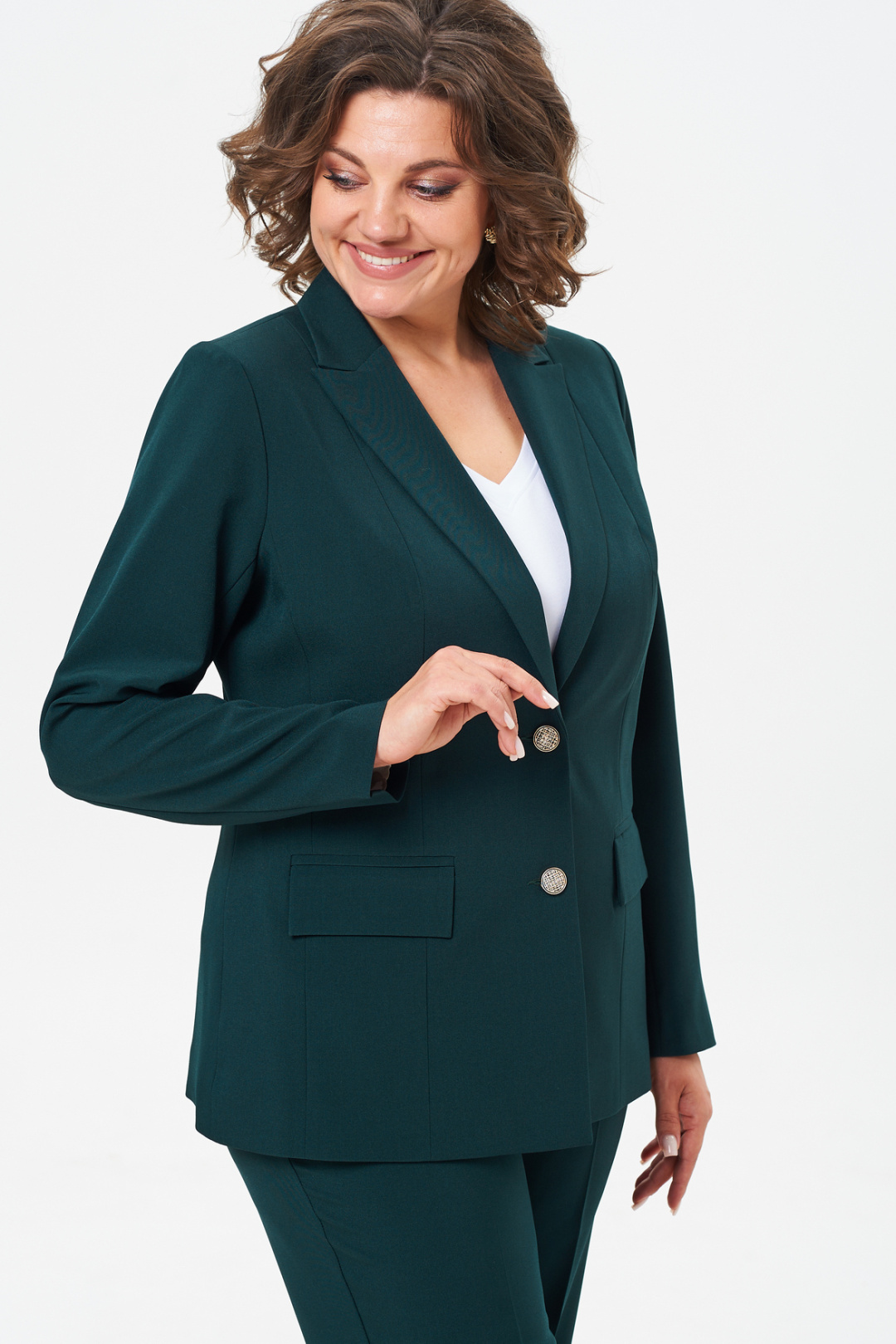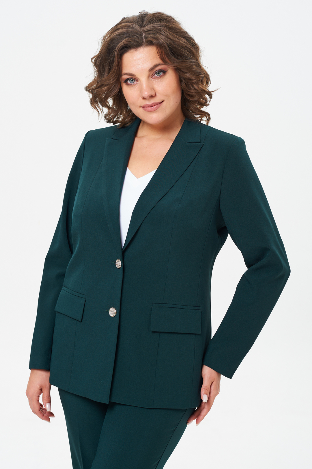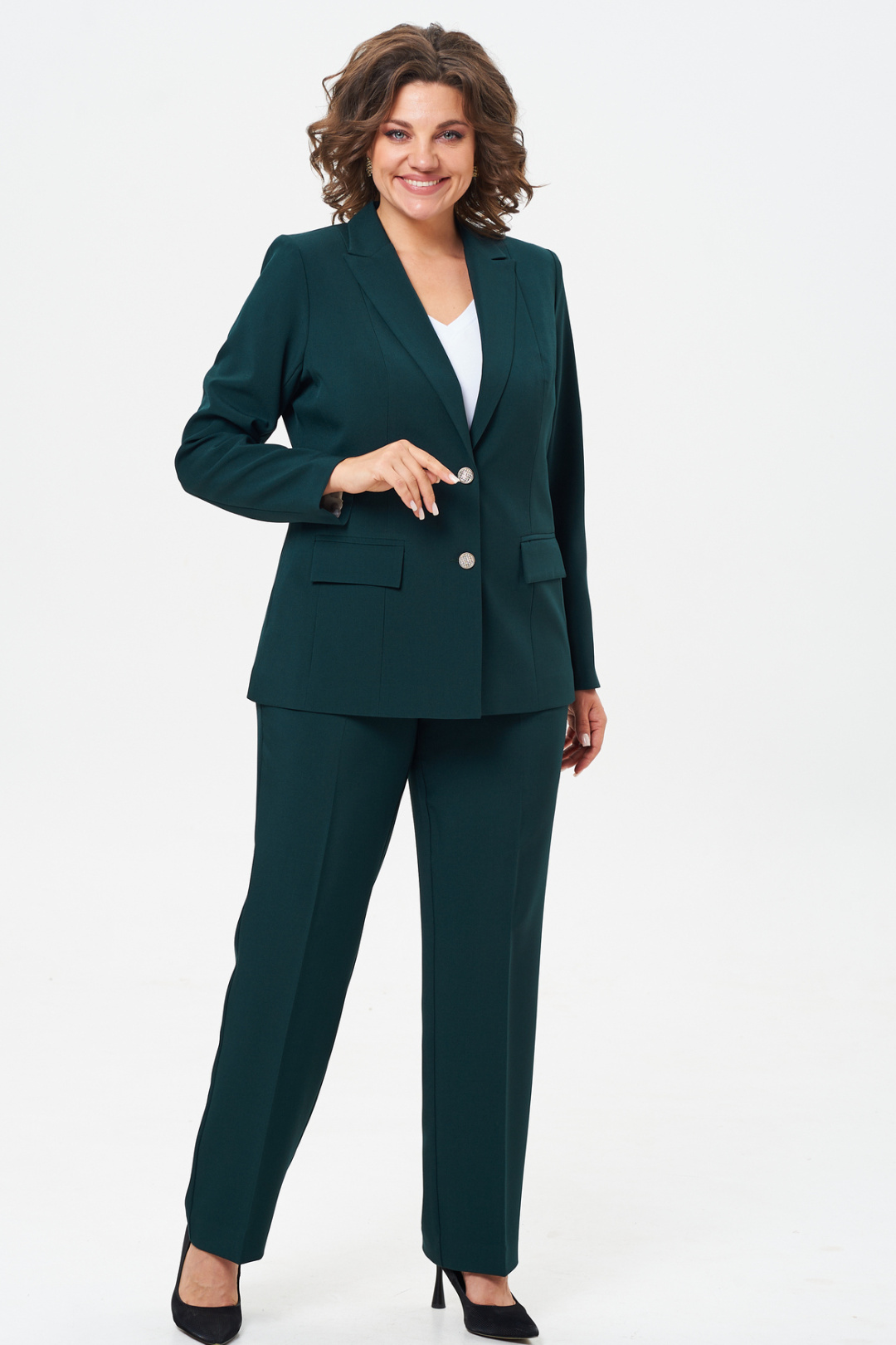 Комплект женский-двойка, из текстильной ткани, жакет удлиненный, полуприлегающего силуэта с центральной бортовой застежкой на пуговицы до линии перегиба лацкана. Спереди рельефные швы от плечевого шва, отрезной бочок и карман с клапаном. Спинка с рельефами от плечевого шва. Рукав втачной, двухшовный. Воротник пиджачного типа. Жакет на подкладке, длина по спинке 67 см, длина рукава 62 см. Брюки прямые, классические, с заутюженными стрелками, по переду обработаны карманы с отрезным бочком, застежка на тесьму-молнию и 1 пуговицу. На задних половинках обработаны вытачки и имитация карманов с листочкой, пояс в брюках притачной, по боковым швам резинка. Длина брюк от талии по боковому шву 103 см.