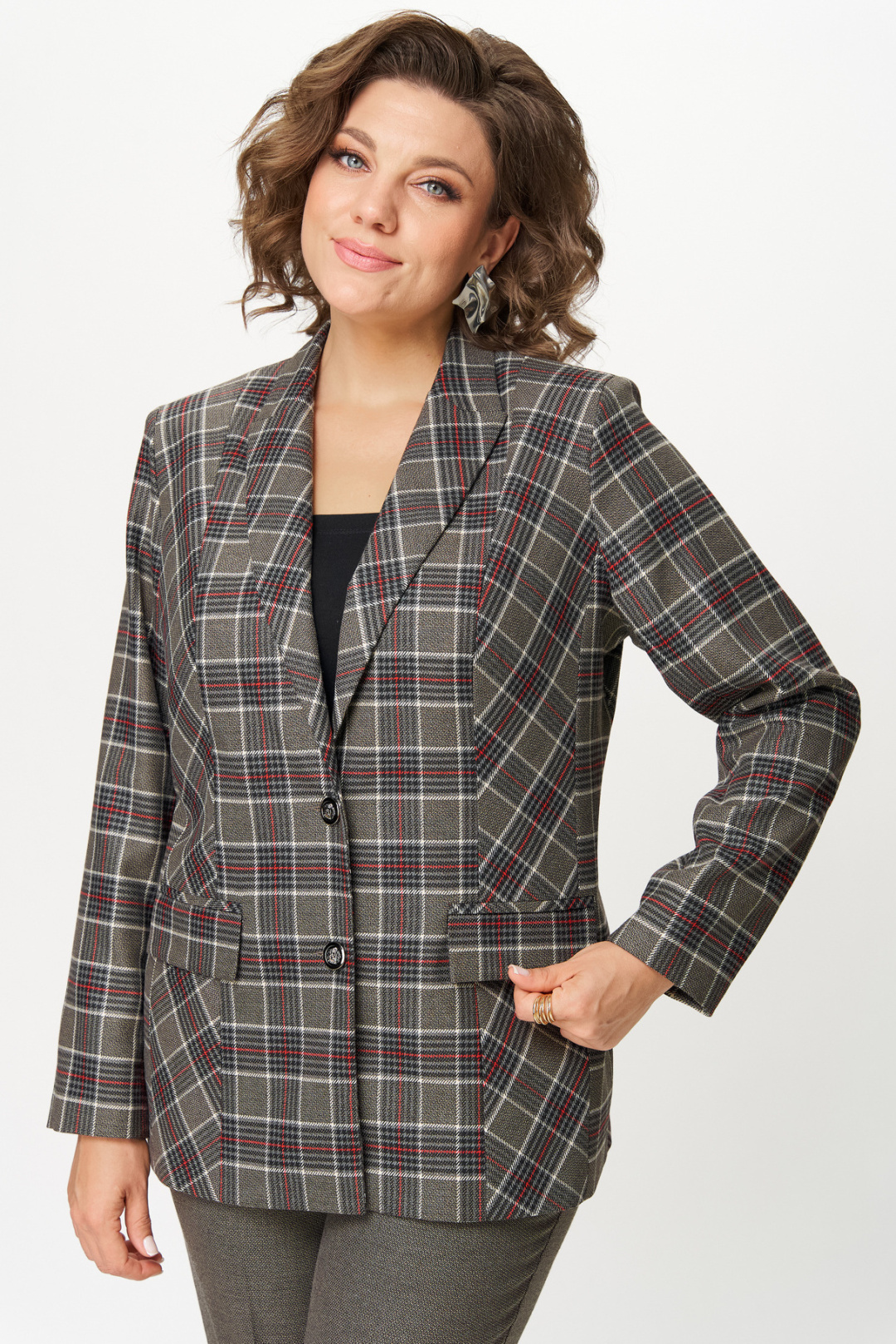 Классический костюм в клетку, идеальный баланс элегантности и стиля. Универсальный крой: Пиджак с пиджачным воротником и прямые брюки создают выигрышный силуэт для любой фигуры. Практичные детали: Карманы с клапанами добавляют костюму солидности и функциональности. Жакет на подкладке, длина по спинке 67 см, длина рукава 62 см. Длина брюк от талии по боковому шву 103 см.