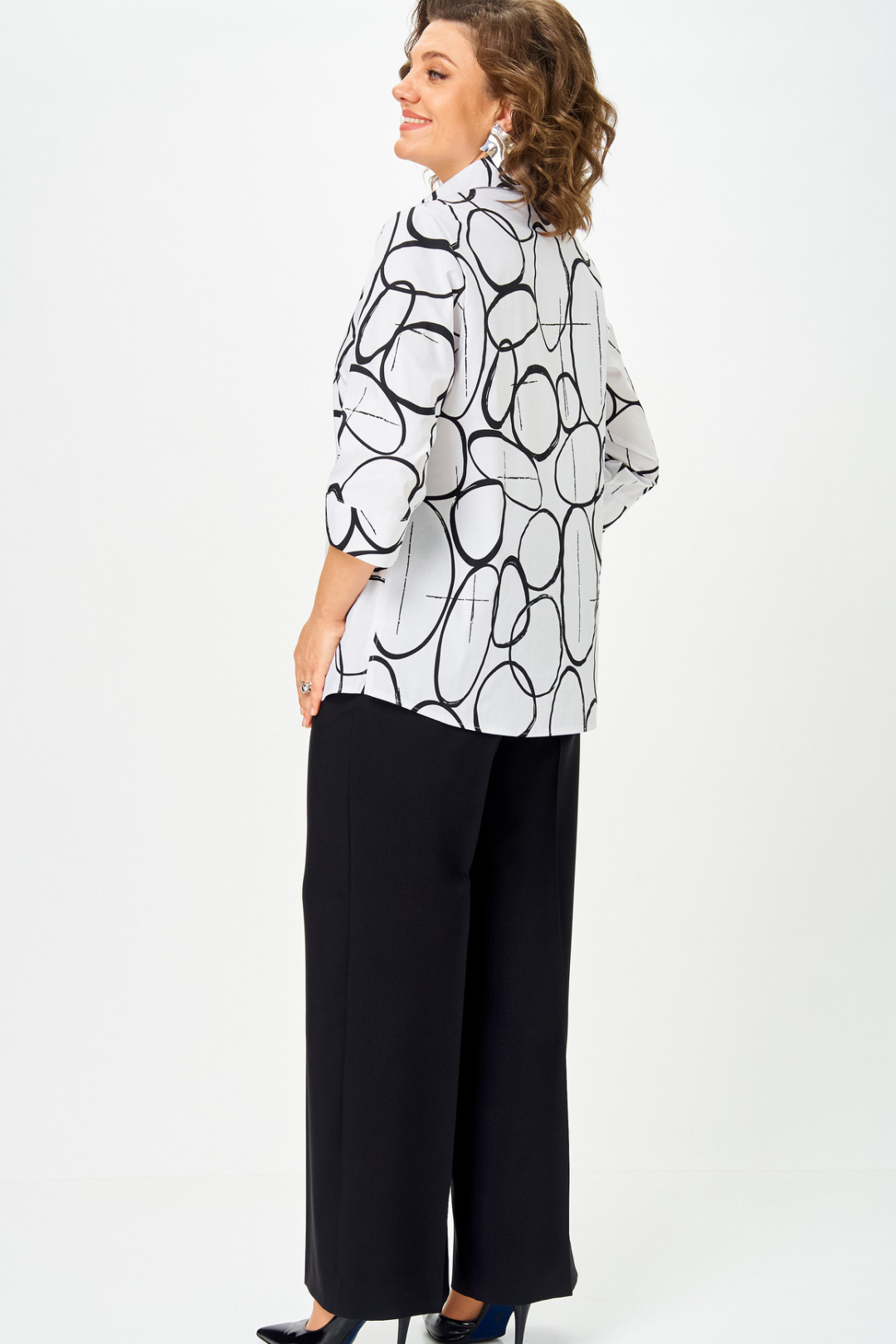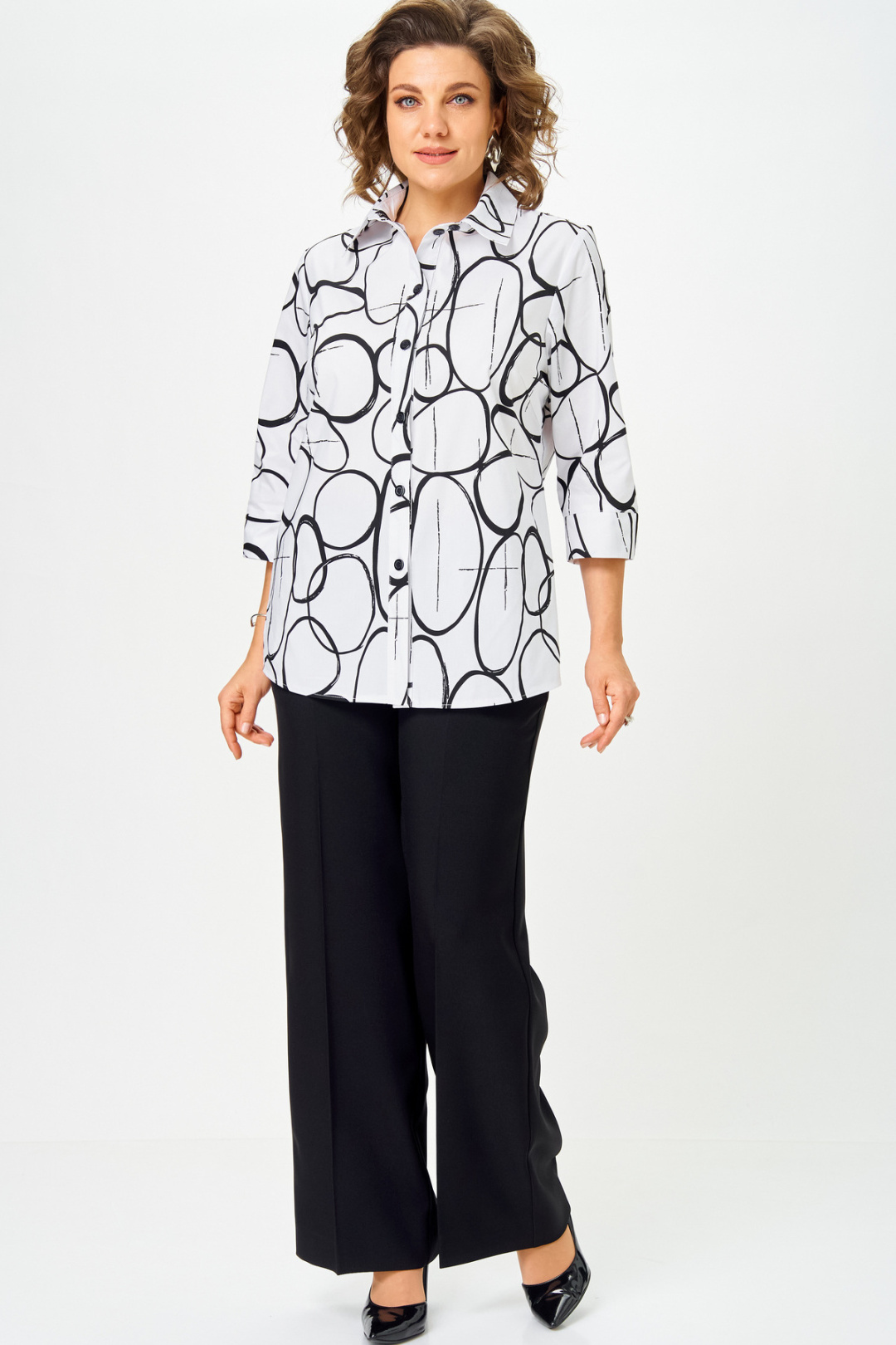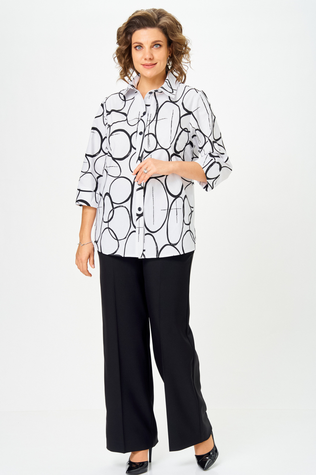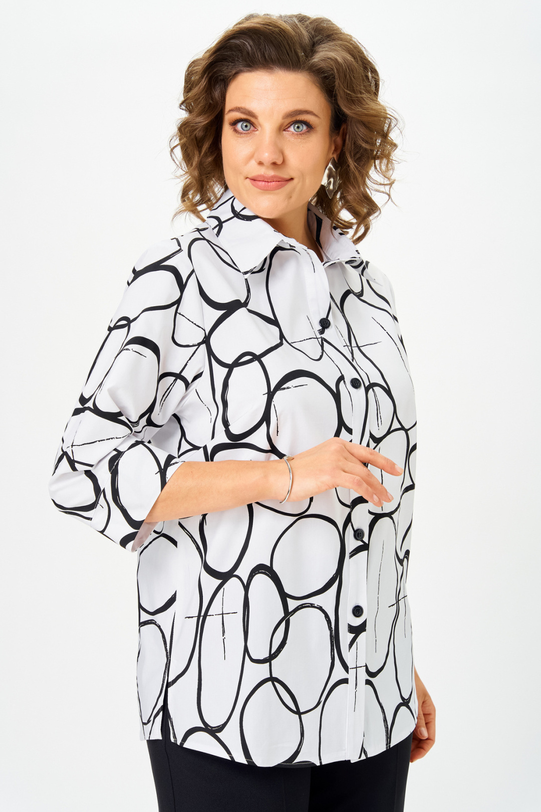 Идеальная блуза для создания стильного базового гардероба.Прямой крой скроет недостатки фигуры и подарит комфорт в течение всего дня. Романтичные рукава 3/4 с манжетами подчеркнут изящество запястий, а элегантный отложной воротник завершит образ. Удобная застежка на пуговицы и боковые разрезы делают блузу невероятно удобной. Длина по спинке 74 см, длина рукава 45.
