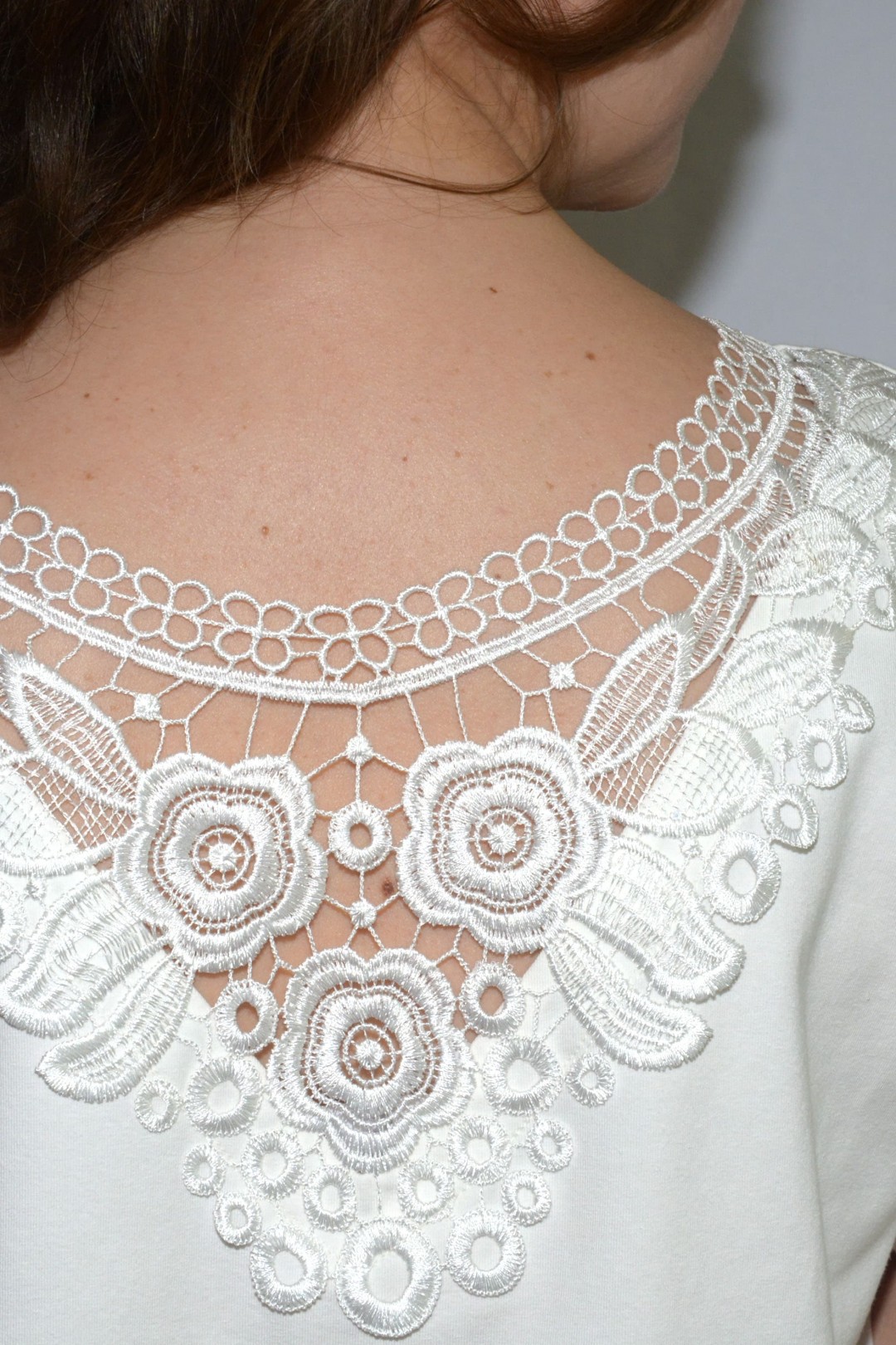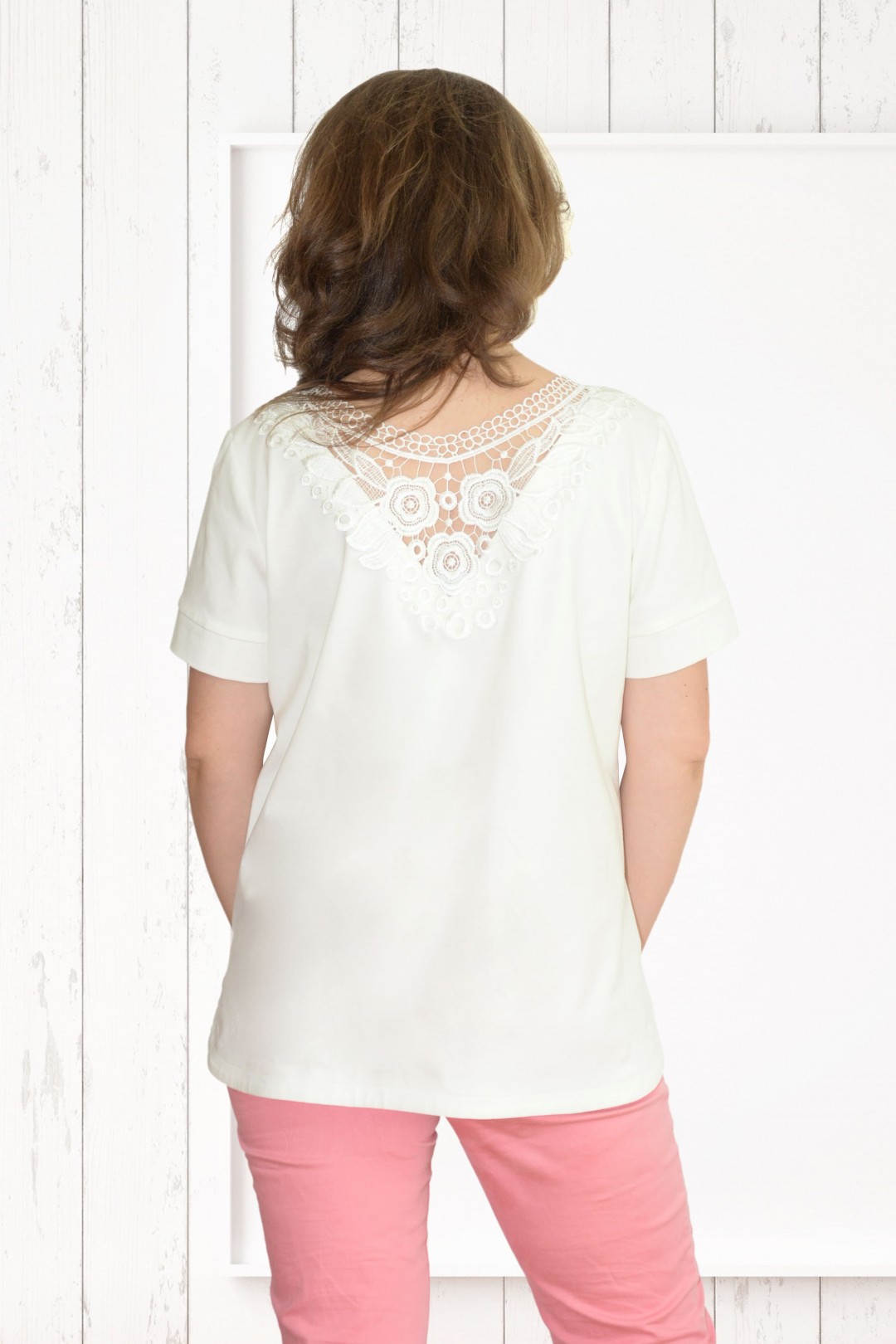 Блузка женская из эластичного трикотажного однотонного полотна, в состав которого входит хлопок. Блузка полуприлегающего силуэта, повседневная, с втачным покроем рукава. Перед с нагрудной вытачкой, идущей от бокового шва. Спинка цельная, длиннее переда, с настроченной по горловине кружевной аппликацией. Низ изделия фигурный на обтачке, с закруглениями к боковому шву. Рукава втачные одношовные, длиной выше локтя, с притачной манжетой. Овальный вырез горловины полочки и Y-образный вырез горловины спинки обработан обтачкой, которая закреплена отделочной строчкой.